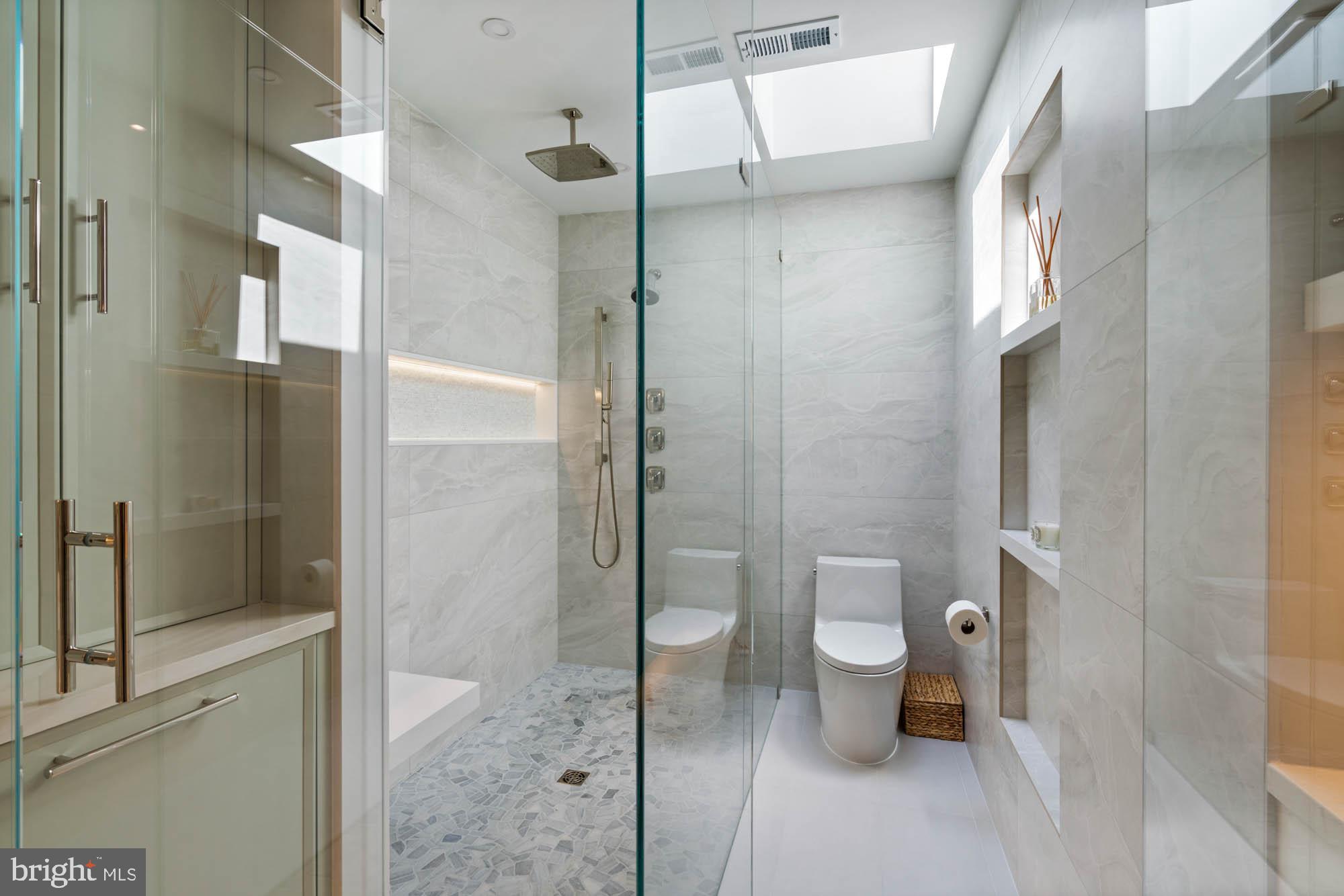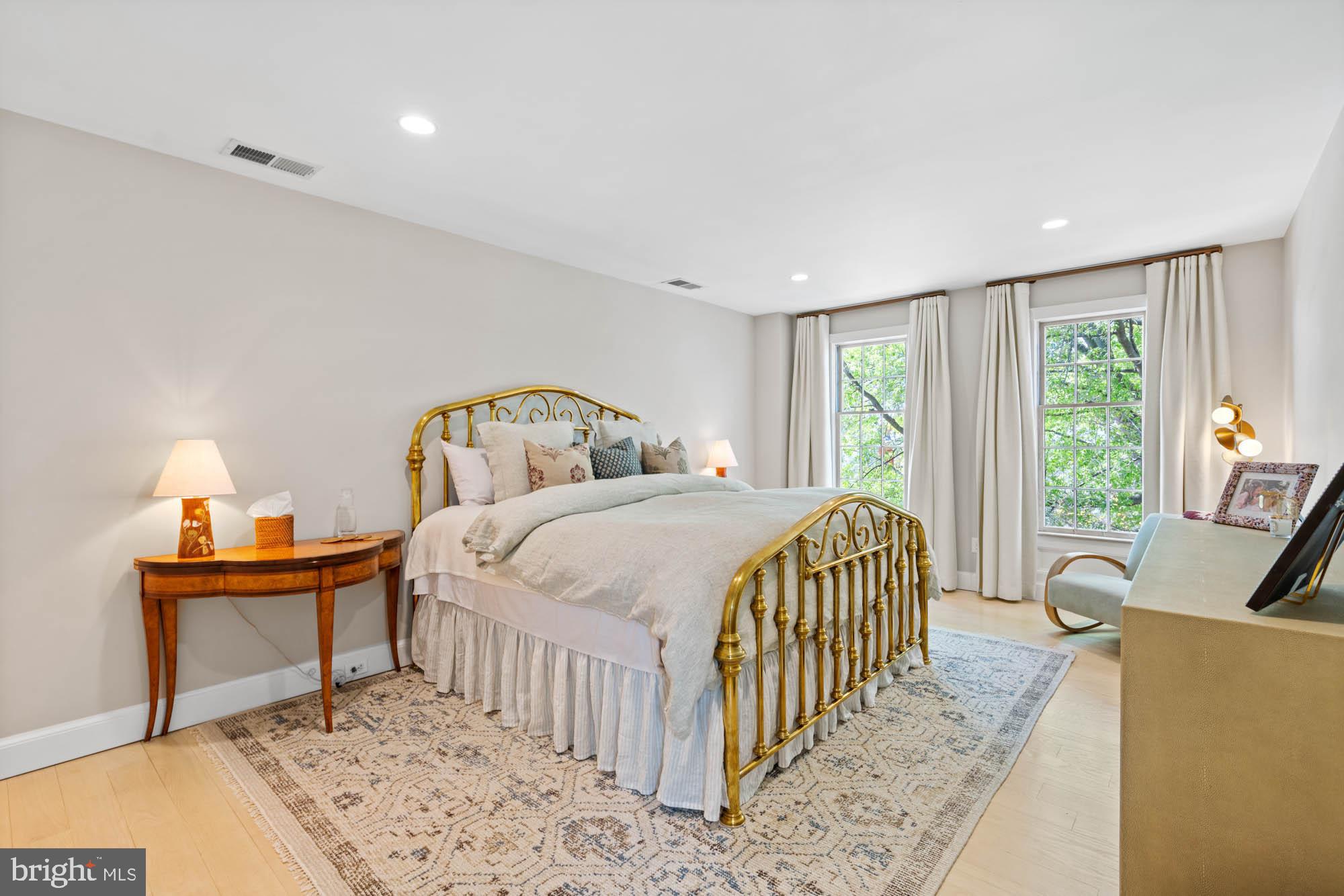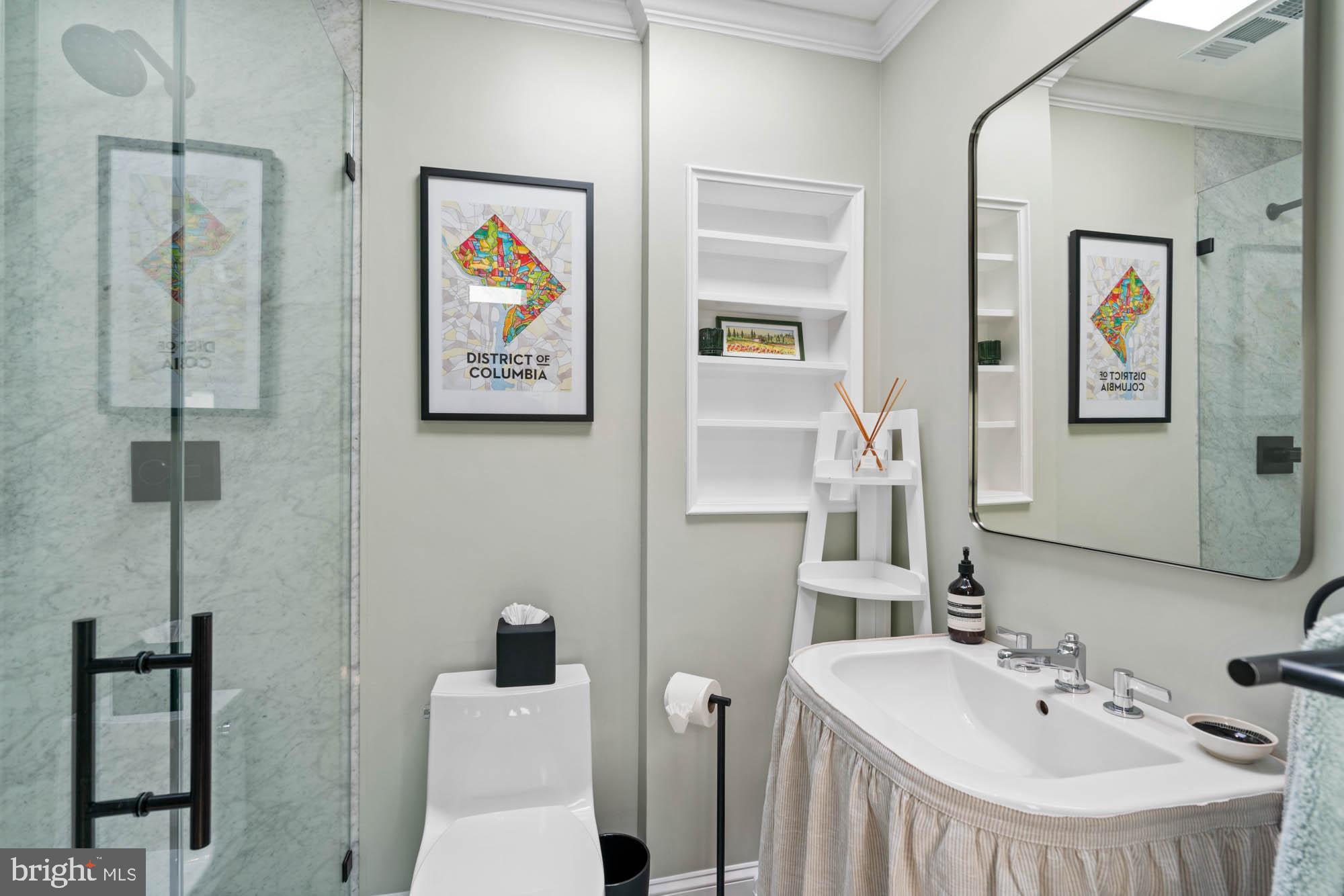 The third floor features a luxurious primary suite with lime-washed detail and views of the Washington Monument. It includes a generously sized walk-in closet and a recently completed Jennifer Gilmer spa-inspired bathroom with a dual vanity, custom lighting, ample cabinetry, and a multi-function frameless glass shower. Two additional guest bedrooms and a well-appointed hall bath complete the upper level.