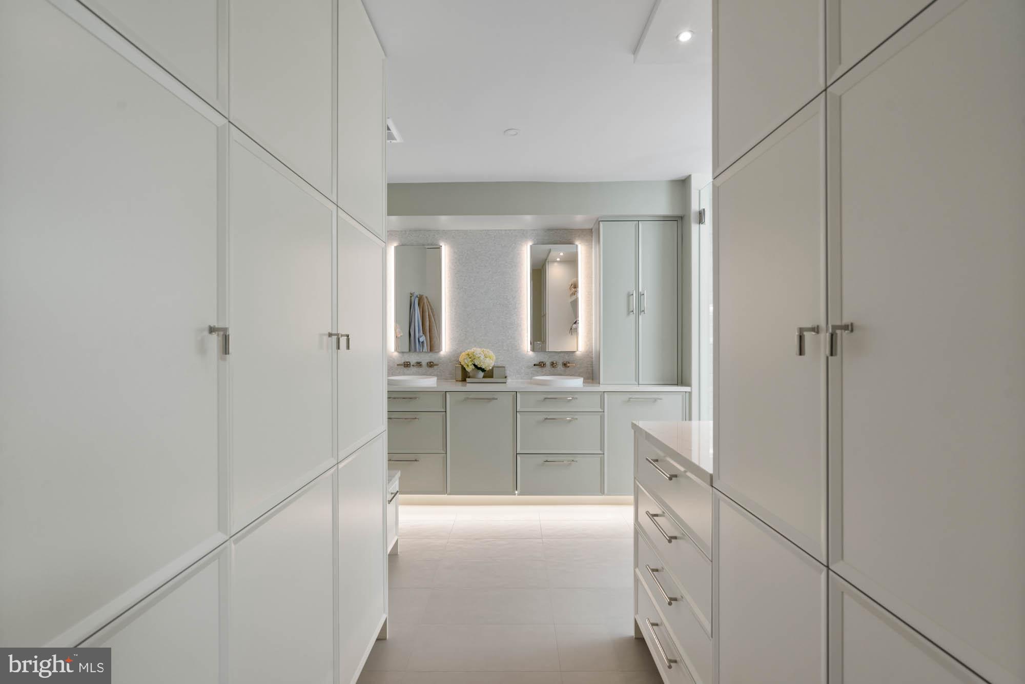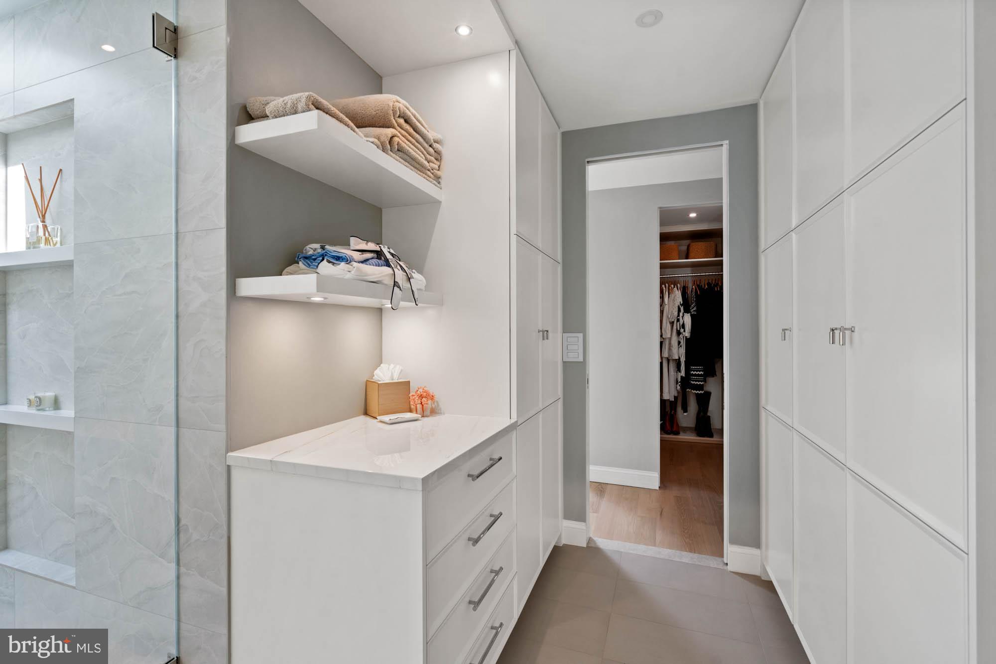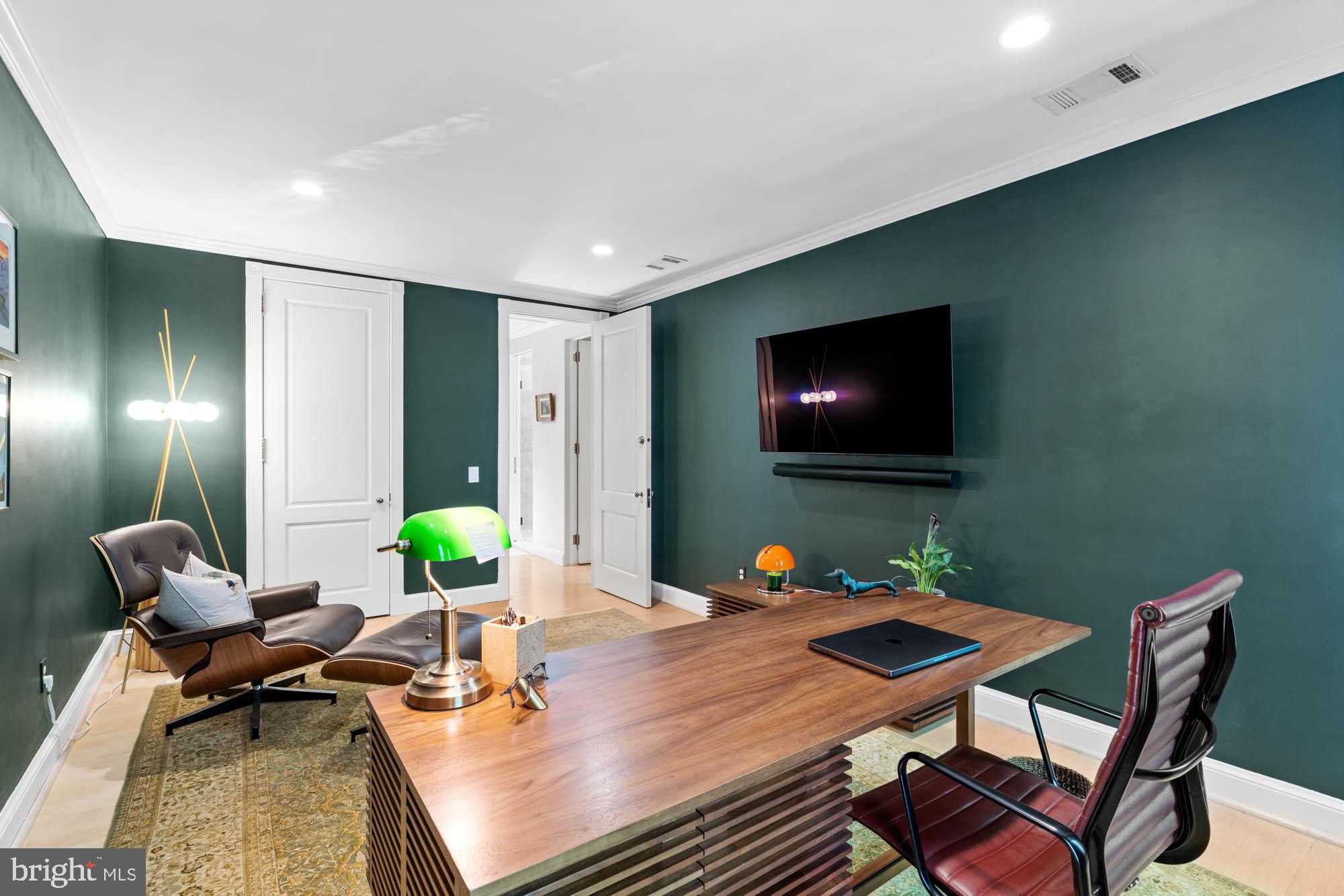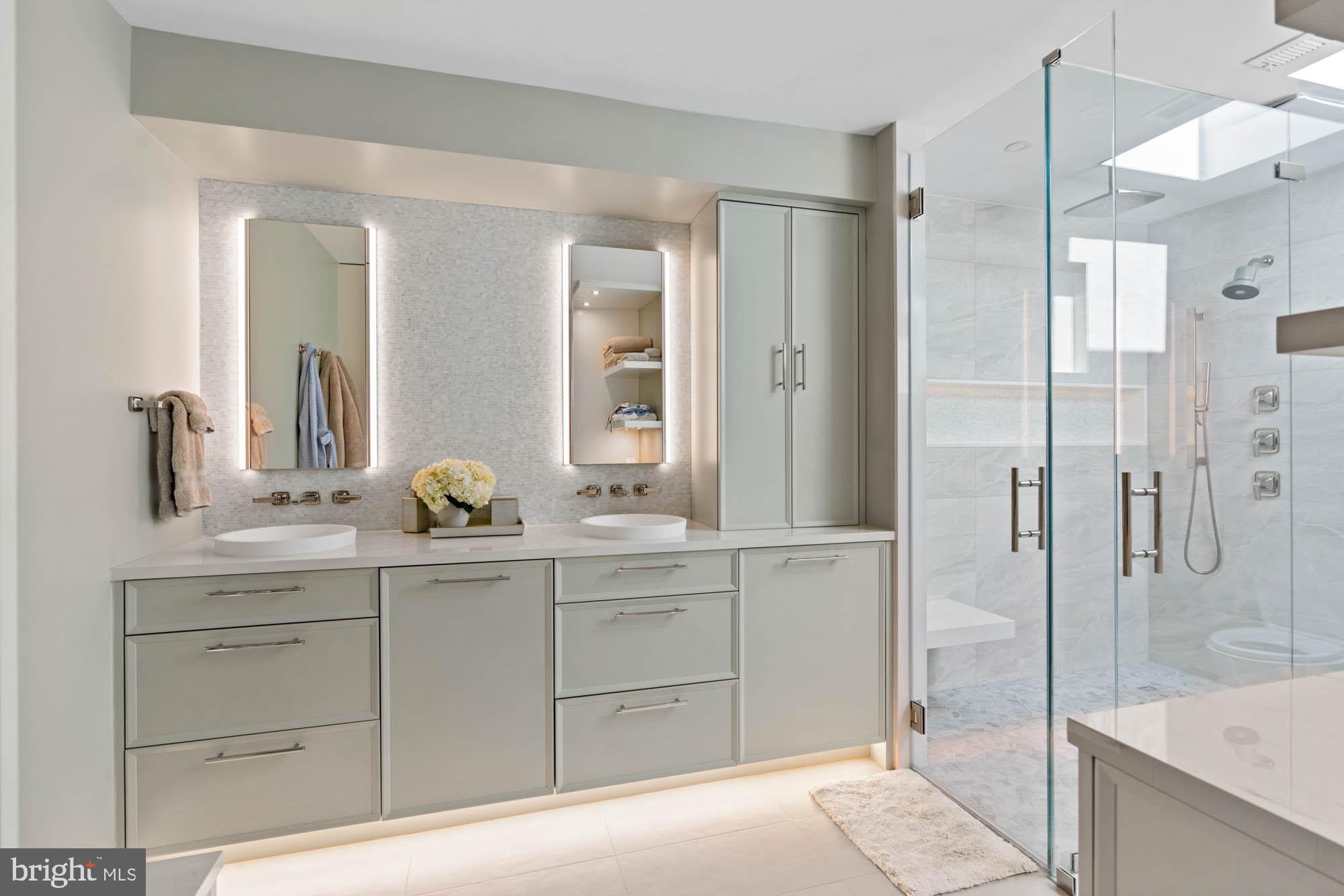 The third floor features a luxurious primary suite with lime-washed detail and views of the Washington Monument. It includes a generously sized walk-in closet and a recently completed Jennifer Gilmer spa-inspired bathroom with a dual vanity, custom lighting, ample cabinetry, and a multi-function frameless glass shower. Two additional guest bedrooms and a well-appointed hall bath complete the upper level.