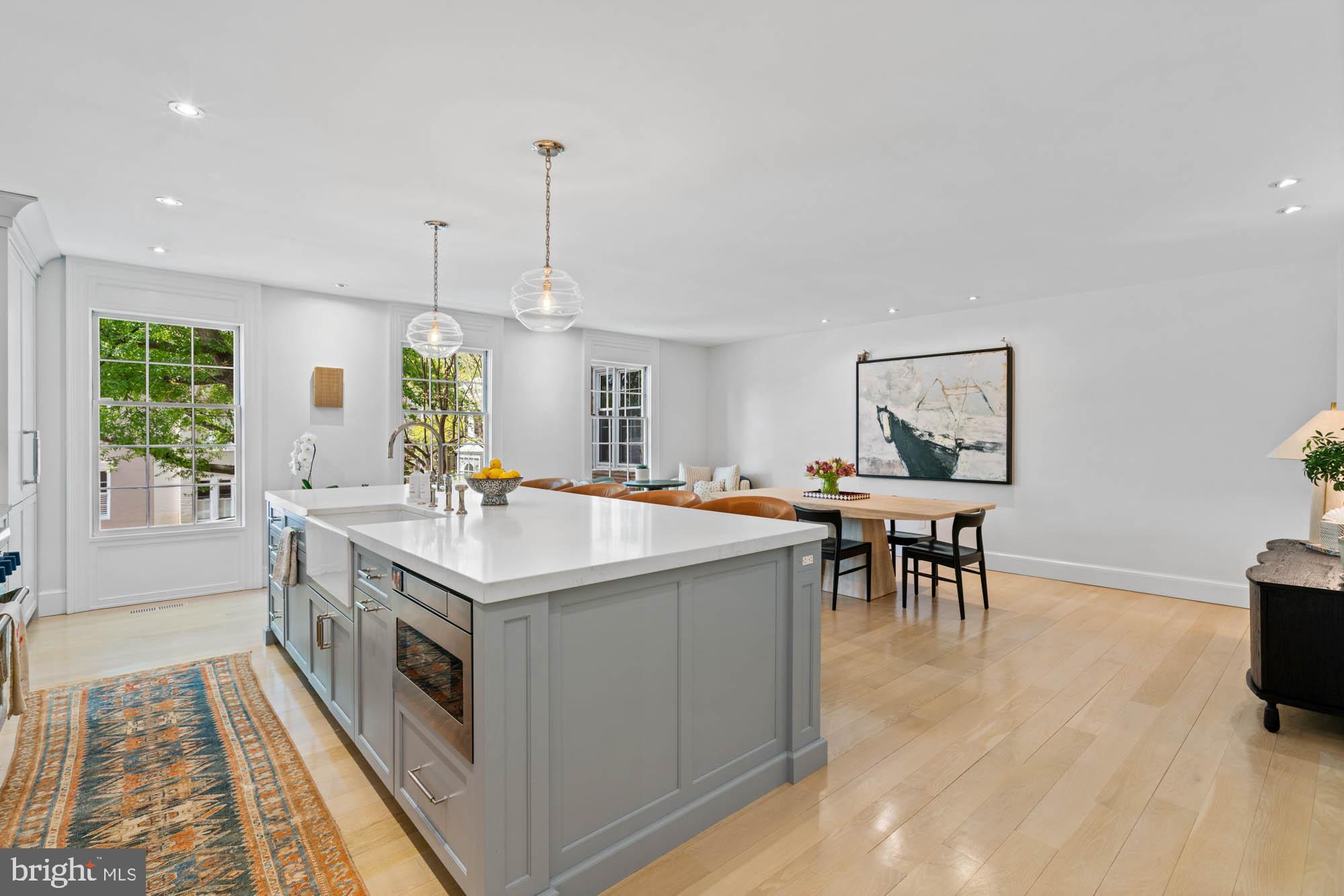Upstairs, the second floor has been reimagined by architect Christian Zapatka to create an open, flowing layout with impressive proportions. The formal living room features soaring 13-foot ceilings, a fireplace framed by decorative alcoves, crown molding, and French doors that overlook the garden, filling the space with natural light. The adjacent kitchen, custom-designed by Jennifer Gilmer, is both sophisticated and highly functional, with handcrafted cabinetry, a large island with a Shaws farmhouse sink, Sub-Zero refrigerator and freezer, and a Thermador double oven. An expansive dining area flows seamlessly from the kitchen, perfectly suited for entertaining.