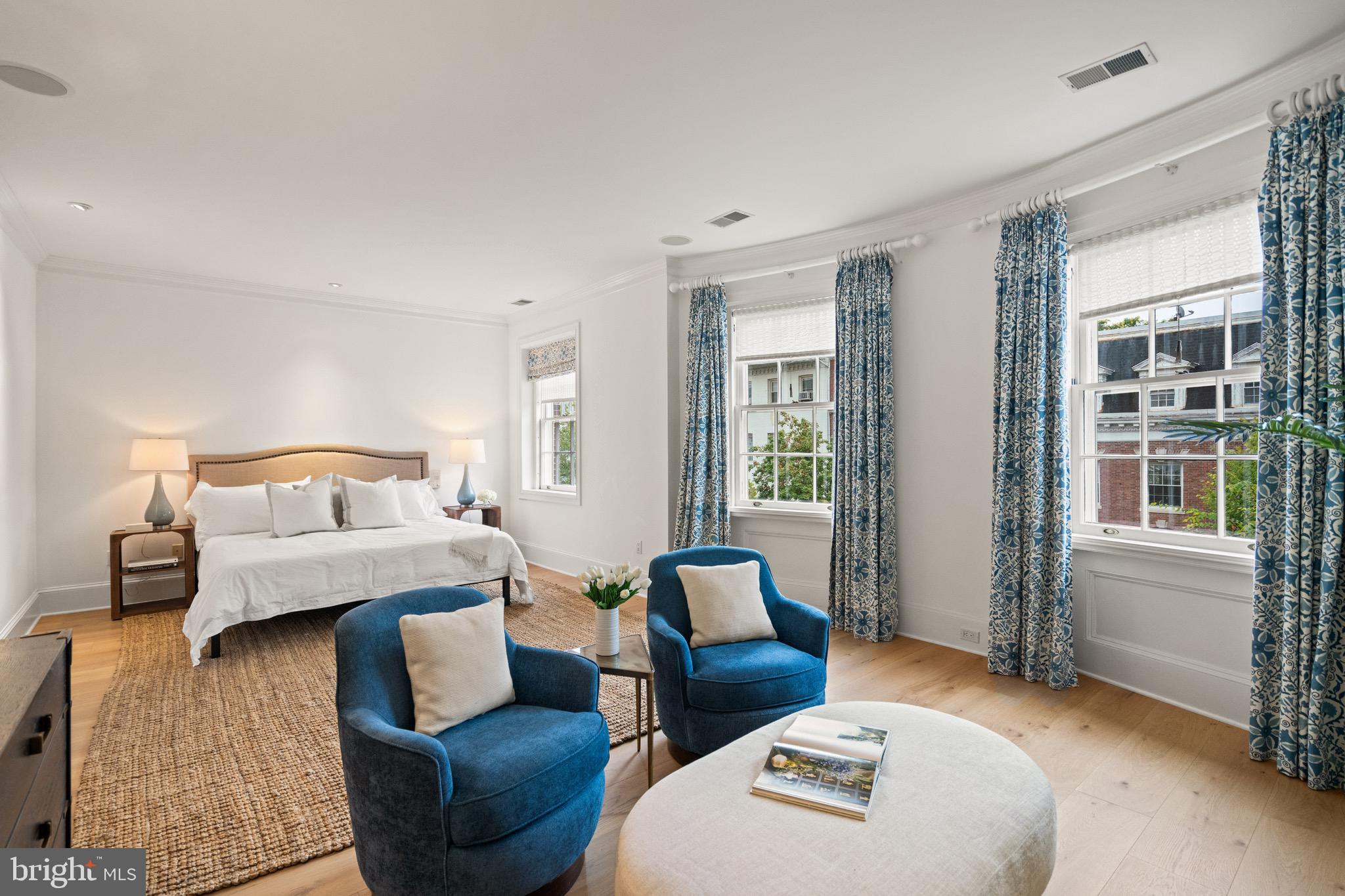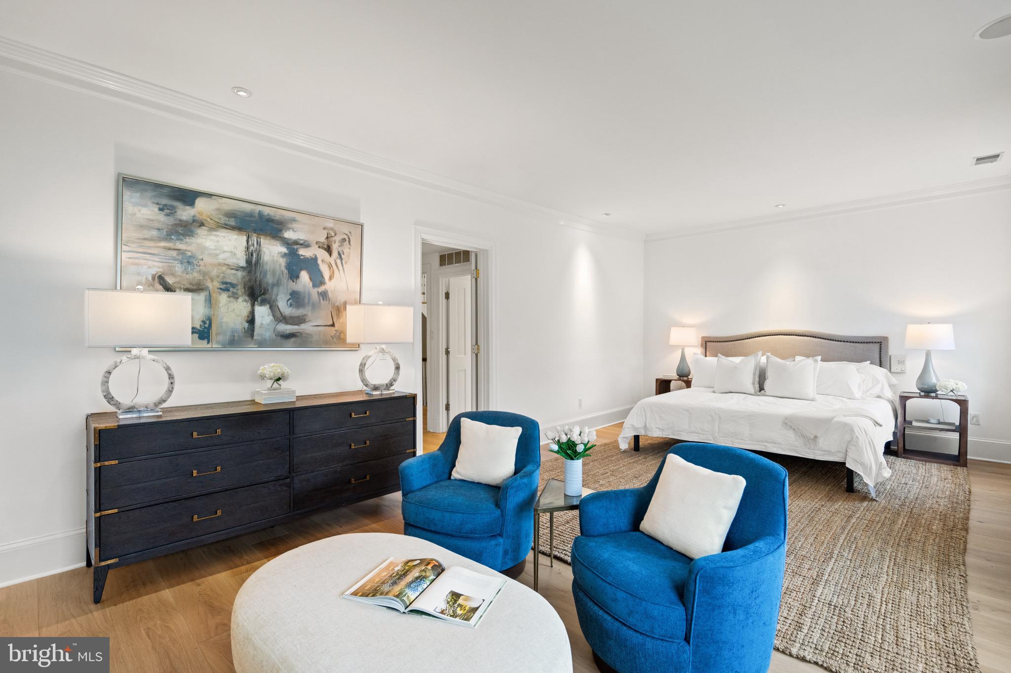 The second floor is devoted to the luxurious primary suite, featuring an oversized bedroom, spa-like bath, dual closets, a private roof deck, and a handsome paneled library. Upstairs, the third floor offers three lovely bedrooms and two full baths.