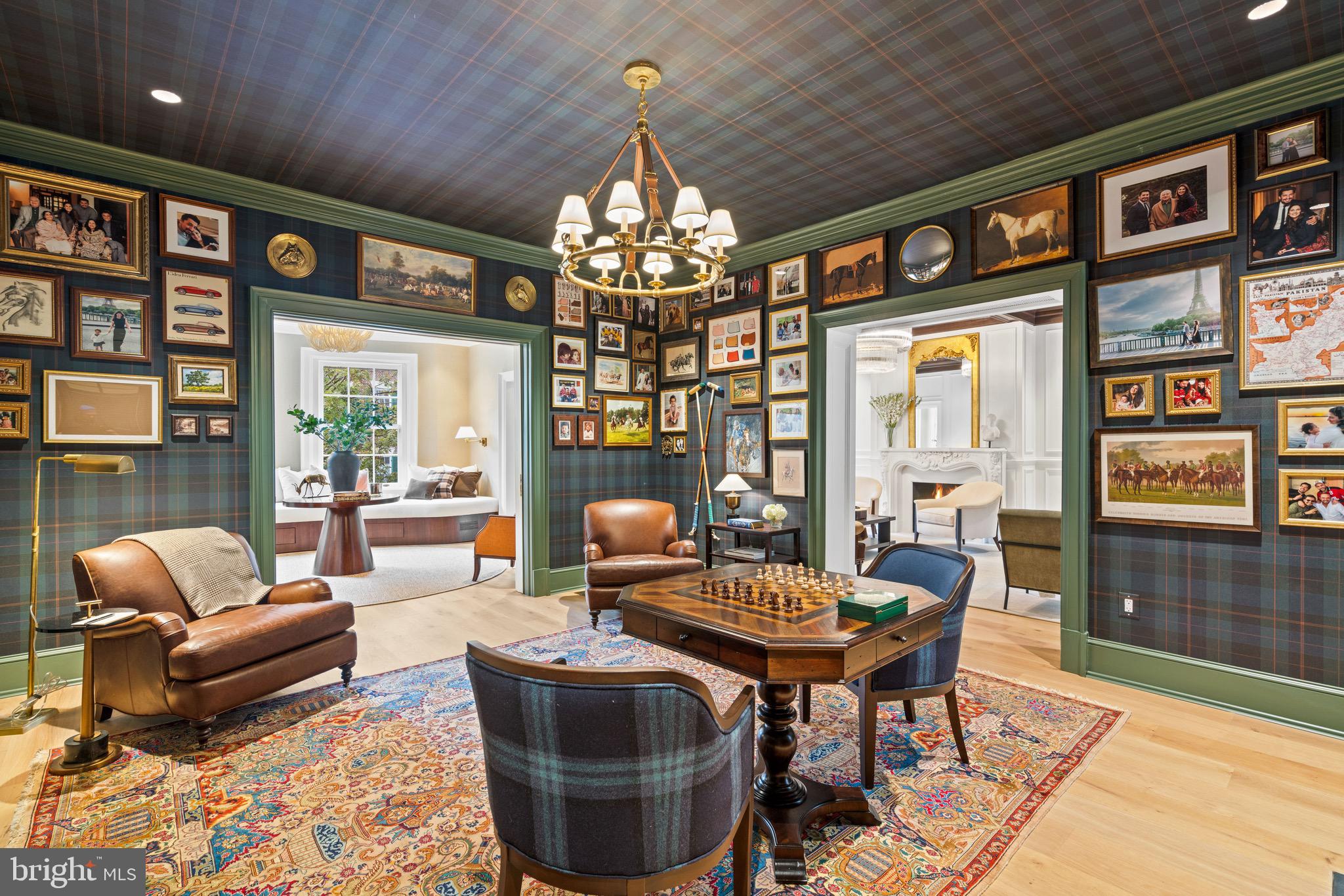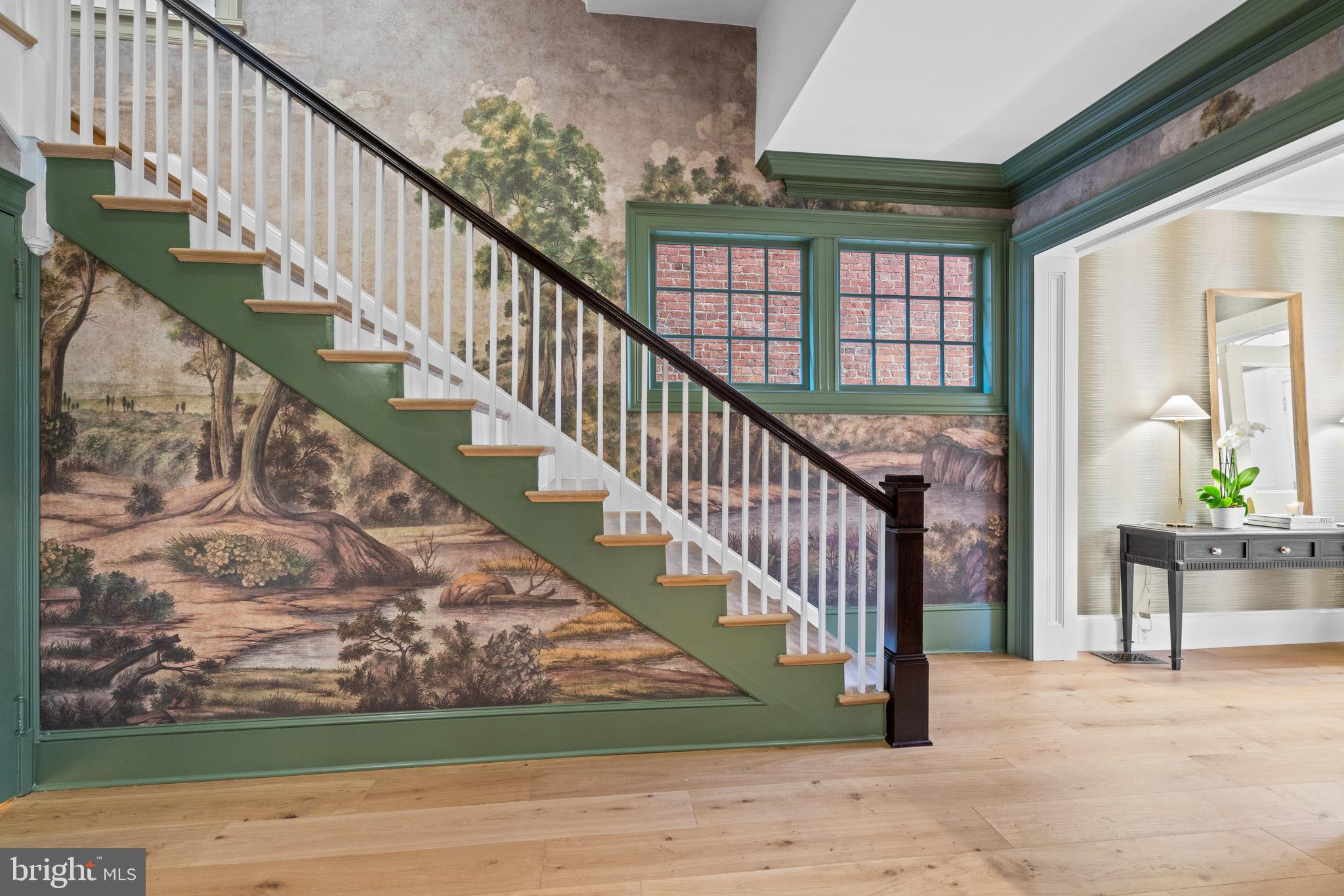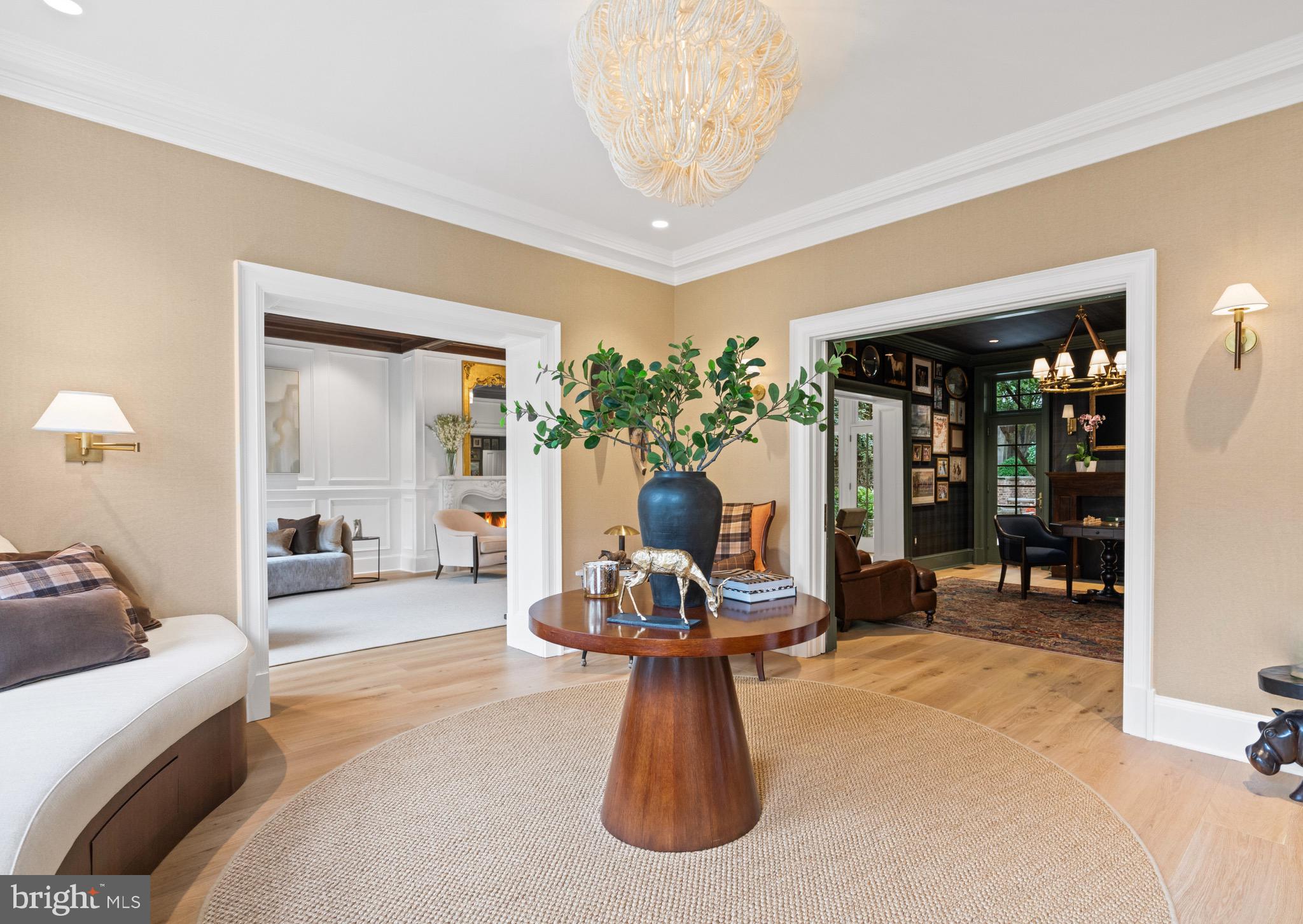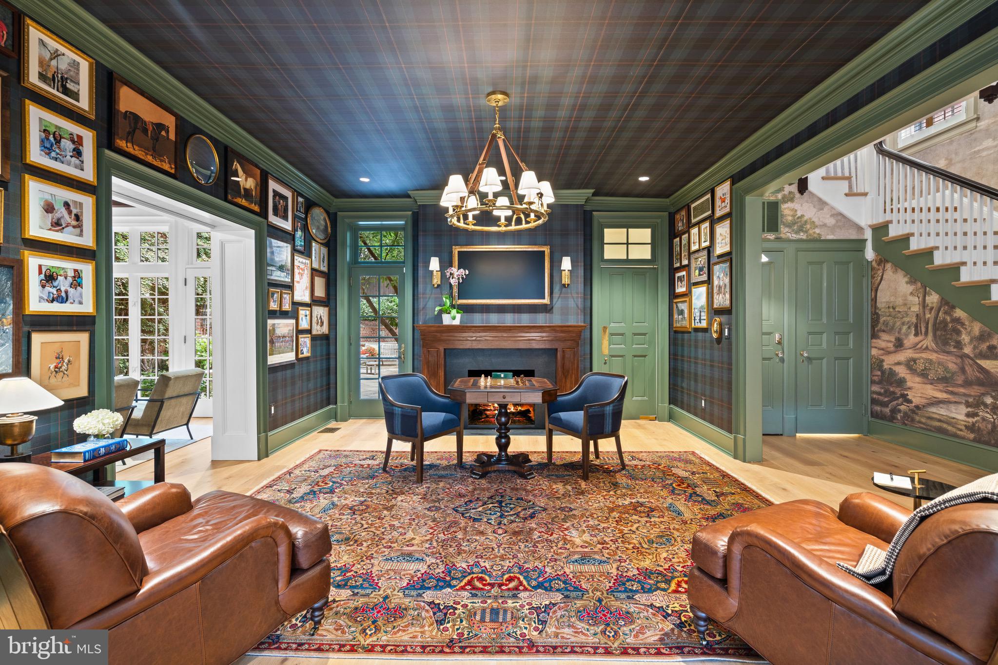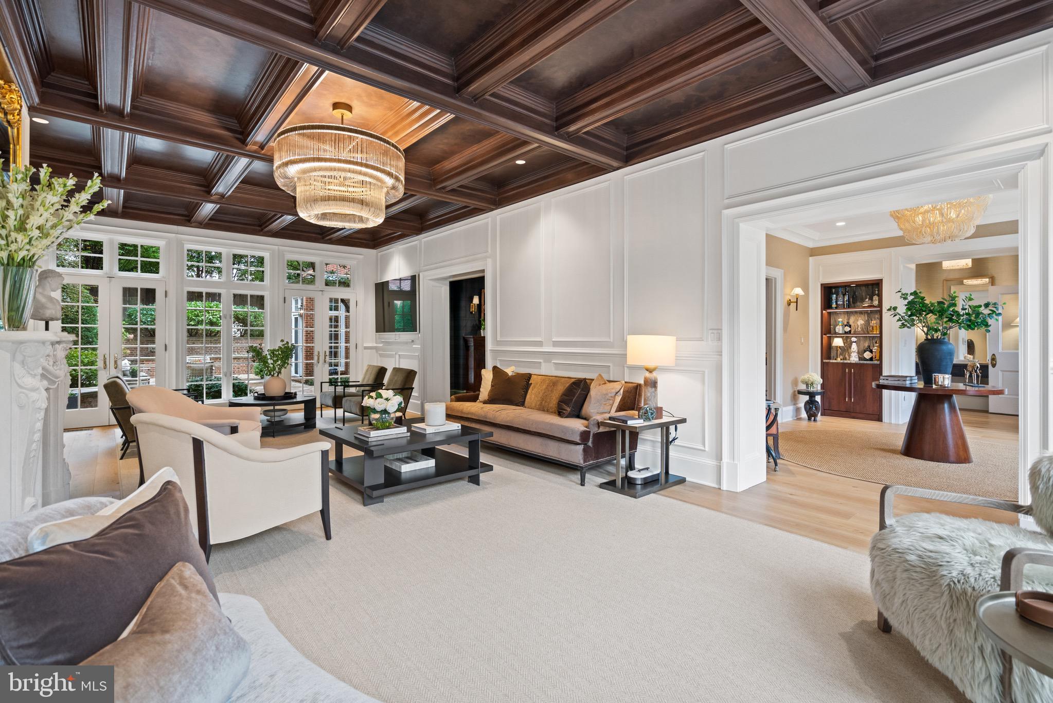 A stately entrance hall introduces exquisite architectural details including coffered ceilings, wainscoting, pocket doors, and a grand staircase. Six fireplaces lend warmth and atmosphere throughout. The sunlit front reception room opens seamlessly to a spacious living room and a banquet-sized dining room, creating a refined setting for gatherings. The bright white kitchen with a center island, breakfast bar, and adjoining family room invites relaxed everyday living. Walls of windows and French doors connect every main level space to expansive flagstone terraces and a beautifully landscaped garden, ideal for indoor and outdoor enjoyment.