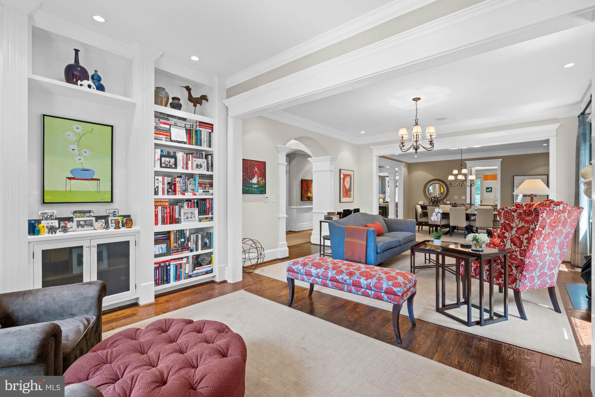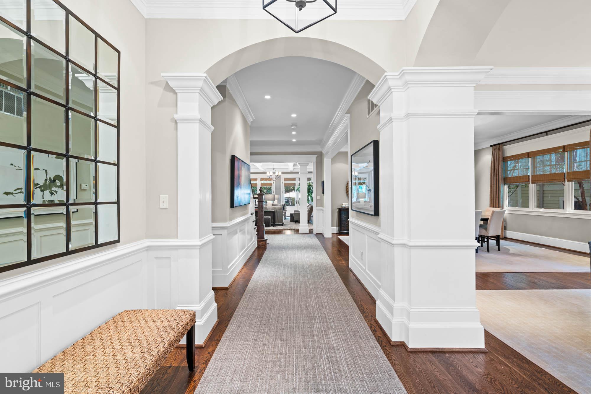 A graceful stone staircase leads to a welcoming portico framed by lush landscaping and blooming hydrangeas. Inside, a formal foyer opens to tall ceilings, arched doorways, and a thoughtfully designed floor plan that flows effortlessly throughout the main level. The living room features intricate millwork, custom built-in shelving, and expansive windows that fill the space with natural light. The adjacent dining room shares these elegant details and a fireplace, offering an ideal setting for gatherings. The kitchen has been designed with both form and function in mind. Outfitted with top-of-the-line appliances including a six-burner range with hood, it features an oversized center island, built-in banquette seating, and refined custom moldings. The kitchen flows into a light-filled family room with coffered ceilings, a marble fireplace, and French doors that open to a private backyard terrace. A powder room located off the living room adds convenience and completes the main level.