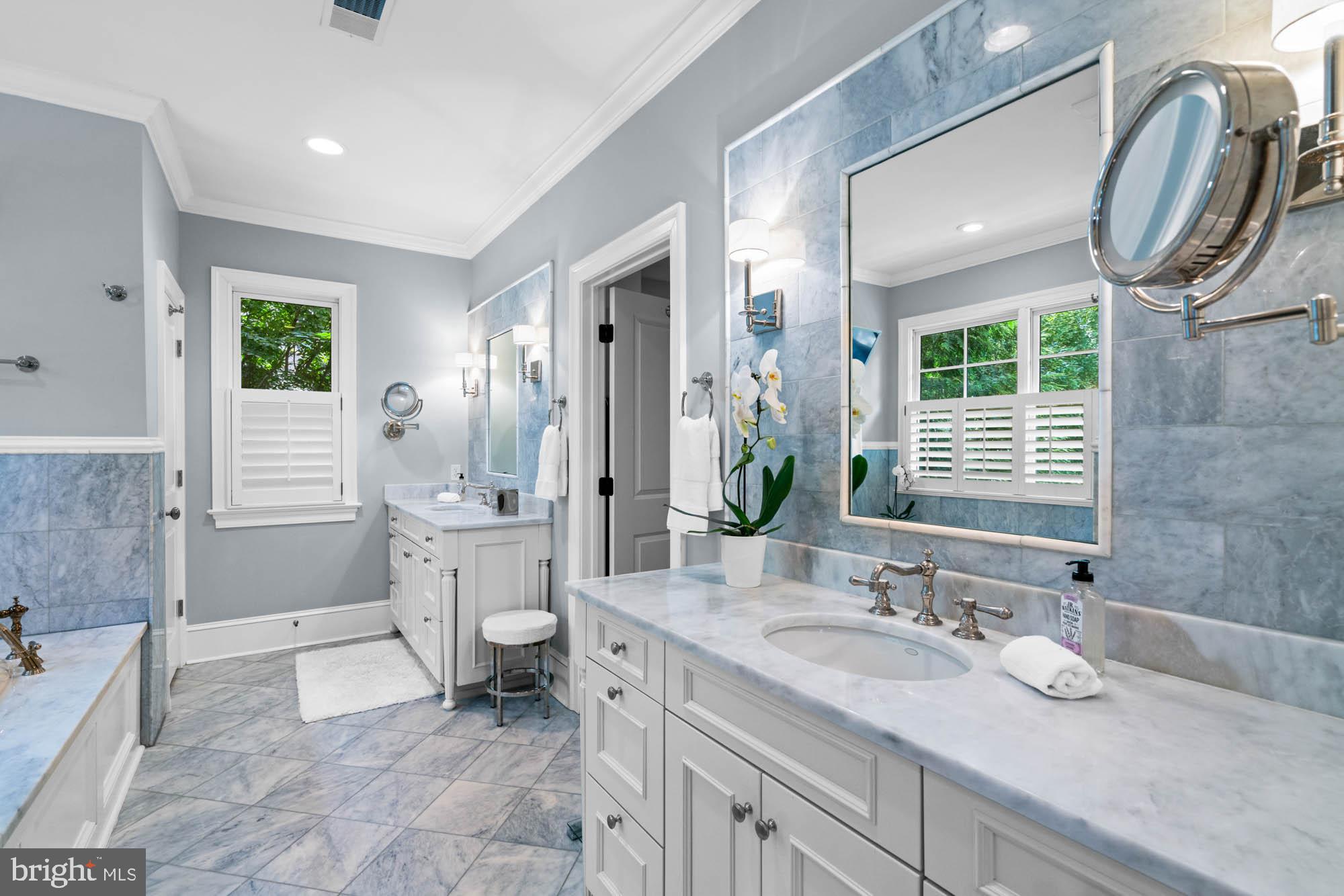 Upstairs, the second level offers four generous bedrooms, including a luxurious primary suite with a large walk-in closet featuring a center island. The spa-inspired primary bathroom includes dual vanities, a soaking tub, stone finishes, and a frameless glass shower. Each additional bedroom on this level includes an en-suite bathroom, substantial closet space, and large windows. This floor also showcases beautiful built-in shelving, detailed millwork, and a full laundry room.