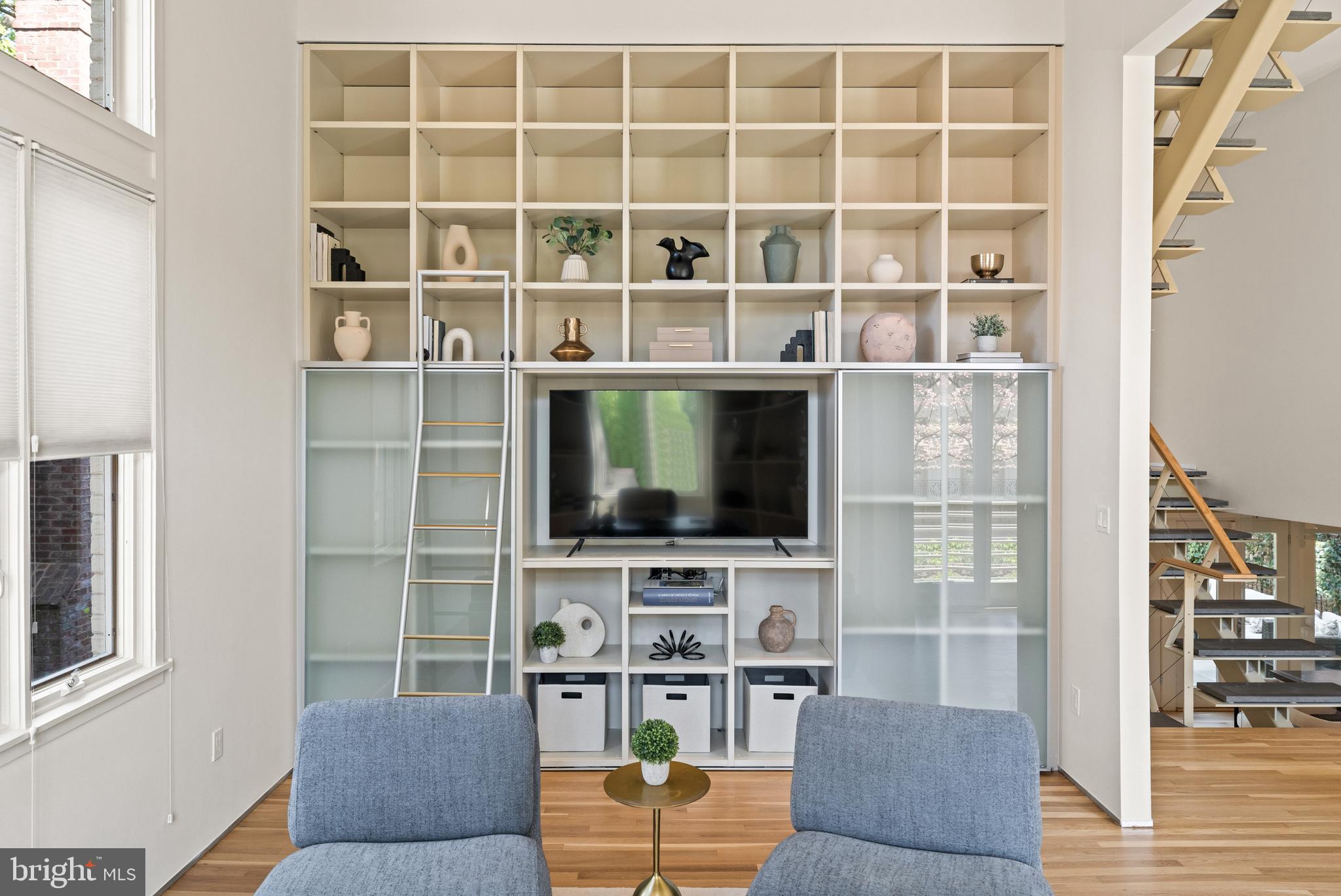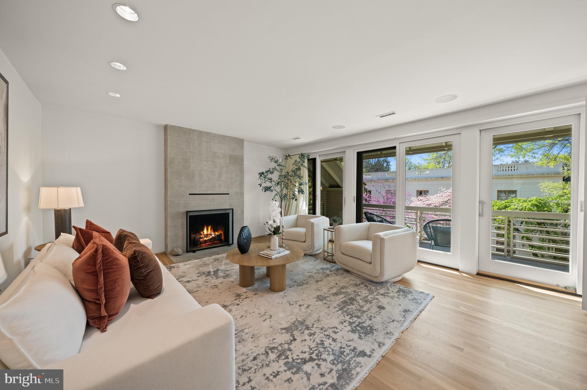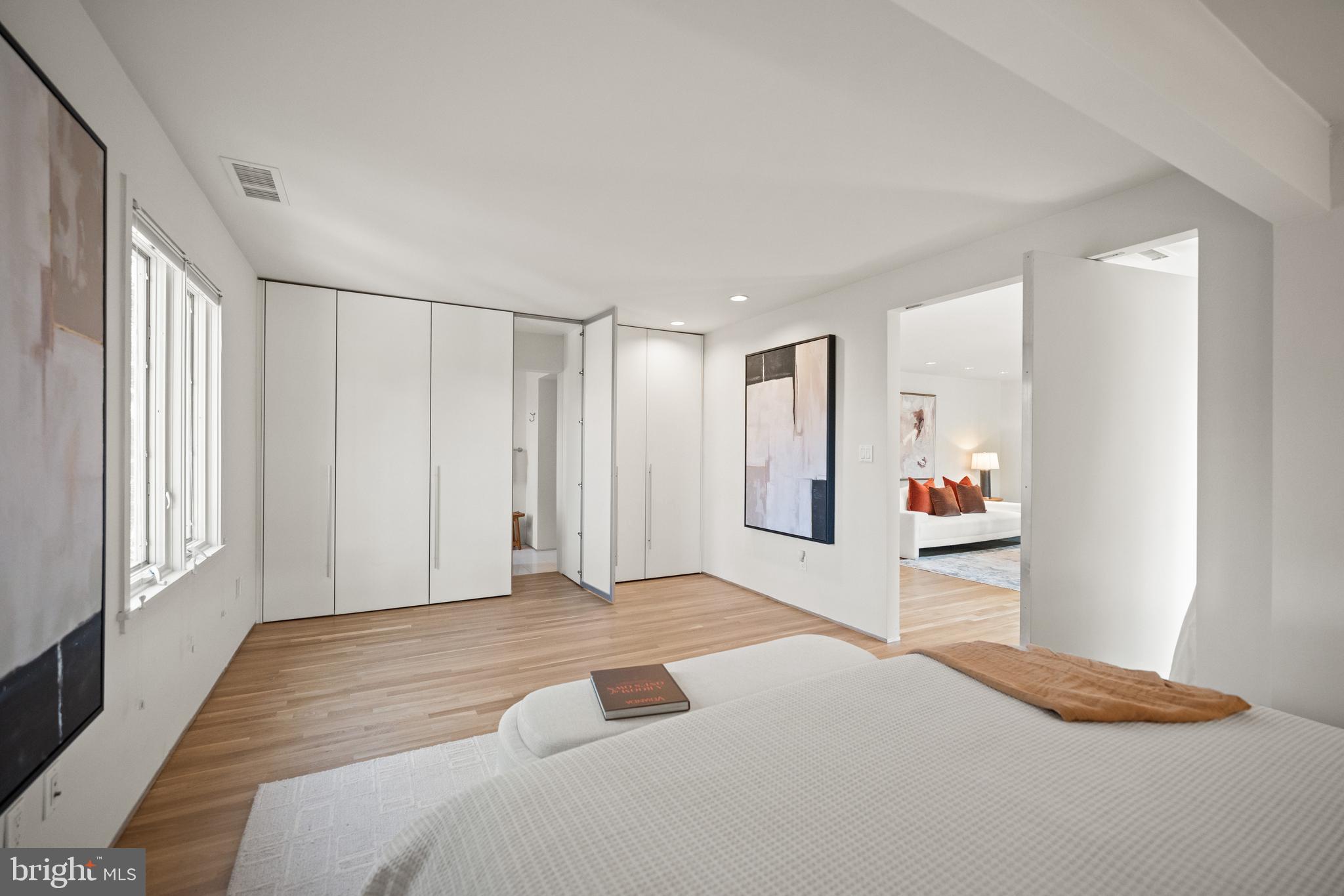 This contemporary residence offers generous scale, natural light, and a thoughtful layout across multiple levels. Clean lines, open spaces, and strong architectural elements create a home that is both functional and visually compelling. The entry foyer is spacious and filled with light, with a powder room, coat closet, and direct access to the one-car garage. A lower level just off the entry provides flexible space, well suited for a gym, office, or studio. A custom floating staircase connects the home's main levels. The kitchen, dining, and family areas are open and flow directly to landscaped gardens and a flagstone terrace. The outdoor space includes an in-ground pool and a pergola, creating a natural extension of the living area. One level above, the formal living room features a fireplace, high ceilings, and a wall of glass opening to a balcony. The adjacent library includes built-in shelving and can function as a reading room, office, or media space. The proportions on this level allow for comfortable everyday use as well as entertaining. The primary suite occupies its own floor and overlooks the garden. The bathroom includes a soaking tub, large shower, and a walk-in closet. A private balcony adds an additional outdoor connection. The next level includes a sitting room with a fireplace and balcony, an en-suite bedroom, an additional bedroom, a hall bathroom, and laundry. The top floor offers a fourth bedroom, along with a sitting room that can easily function as a fifth bedroom. White oak floors run throughout the home, reinforcing a consistent and clean aesthetic. The property is located on Bancroft Place, a quiet one-way street in the embassy district. It is within walking distance of Mitchell Park, Dupont Circle, restaurants, shops, museums, and cultural institutions. A well-designed home in a highly regarded location, offering space, light, and flexibility.