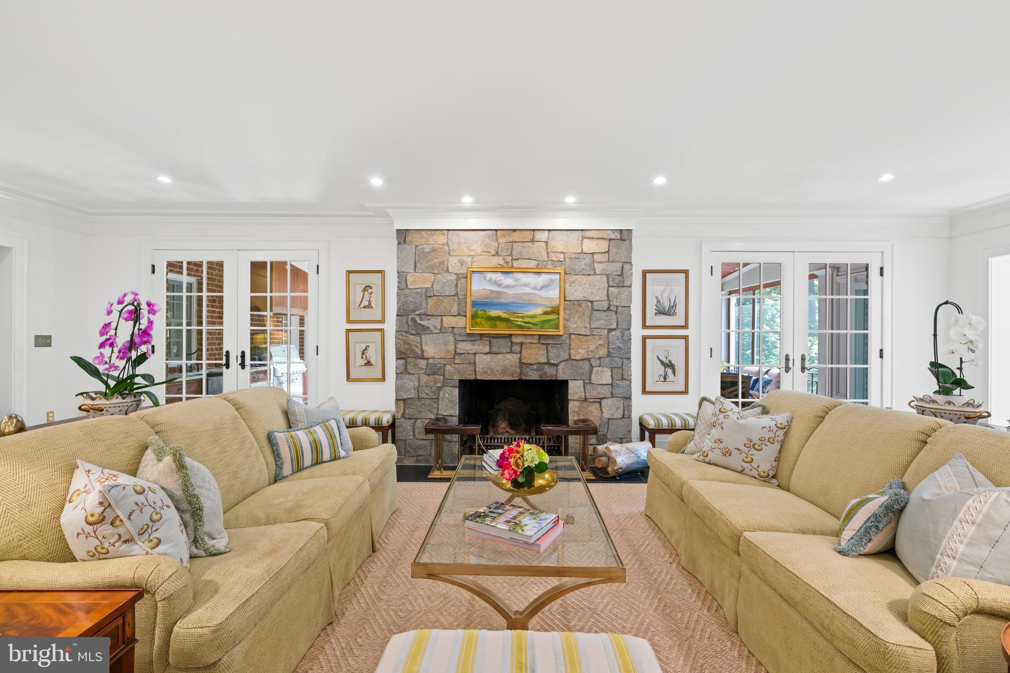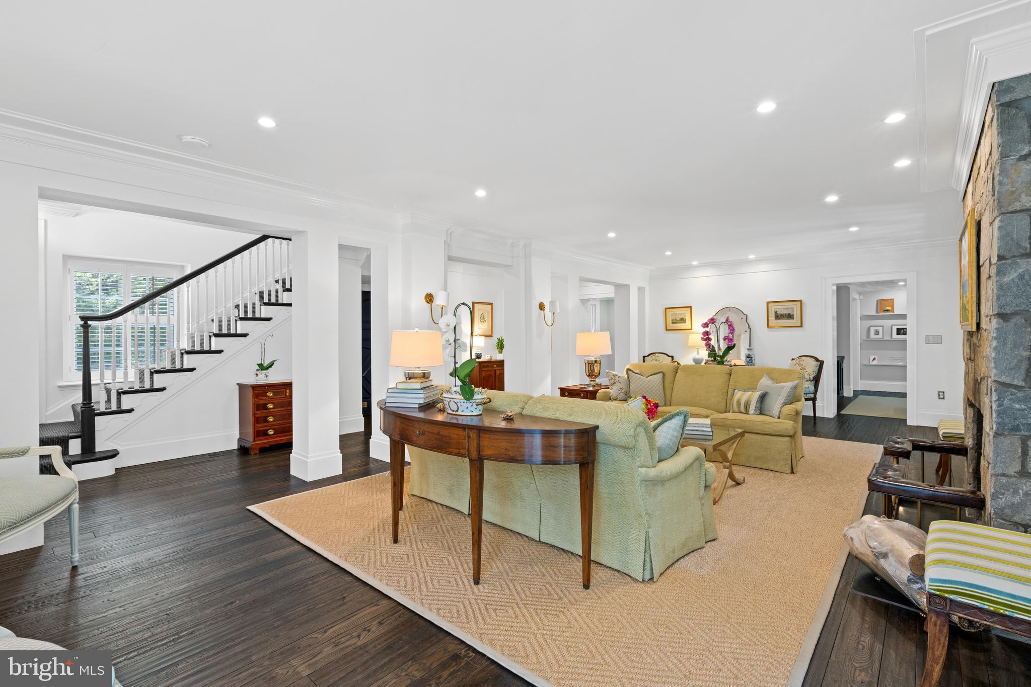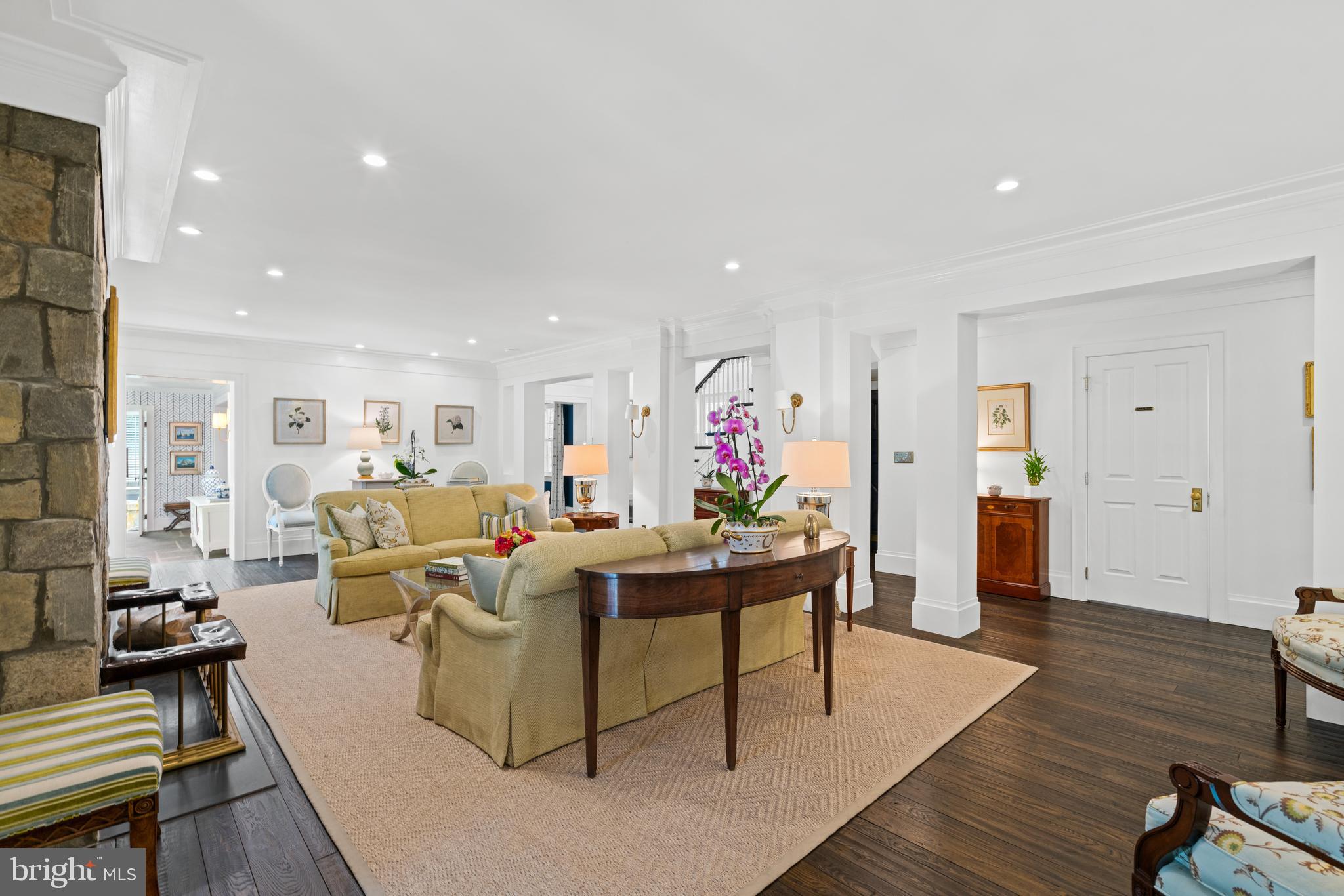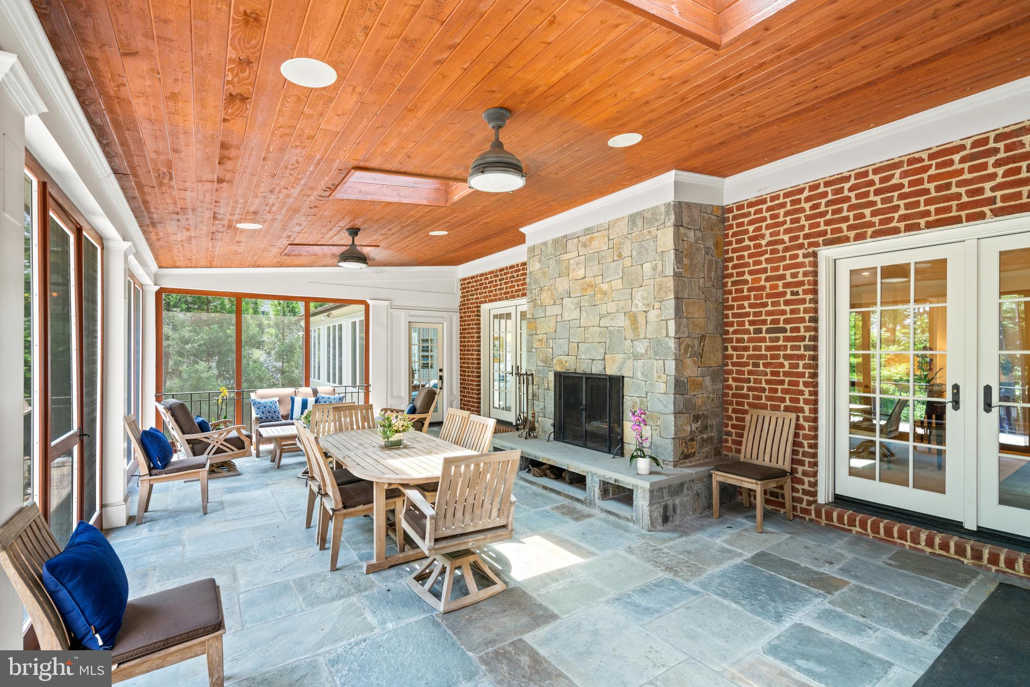 This impressive Foxhall estate is set on nearly an acre of land with mature trees and professional landscaping. The Williamsburg-inspired brick colonial has been thoughtfully renovated and expanded. No detail was overlooked in the custom renovation, which incorporates modern day amenities and the highest quality fixtures and finishes throughout. The residence offers a wonderful floor plan with a perfect balance of large-scale entertaining rooms, as well as comfortable family living spaces. There is also a seamless flow from indoors to outdoors for ample entertaining flexibility via a covered screened outdoor family room with a fireplace, ventilated outdoor kitchen with grilling station, and direct access to the stone terrace, garden, and 40x20 heated swimming pool. The interior of the house offers over 10,000 square feet of gracious living space. There is an attractive entry hall to the double-sized front living room with a beautiful stone central fireplace. There is also a grand dining room with a beamed Cathedral ceiling that connects to a lovely sitting room overlooking the rear grounds. The well-appointed gourmet kitchen features an oversized black walnut center island and breakfast bar, high-end appliances, and abundant cabinetry. It adjoins a family room with a wet bar and walls of windows. There is also the added convenience of front and back staircases, an elevator that services all levels, and a mud/coat room. The upper level has five bedrooms and four bathrooms, including the luxurious primary suite. The generous primary bedroom offers a large sitting space with a fireplace, walk-in closets, and scenic views of the lush gardens below. All additional bedrooms on this floor are spacious and feature marble bathrooms. The lower level sits primarily above grade, providing an abundance of sunlight. There is a sophisticated family room with wood-paneling, a fireplace, a full kitchen with a breakfast bar, climate-controlled wine cellar, and direct access to the rear garden through multiple sets of French doors. Additionally, there is also a large recreation room, gym, in-law/staff suite with a private full bathroom, and abundant storage space. The exterior of the residence is exceptionally private and provides various spaces for entertaining and fun. There are multiple flagstone terraces, a large heated pool, an outdoor fireplace with a seating area, a sport court with artificial turf, and a treehouse. There is also a heated three-car garage with three bays, as well as a circular front motor court for additional parking. This exceptional residence is easily accessible to downtown DC, various airports, and Northern Virginia.