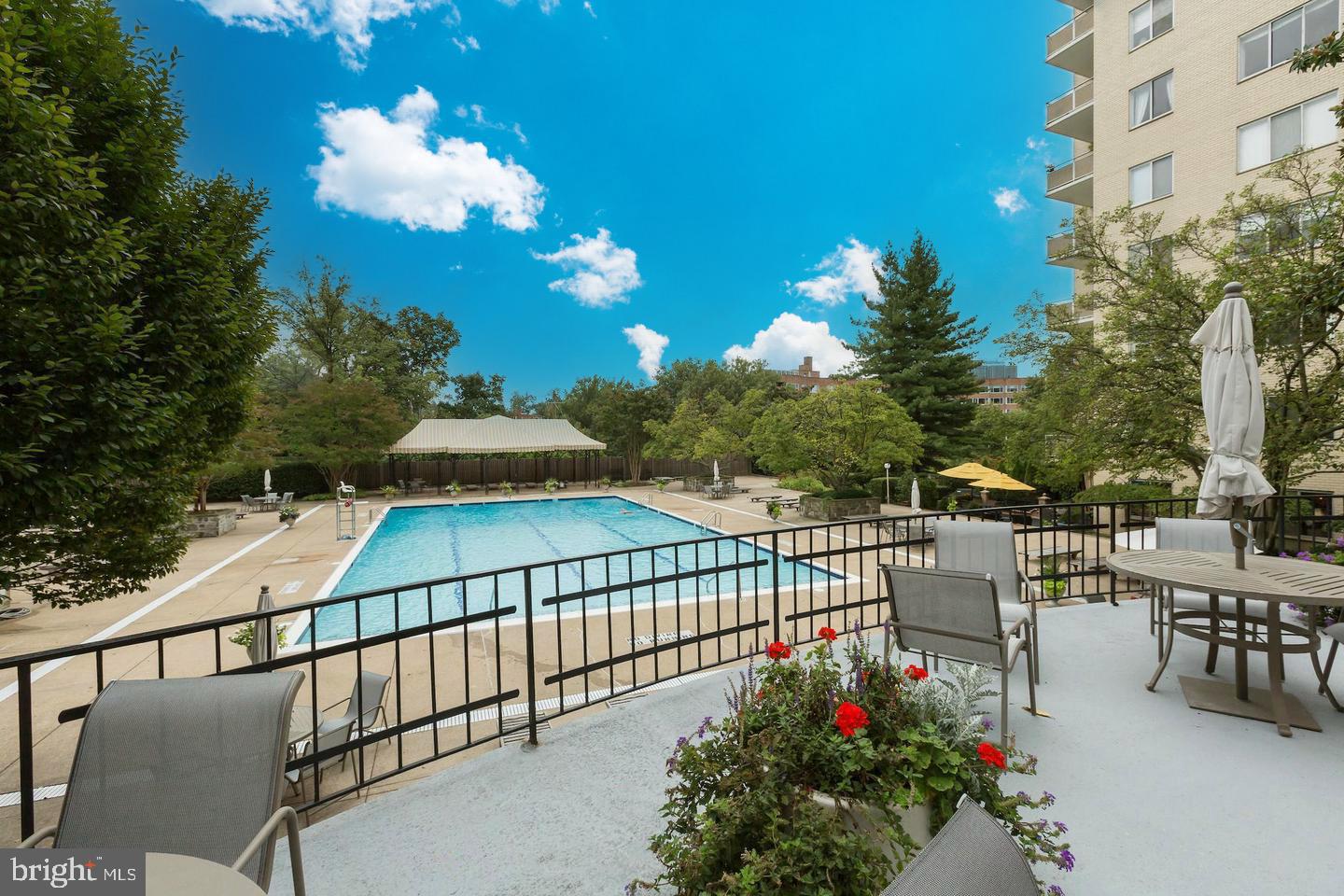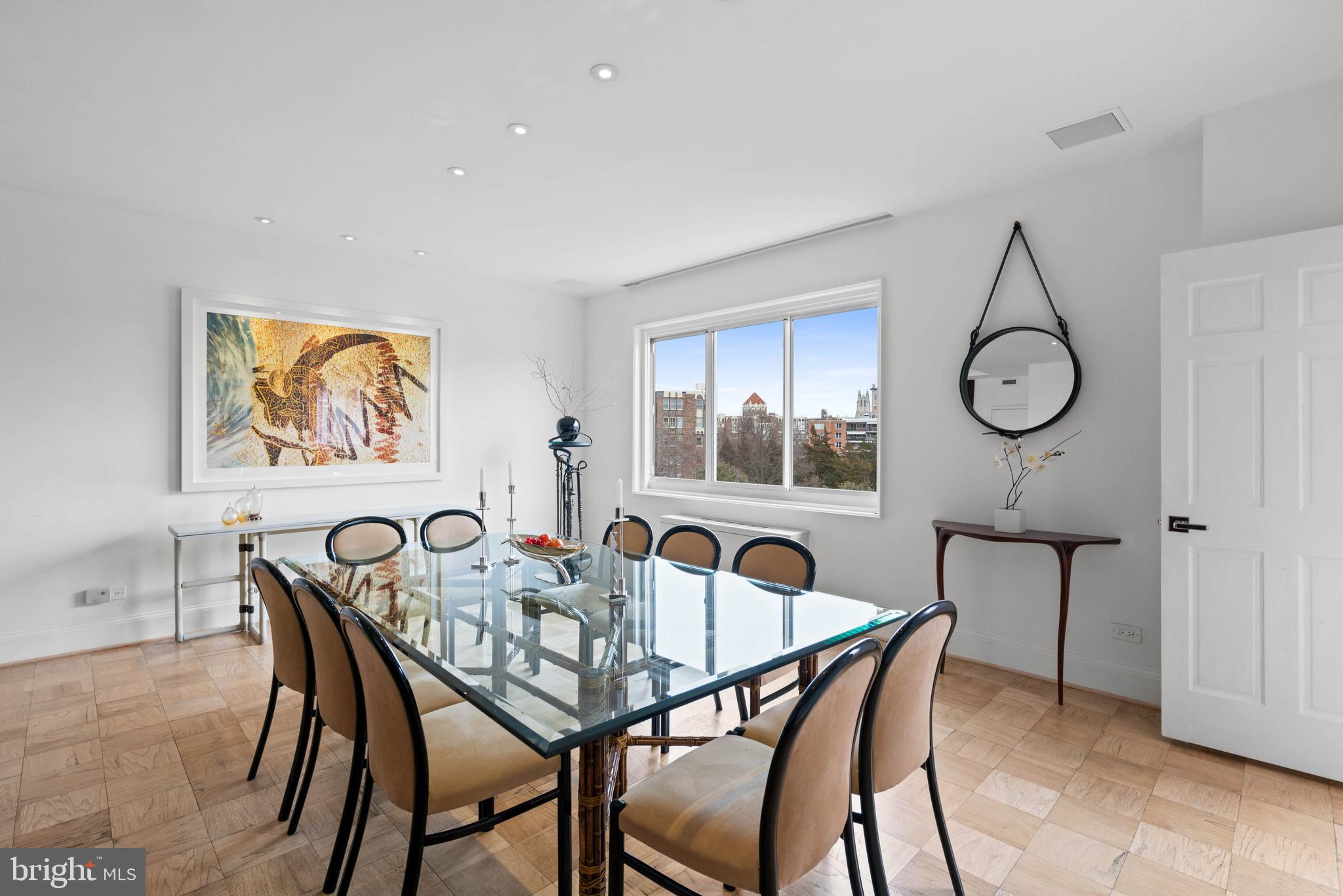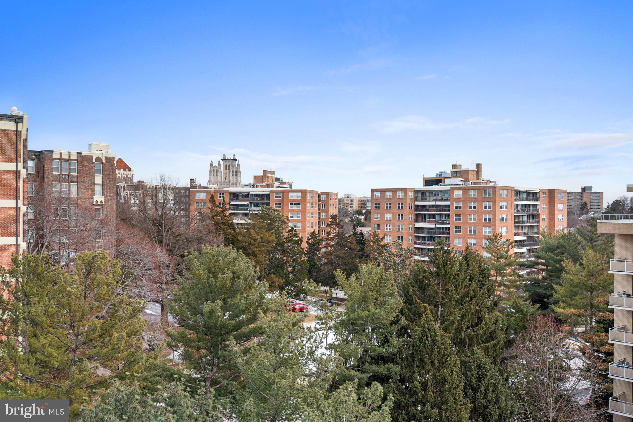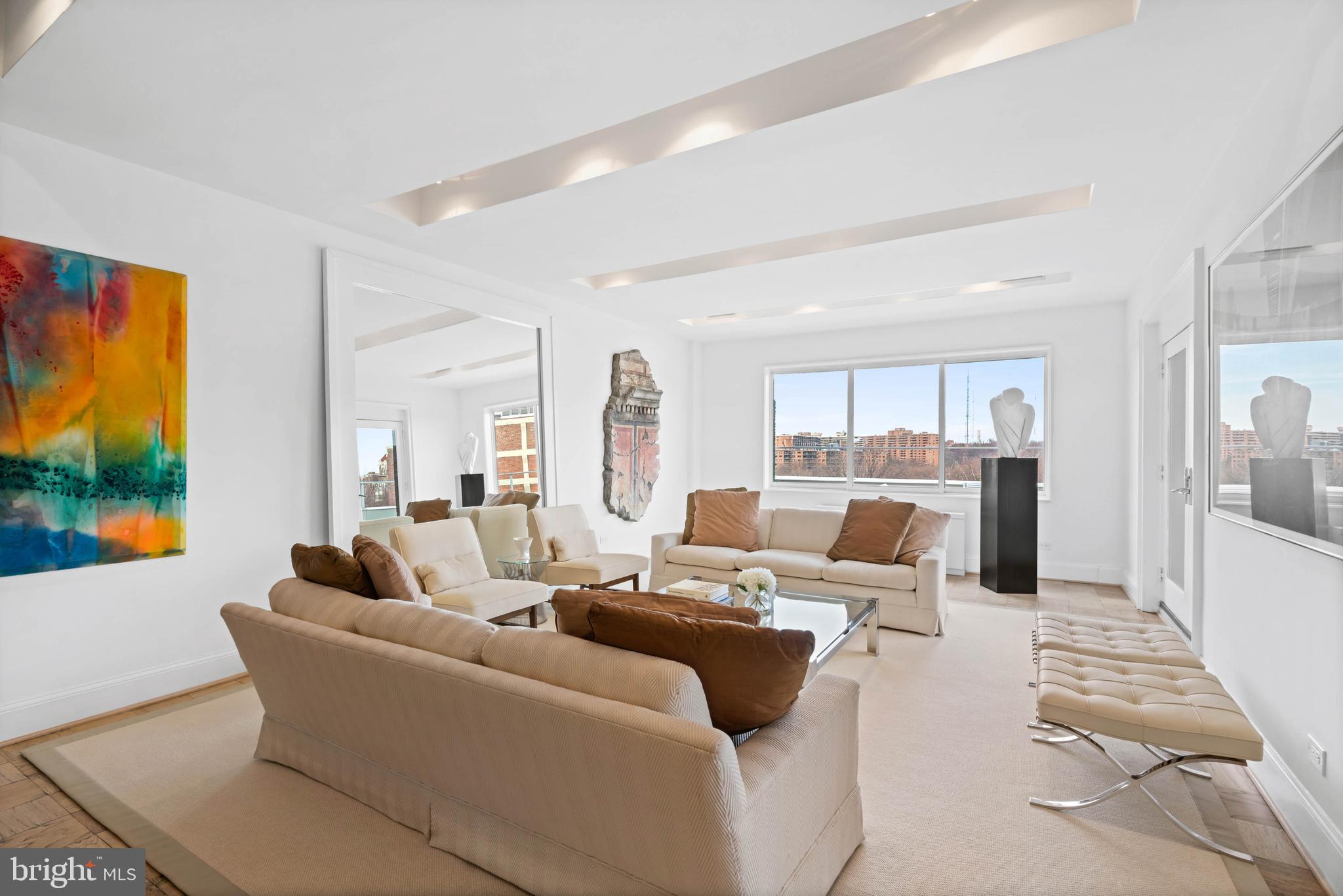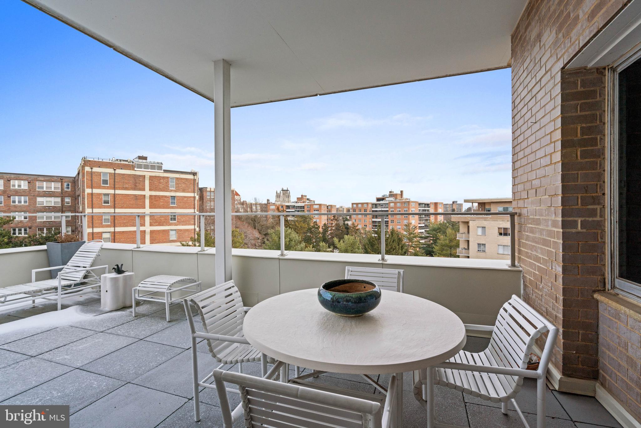The Colonnade is a beacon of refined luxury and timeless elegance. This rare offering includes two combined units, Penthouses 7&8, a unique three-bedroom residence spanning over 3,000 square feet of expansive living space with an open, airy floor plan. Panoramic views of the iconic Washington National Cathedral and breathtaking sunsets are framed by oversized windows and a private balcony, creating a serene backdrop for daily living. This distinguished building beautifully blends classic charm with modern amenities, including a meticulously maintained lobby that exudes grandeur and exceptional concierge service. Upon entering, a gracious foyer leads into the spacious living room, where large windows bathe the space in natural light. Flowing seamlessly from the living area, a private penthouse terrace offers the perfect setting for indoor-outdoor living and al fresco dining. A custom wood-paneled office, with built-in shelving and a tailored TV console, provides an elegant space for both work and relaxation. The updated kitchen features granite countertops, generous cabinetry, and modern appliances, paired with a charming breakfast area. Ideally located next to the formal dining room, it offers an effortless flow between the two spaces. The primary suite serves as a true retreat, boasting a spacious layout, a large tiled shower, and a soaking tub. The second bedroom, featuring a built-in desk, includes an ensuite bathroom for added privacy. A versatile third bedroom or sitting room--ideal as a home office or creative studio--features a dual-seated desk and is complemented by a third full bathroom. Additional features include 24-hour doorman service, a newly renovated fitness center, a salon, dry cleaning service, a party room with catering kitchen, and a heated swimming pool (available mid-April through mid-October). Residents can also enjoy beautifully landscaped gardens, picnic areas with grills and fire pits, and two reserved parking spaces, along with three dedicated storage units. Just across the street, the expansive Glover Archbold Park provides a serene escape right at your doorstep. This exceptional offering in Cathedral/Wesley Heights combines luxury, space, and convenience--an extraordinary opportunity to own a distinguished residence in one of Washington D.C.'s most sought-after neighborhoods.