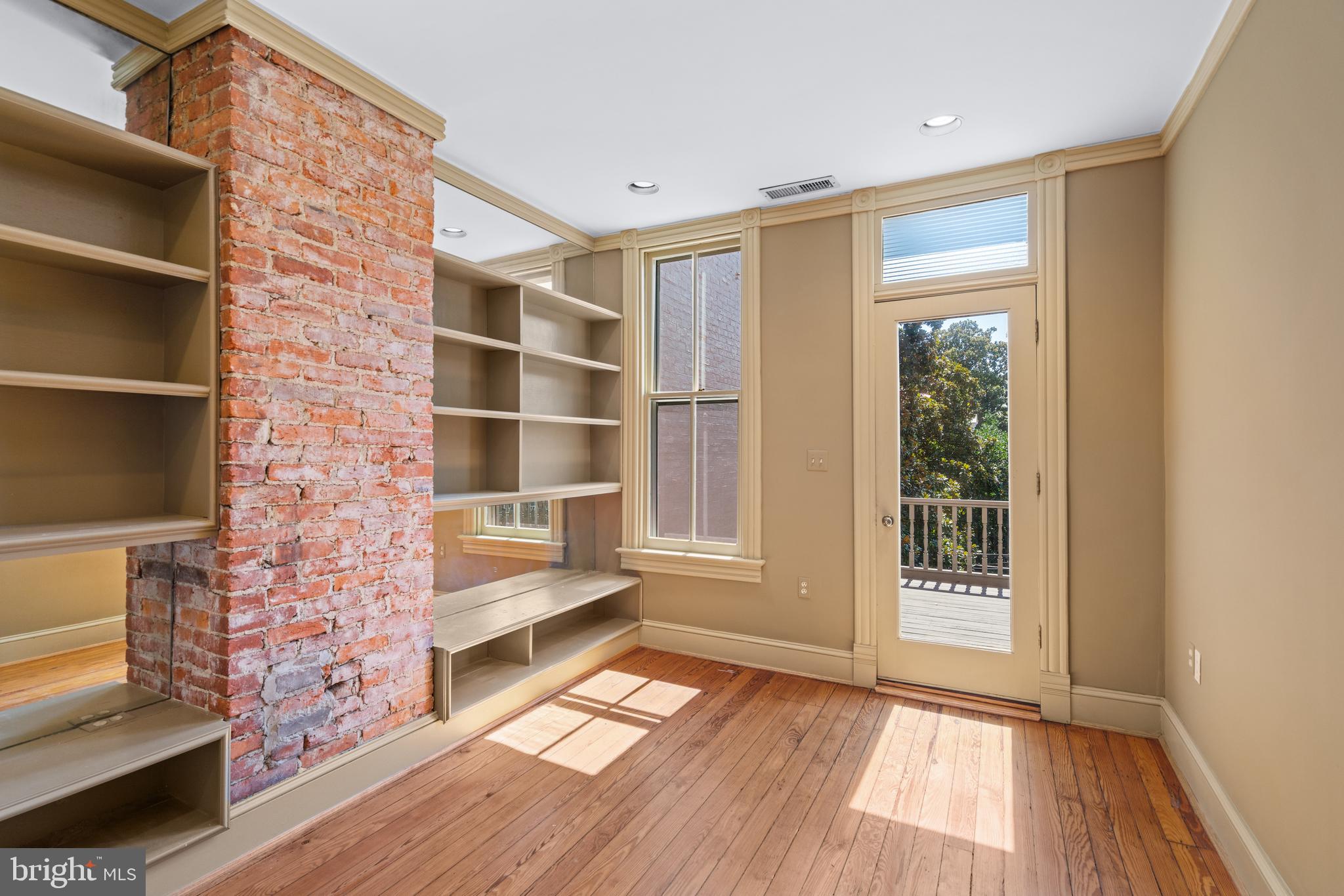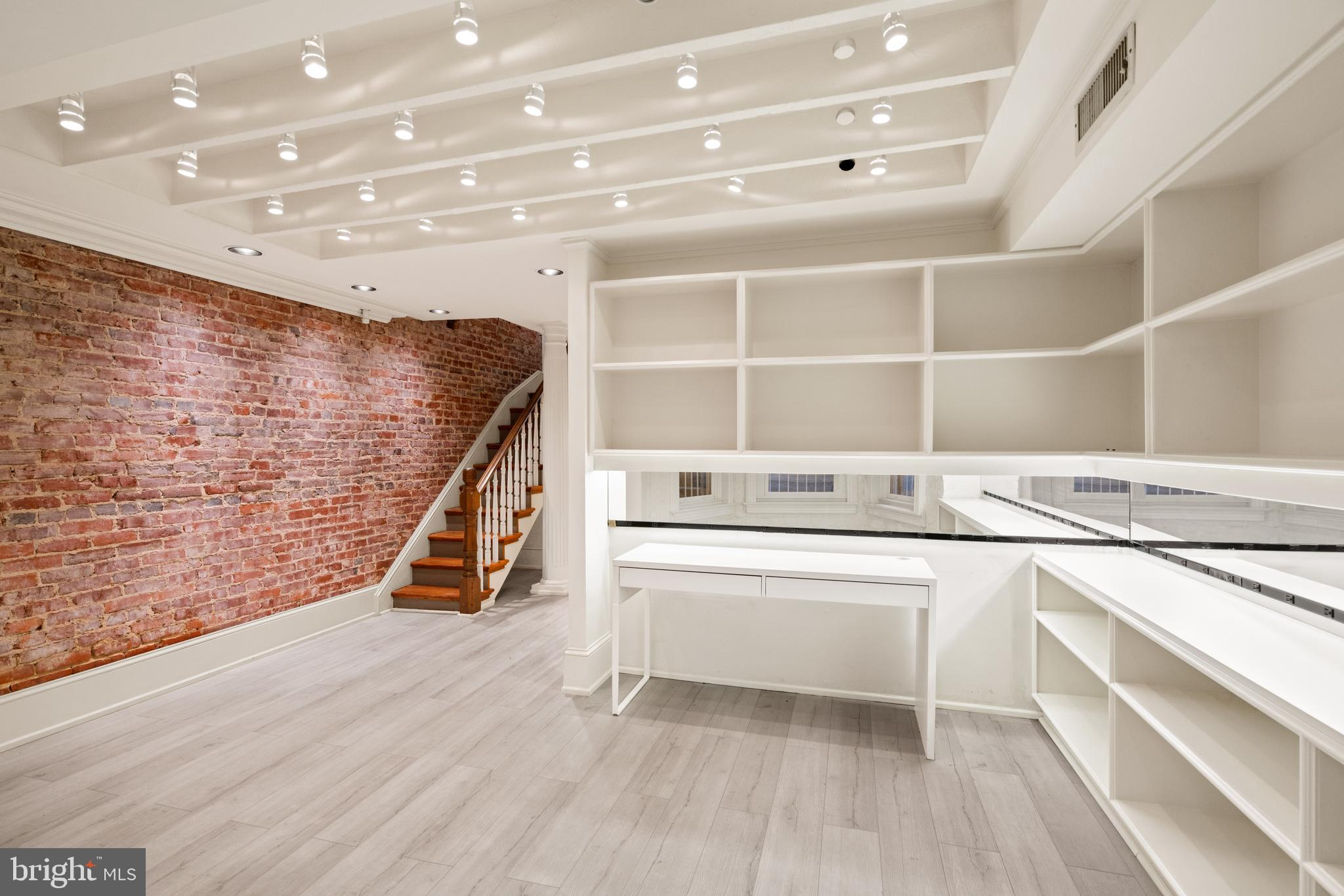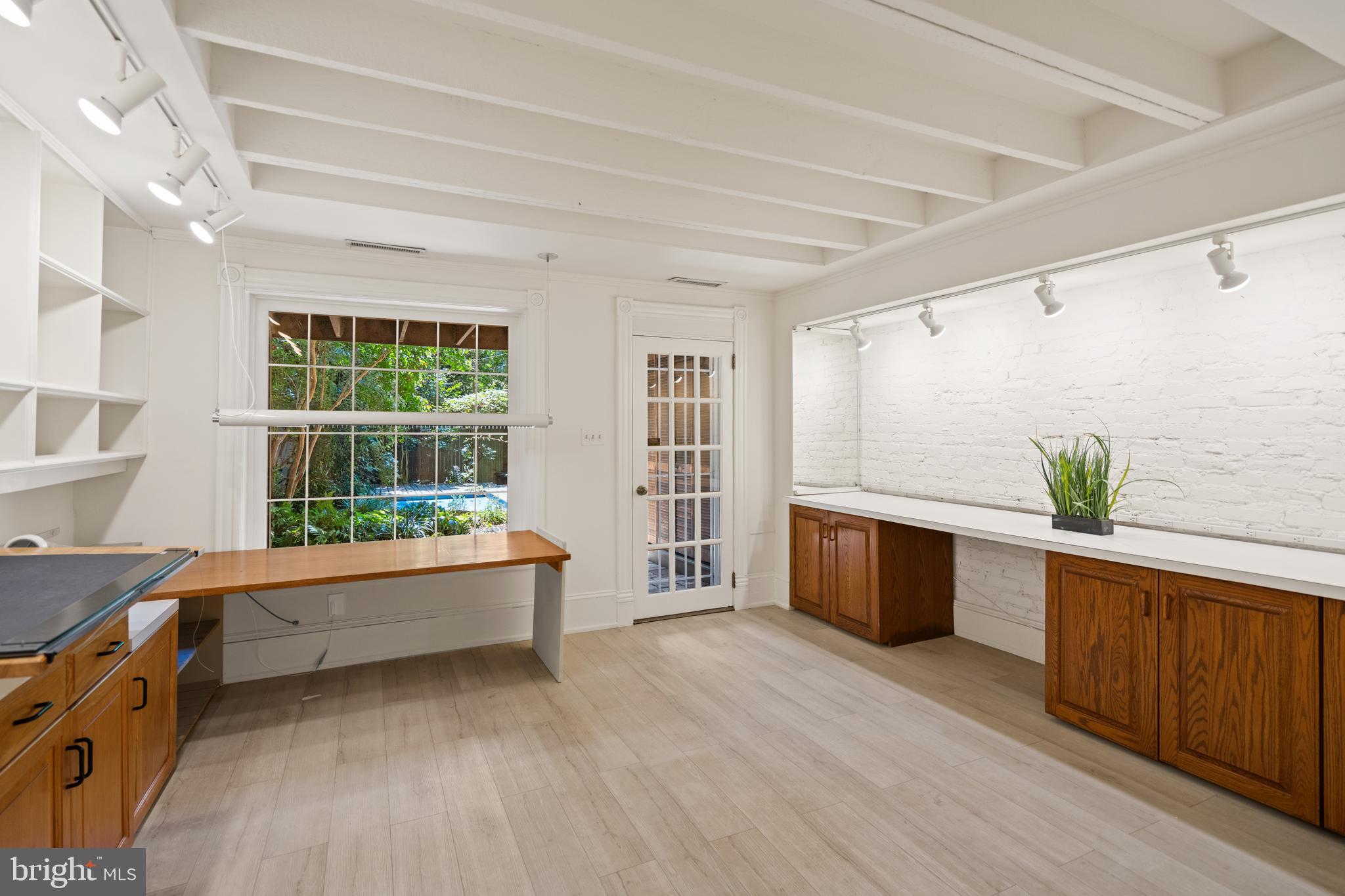 The lower level offers exceptional flexibility, featuring exposed brick walls, custom built-in workspaces, recessed lighting, a powder room, and dual entrances: one from the front of the home and another leading to the rear garden. This space is ideally suited for use as a home office, guest quarters, or creative studio. The walk-out garden level opens to a serene and landscaped outdoor space, ideal for quiet enjoyment or al fresco dining.