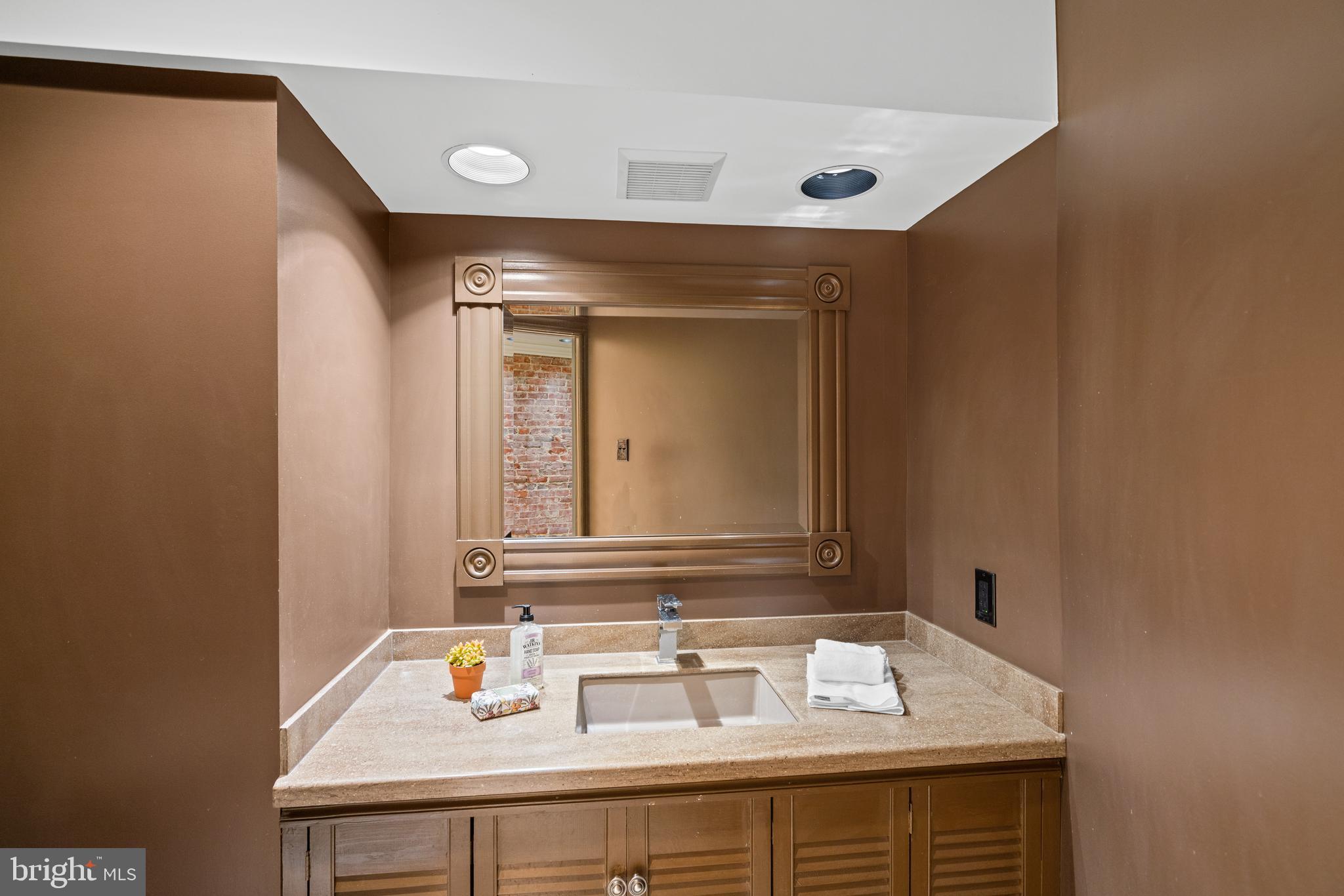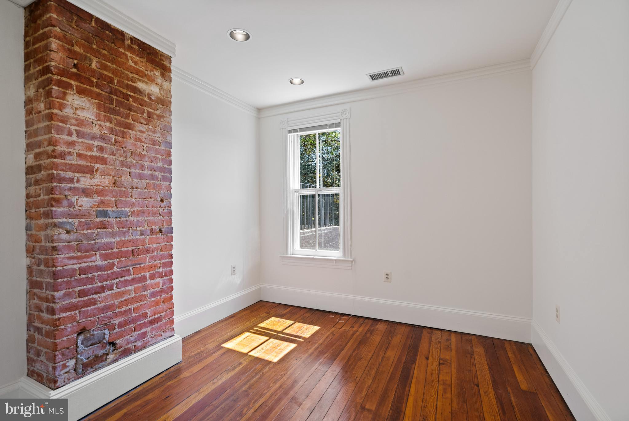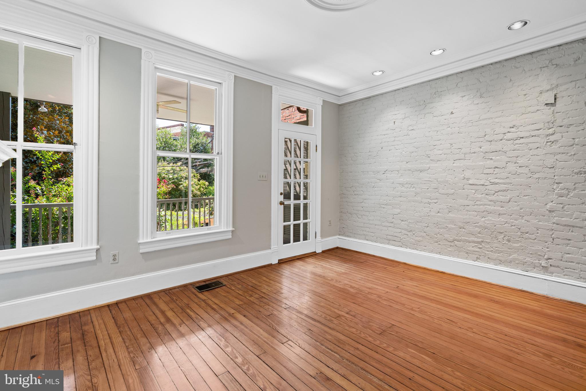 The lower level offers exceptional flexibility, featuring exposed brick walls, custom built-in workspaces, recessed lighting, a powder room, and dual entrances: one from the front of the home and another leading to the rear garden. This space is ideally suited for use as a home office, guest quarters, or creative studio. The walk-out garden level opens to a serene and landscaped outdoor space, ideal for quiet enjoyment or al fresco dining.