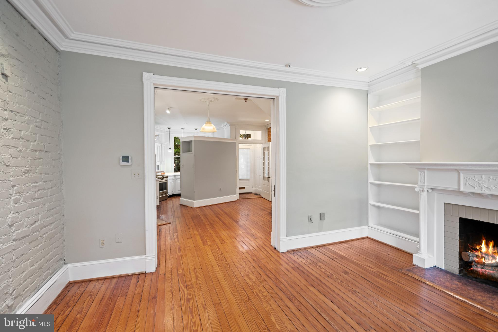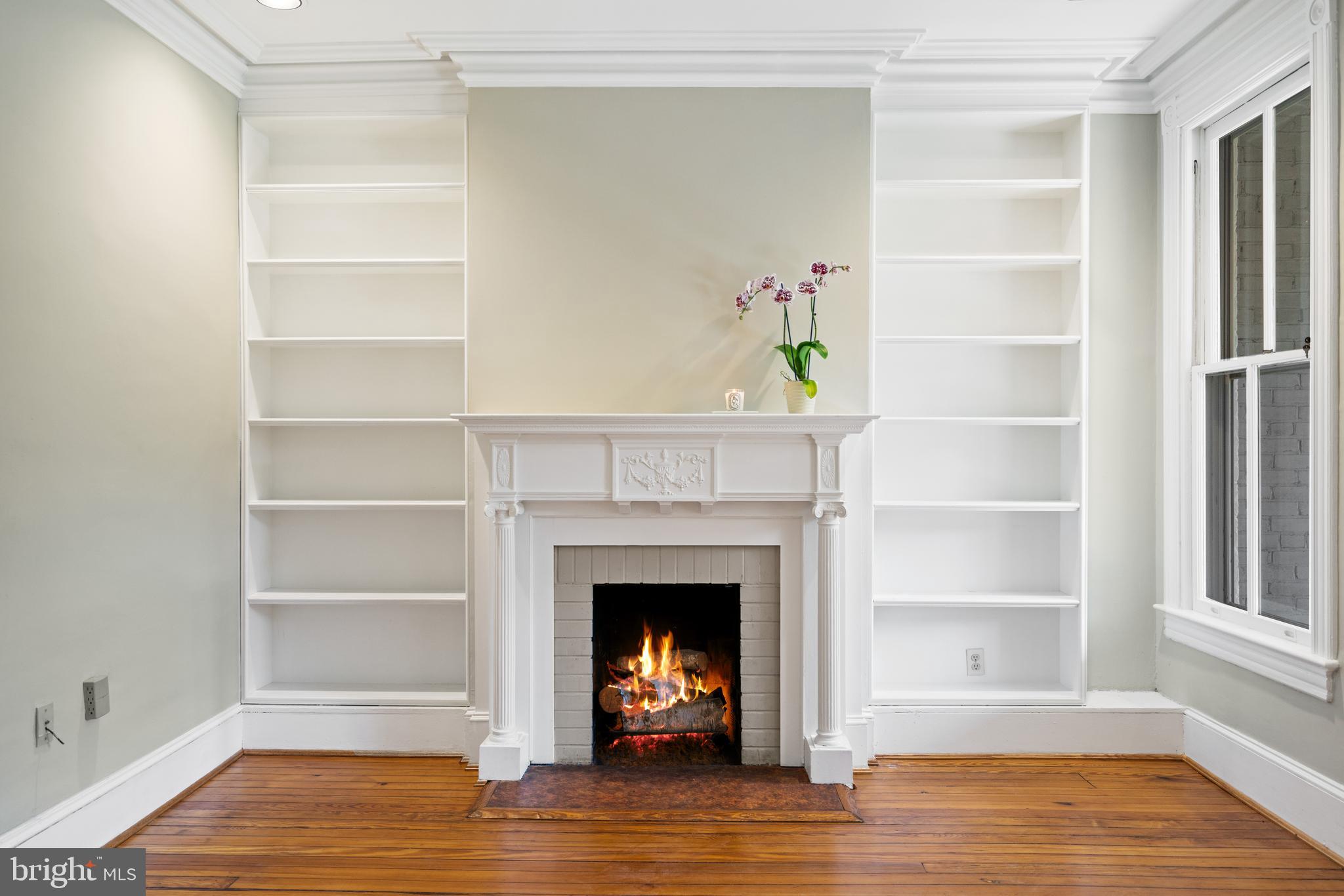 Upon entry, this townhome reveals a bright and airy interior with high ceilings and an open floor plan, which is well suited for both everyday living and refined entertaining. The front dining room features a beautifully detailed fireplace, paired with bespoke shelving and rich architectural elements, including original crown molding, hardwood floors, exposed brick, and decorative columns, all thoughtfully maintained to reflect the home's historic character. The kitchen is appointed with custom cabinetry, a suite of stainless-steel appliances, including a six-burner stove, and windows offering verdant views of the picturesque street. The living room showcases a second fireplace, floor-to-ceiling built-in shelving, and access to a large terrace overlooking the lush and vibrant rear garden.