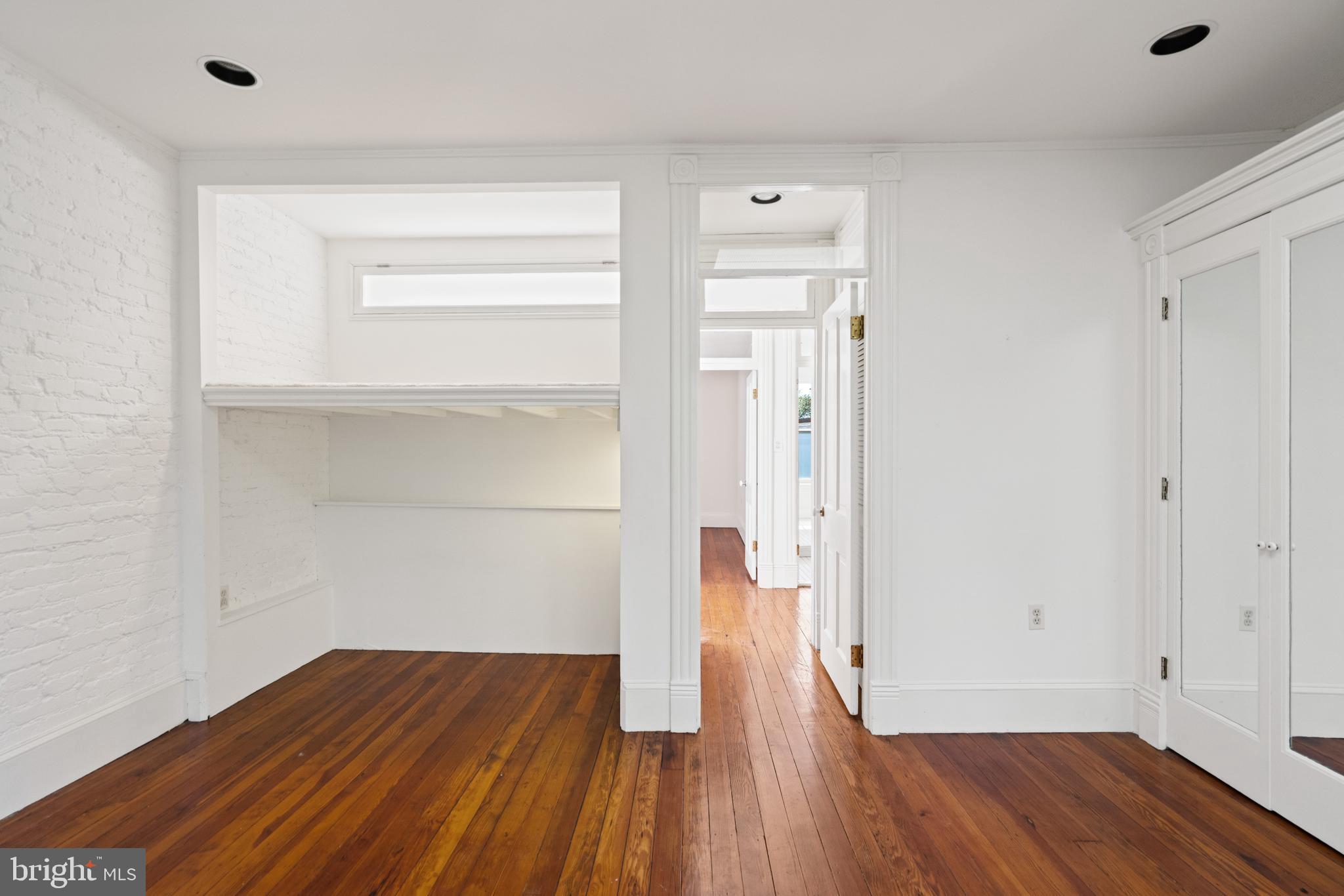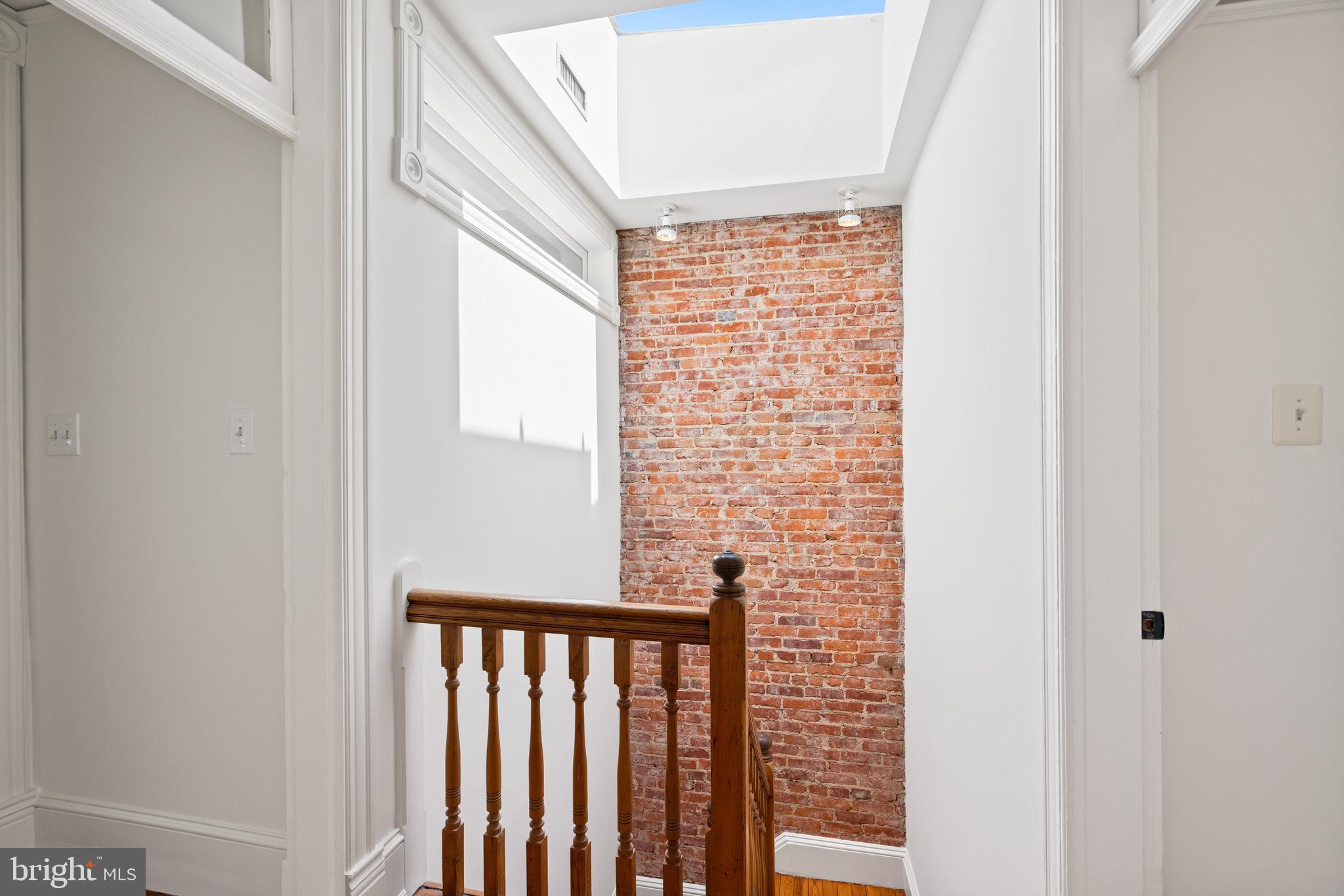 Upstairs, the primary suite is bathed in natural light from oversized bay windows. This elegant space offers a generous closet, custom wardrobe cabinetry, recessed lighting, and a detailed tray ceiling. It is complemented by a bathroom thoughtfully finished with a glass shower, wood-accented vanity, and contemporary tile flooring. A second bedroom or office on this level features integrated bookcases, ample closet space, and access to its own private terrace with tranquil garden views. The third level is illuminated by a central skylight and comprises two additional well-proportioned bedrooms that share an updated hall bathroom.