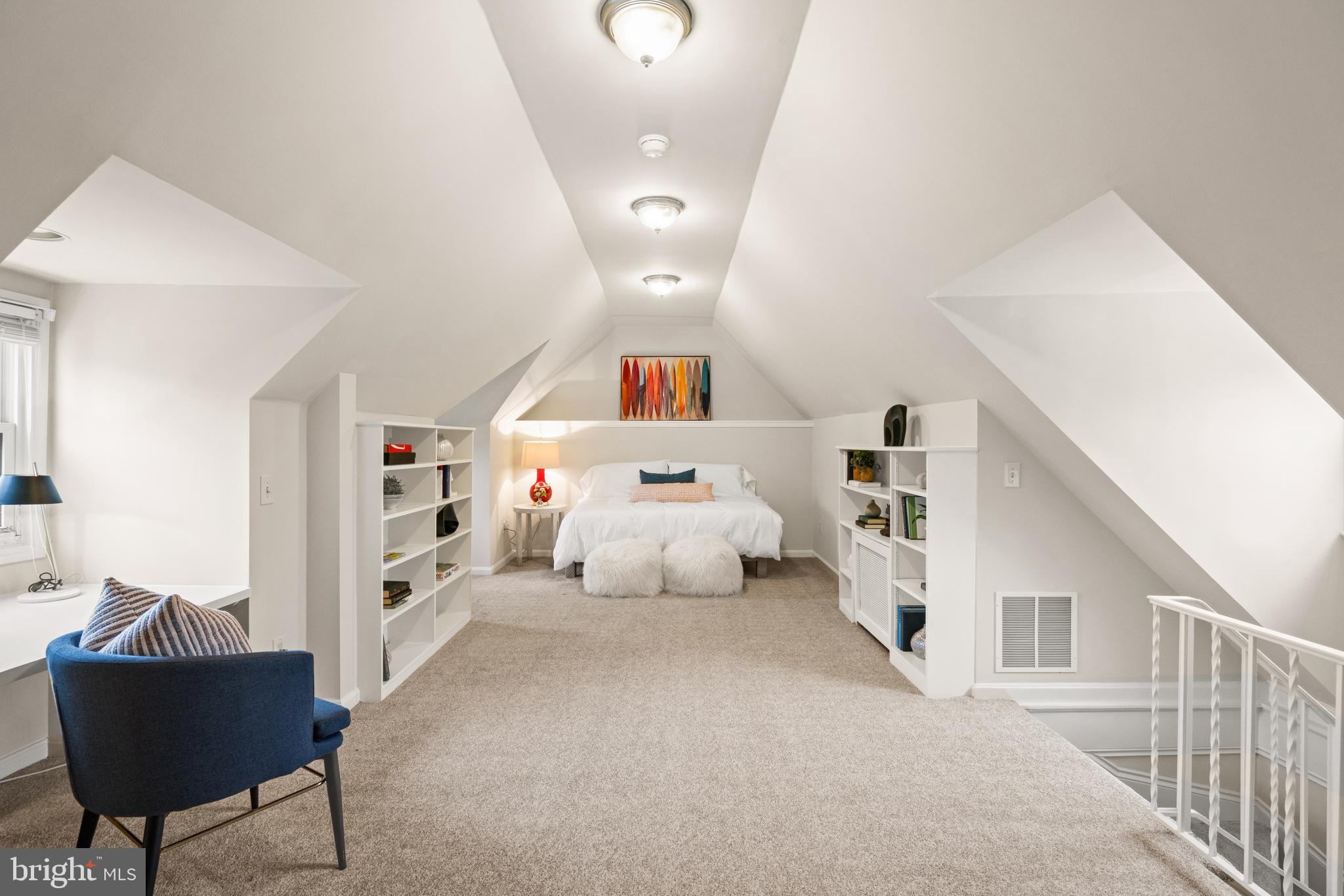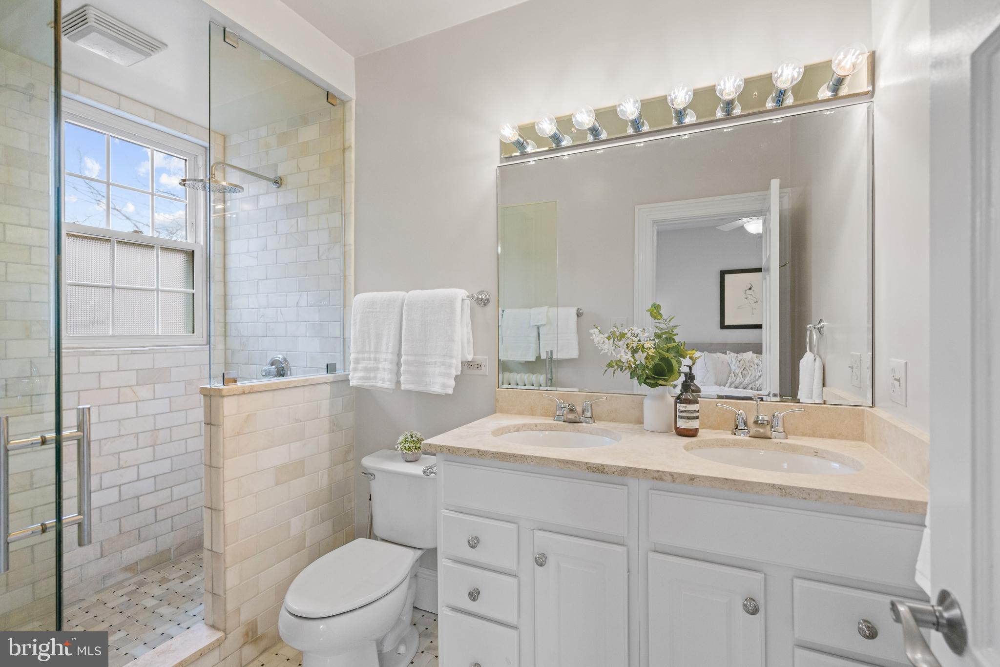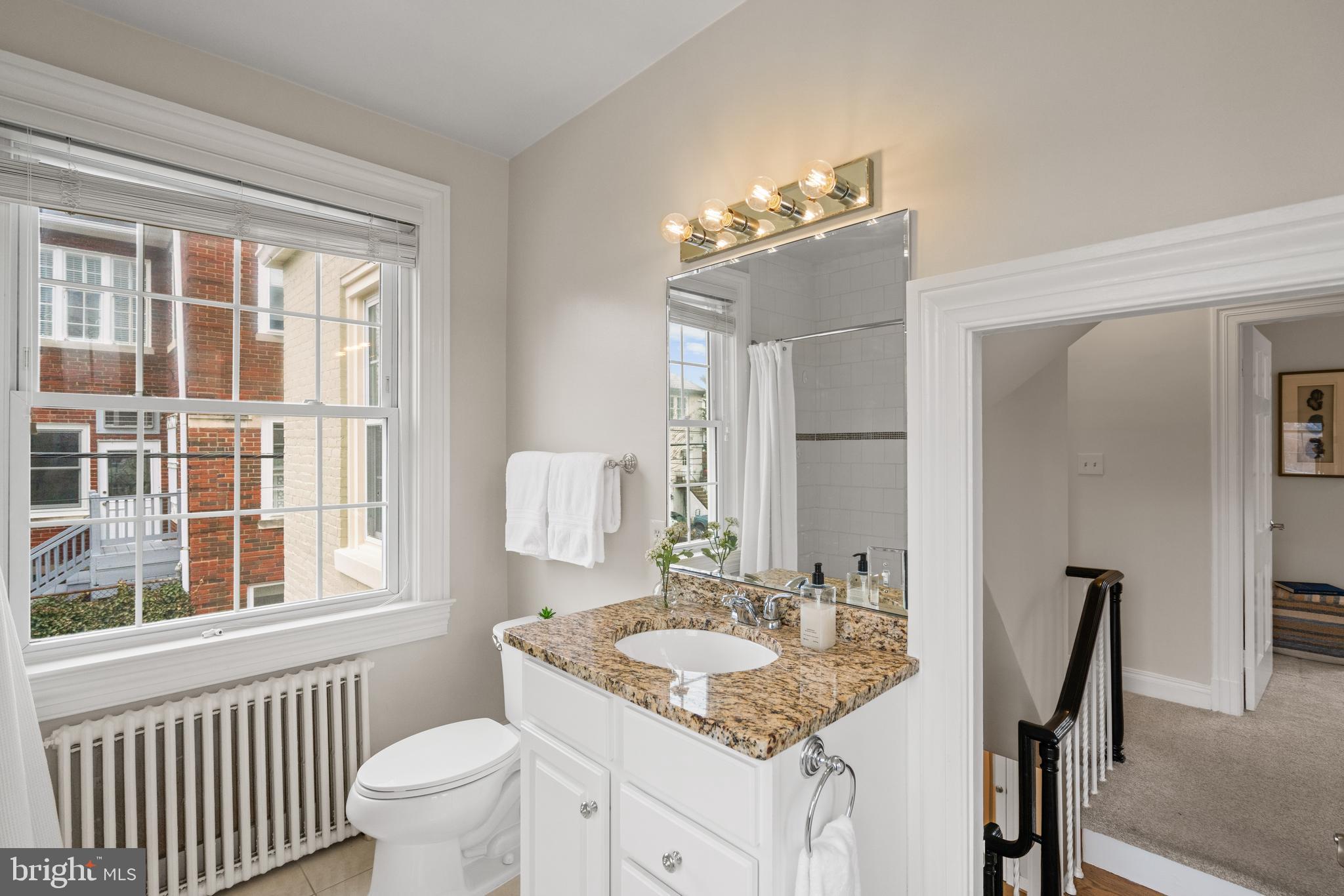 Upstairs, the primary suite is surrounded by windows and offers dual closets and a well-appointed bathroom with a double vanity, frameless glass shower, and tile finishes. Two additional bedrooms, share a hall bathroom with dual sinks. A finished third level provides flexible space ideal for a fourth bedroom, or recreation room, complete with built-in shelving and integrated desk space.