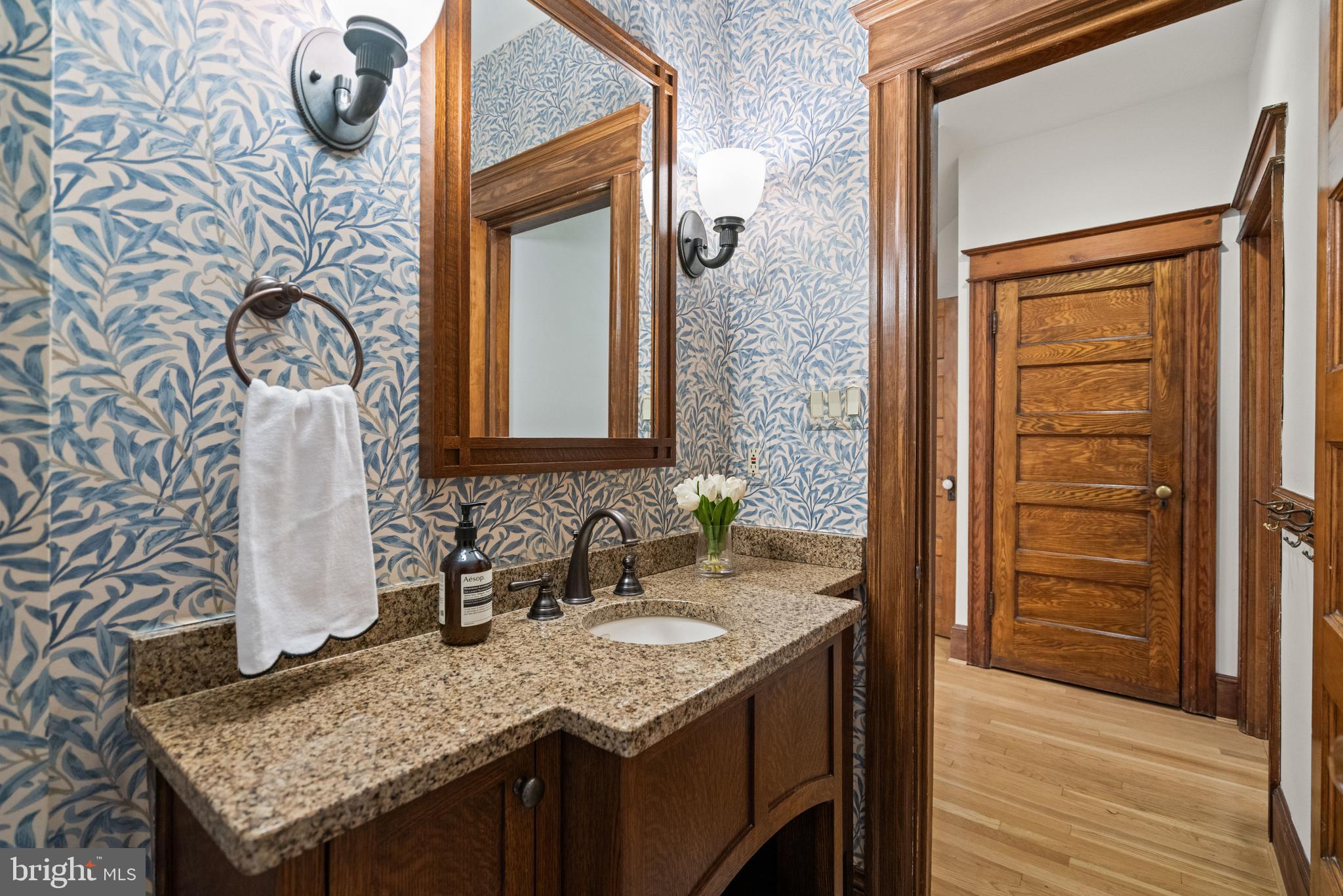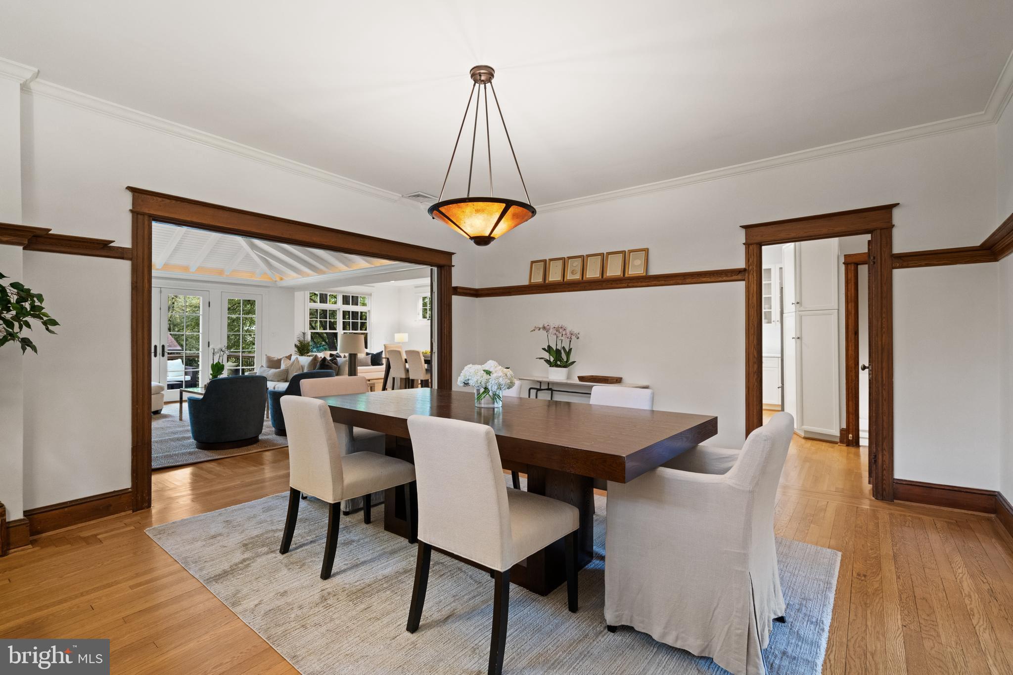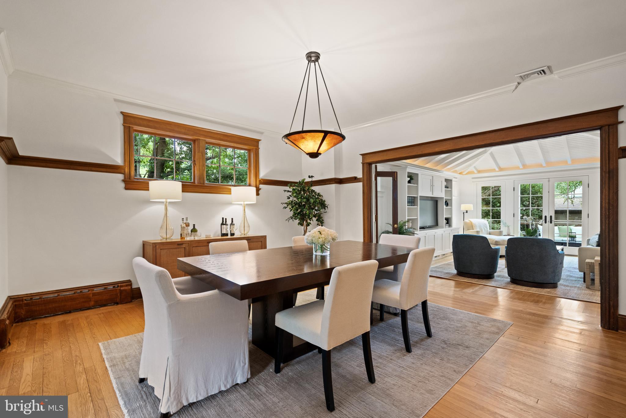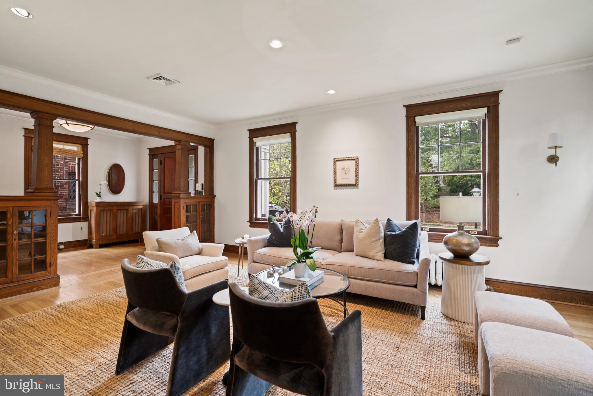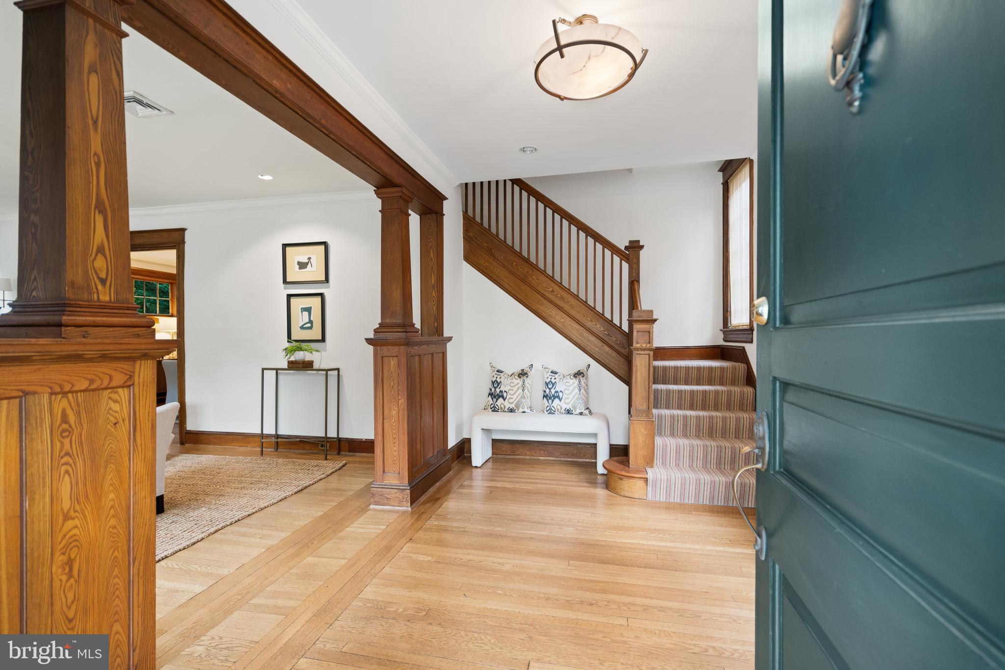 Ideally positioned in one of Washington's most desirable neighborhoods, this beautifully renovated and expanded 1915 home in Chevy Chase, D.C. masterfully blends original architectural character with sophisticated modern updates. Introduced by a manicured front garden and a stone walkway, the shingle-style exterior sets a welcoming and timeless tone. Inside, the home showcases striking original millwork, from hand-carved wood stair railings and graceful wooden columns to rich hardwood trim and detailing that highlight the home's enduring craftsmanship. These timeless features have been impeccably preserved, offering a warm, elegant backdrop throughout the main living spaces.
