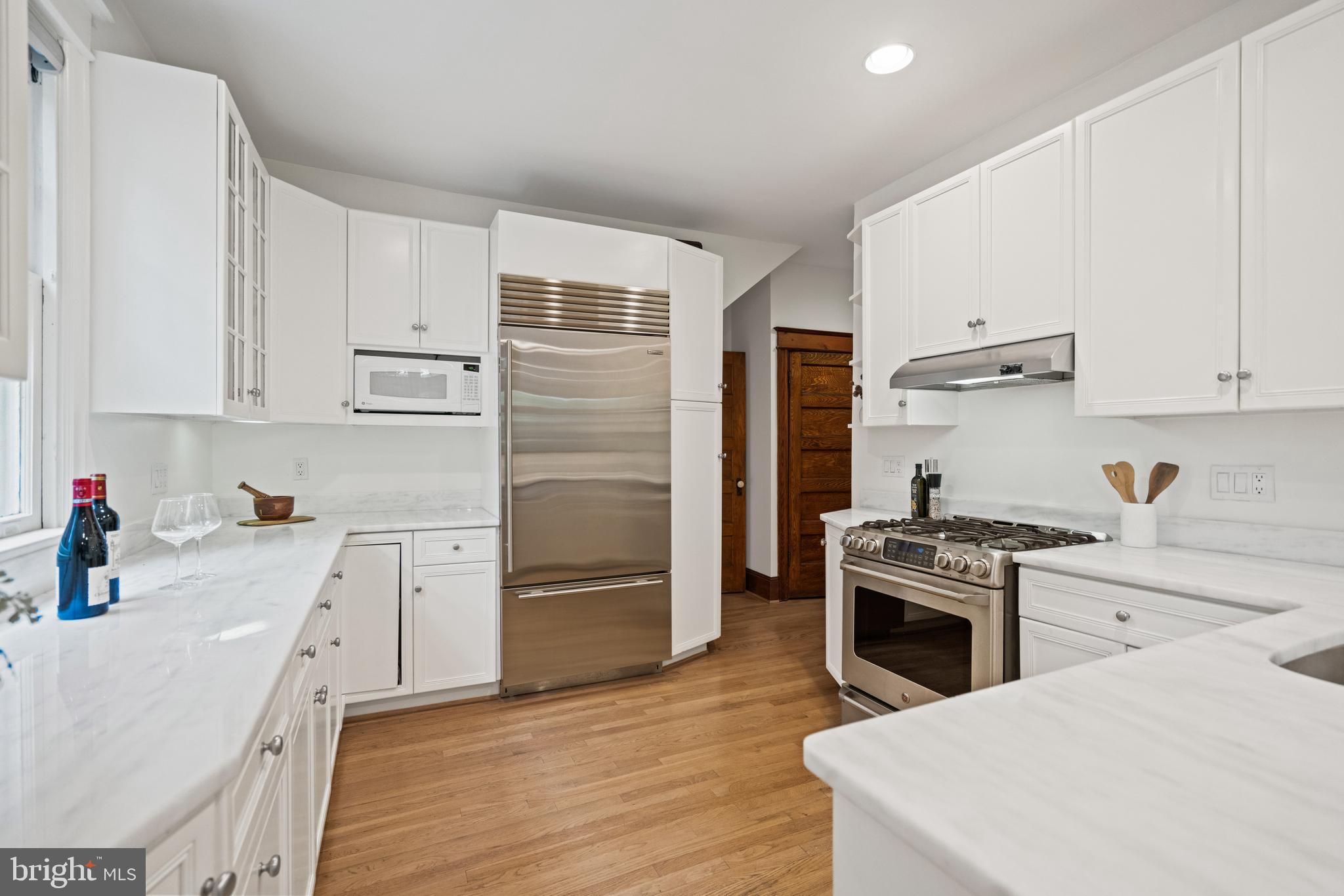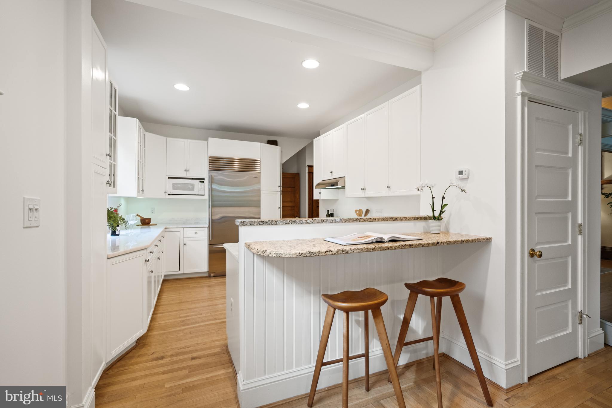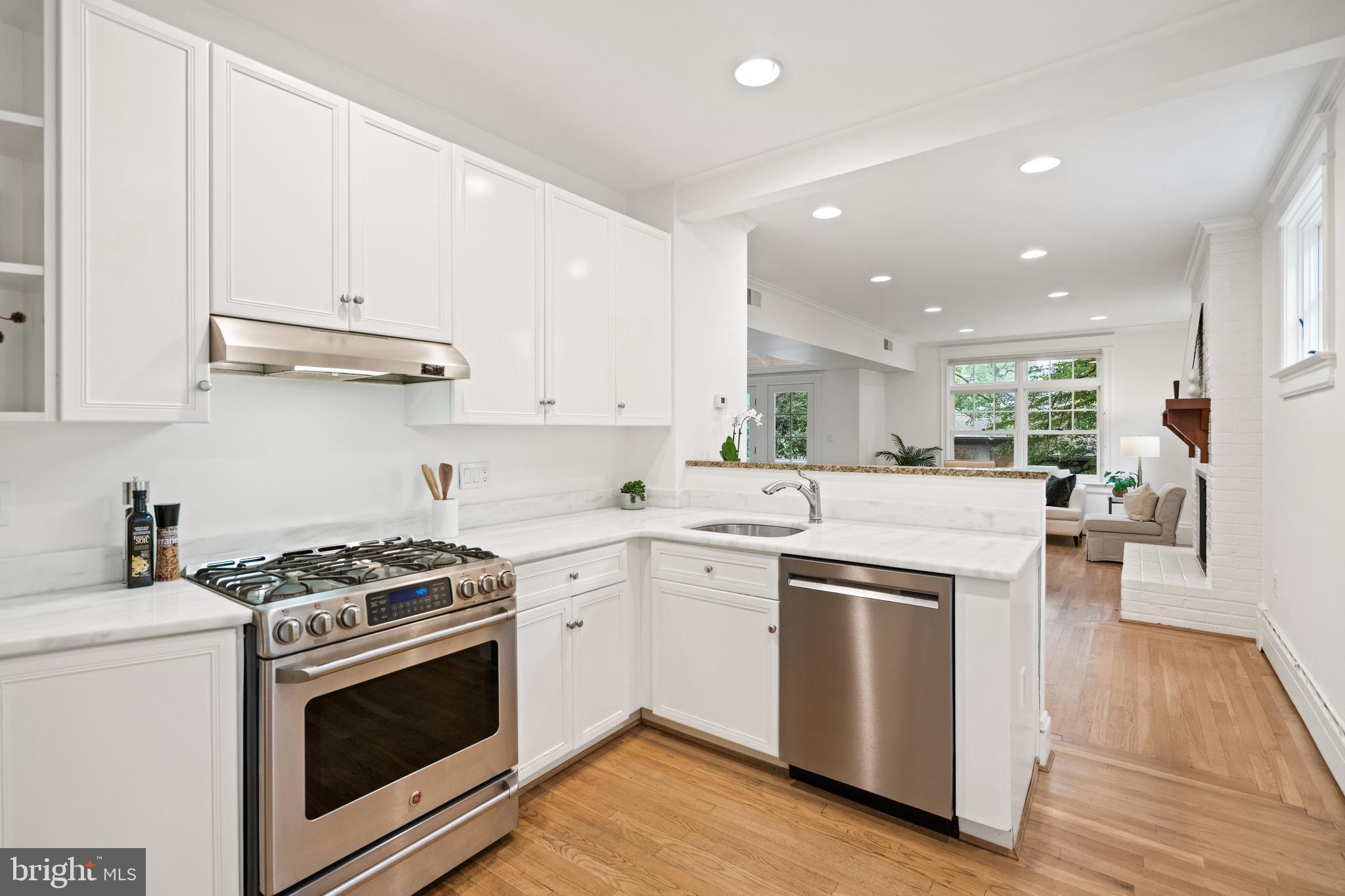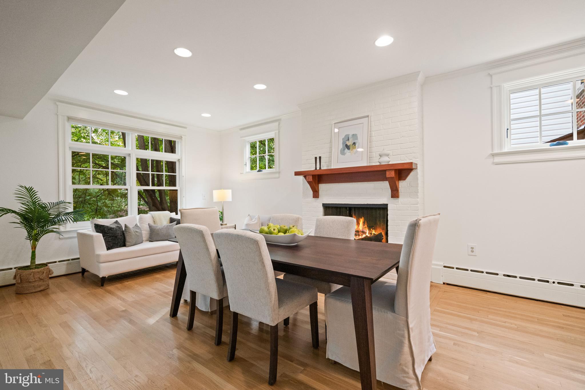 The gourmet kitchen blends sleek design with functional sophistication, featuring marble countertops, custom cabinetry, and a breakfast bar that invites casual dining. It is equipped with a suite of stainless steel appliances, including a multi-burner stove, hooded range, and a Sub-Zero refrigerator and freezer. Off the kitchen, a second dining area features an inviting fireplace with a timeless mantel, creating an elegant and intimate setting. A convenient nearby powder room completes the main level.