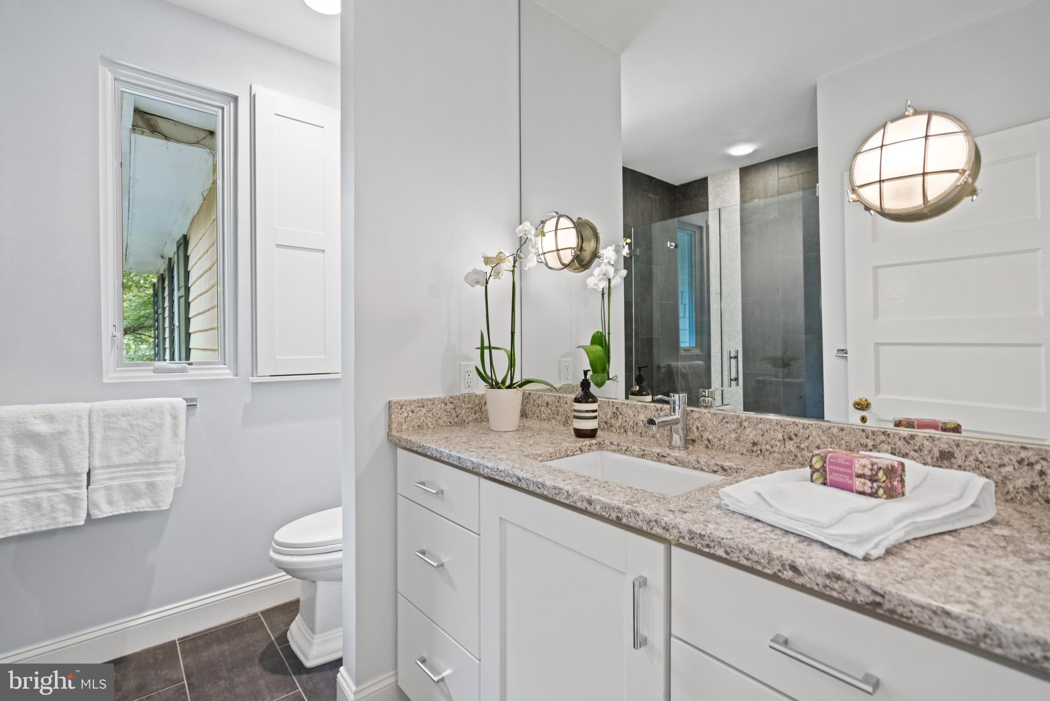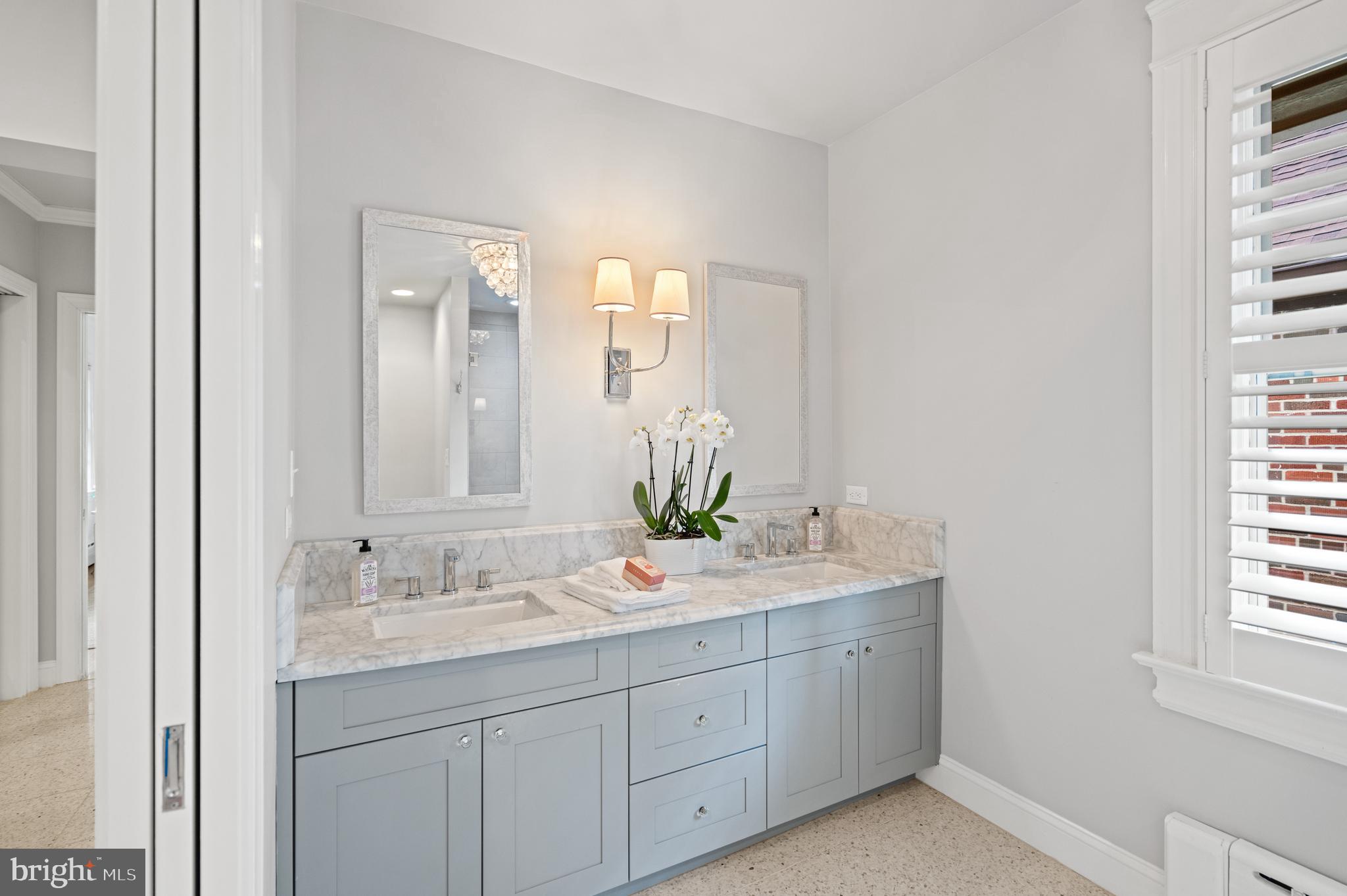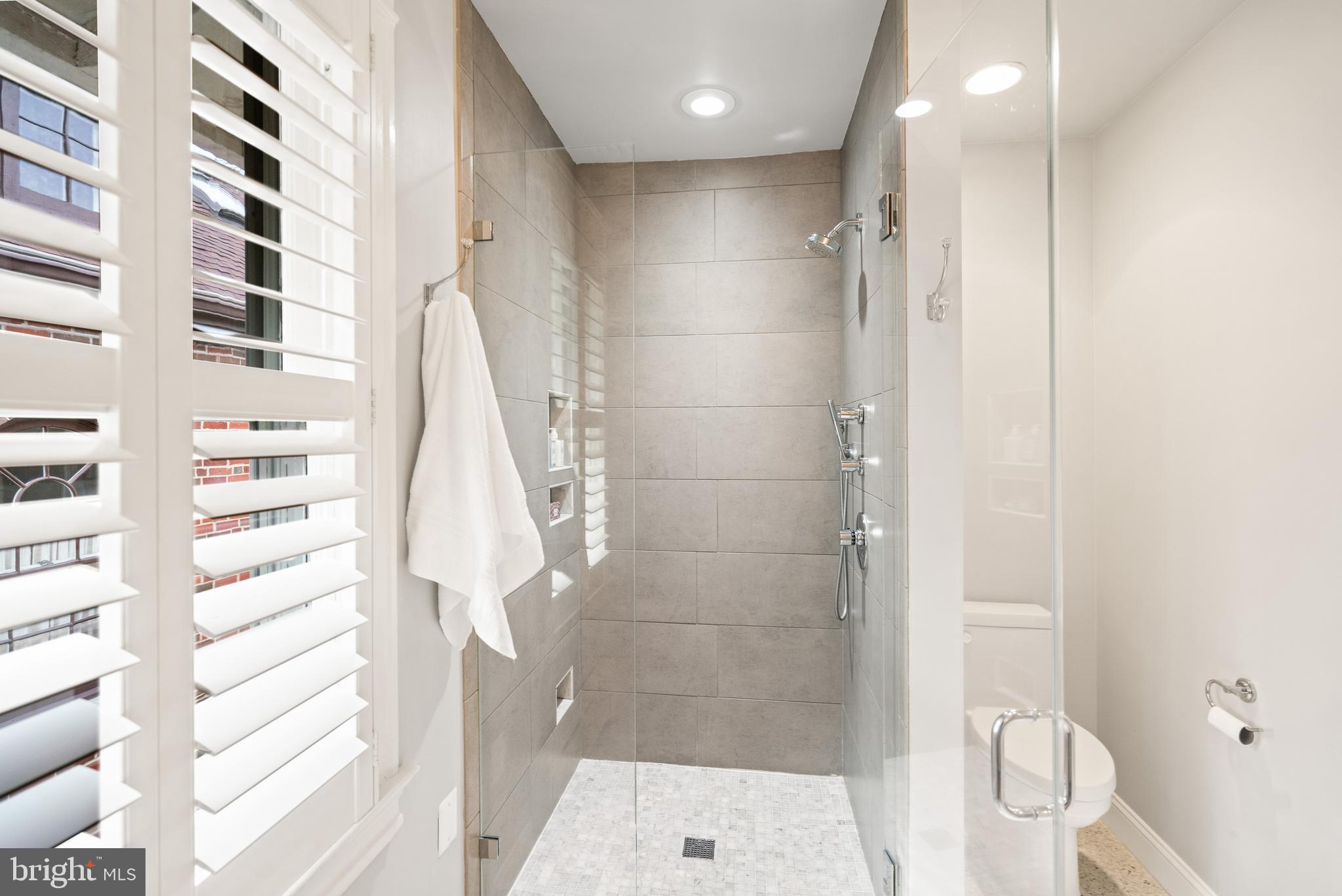 Upstairs, the luxurious primary suite offers treetop views through large windows, a custom walk-in closet, and a spa-inspired bathroom with dual vanities and a frameless glass shower. Three additional bedrooms feature sunny exposures, hardwood floors, and individual closets. The upper level is enhanced by a beautifully renovated hall bathroom, along with a linen closet and walk-up attic that provide extra storage.