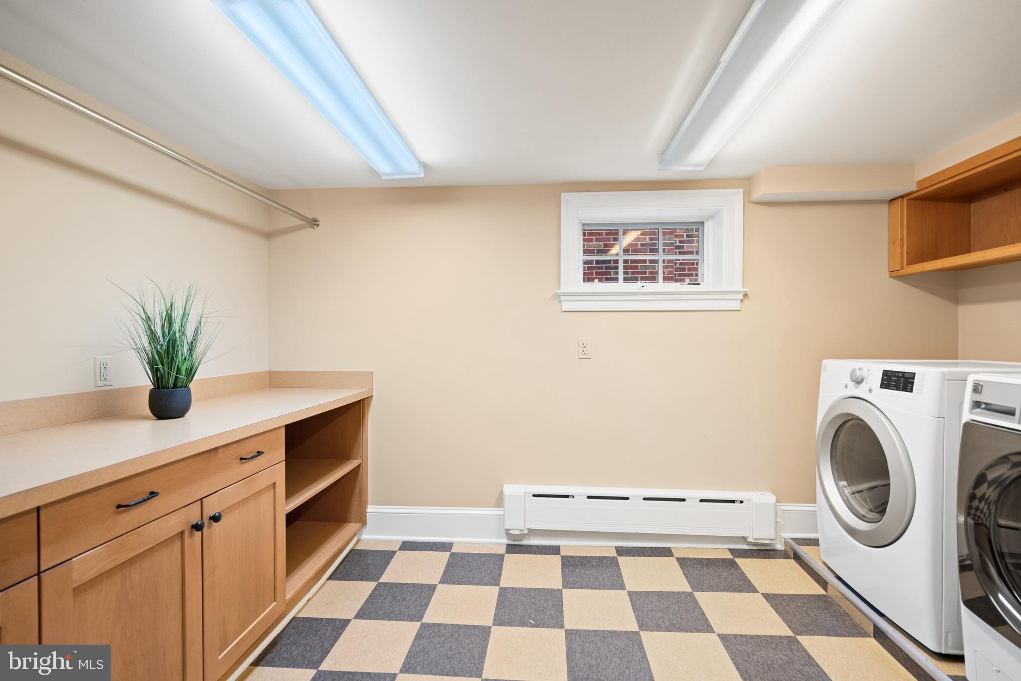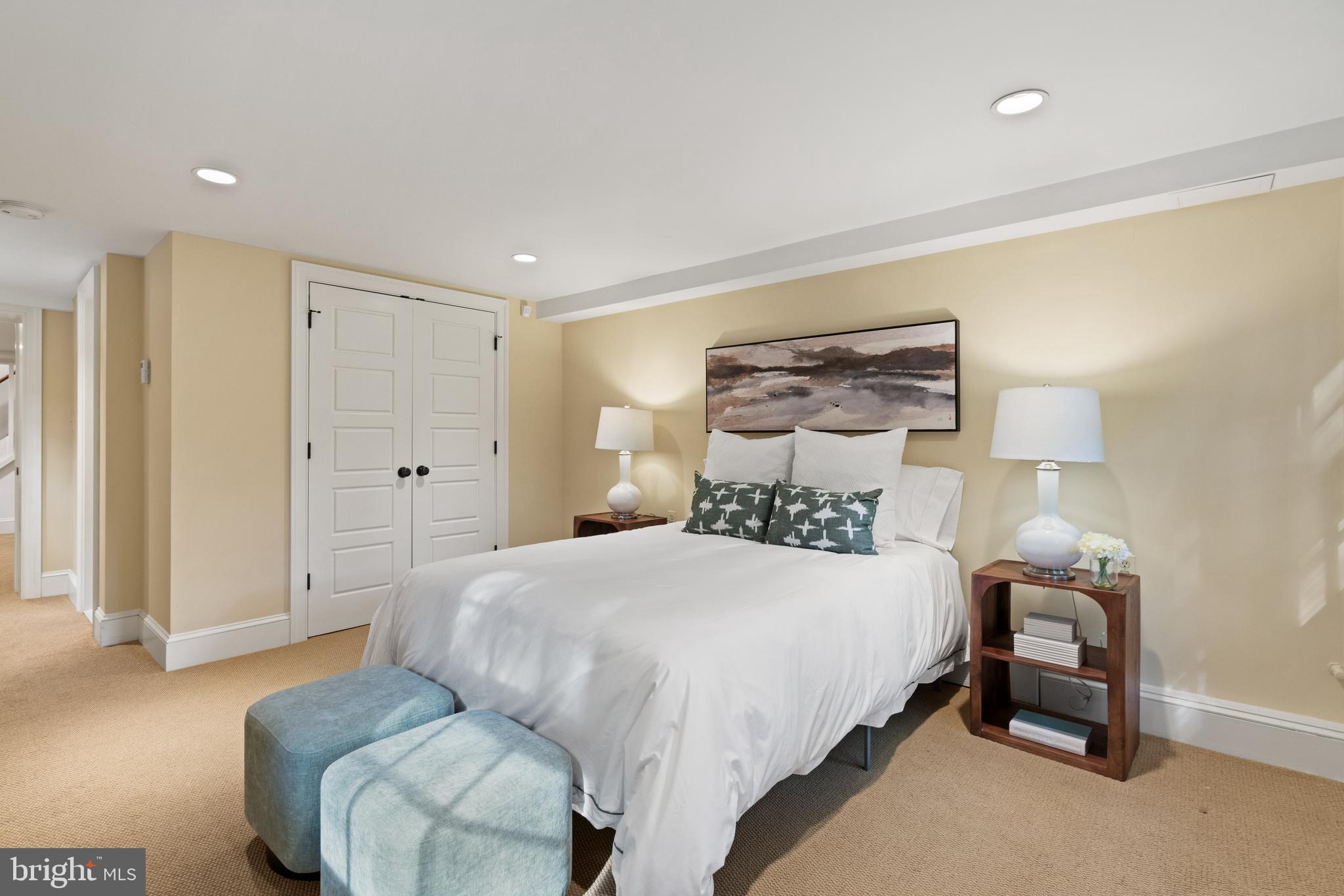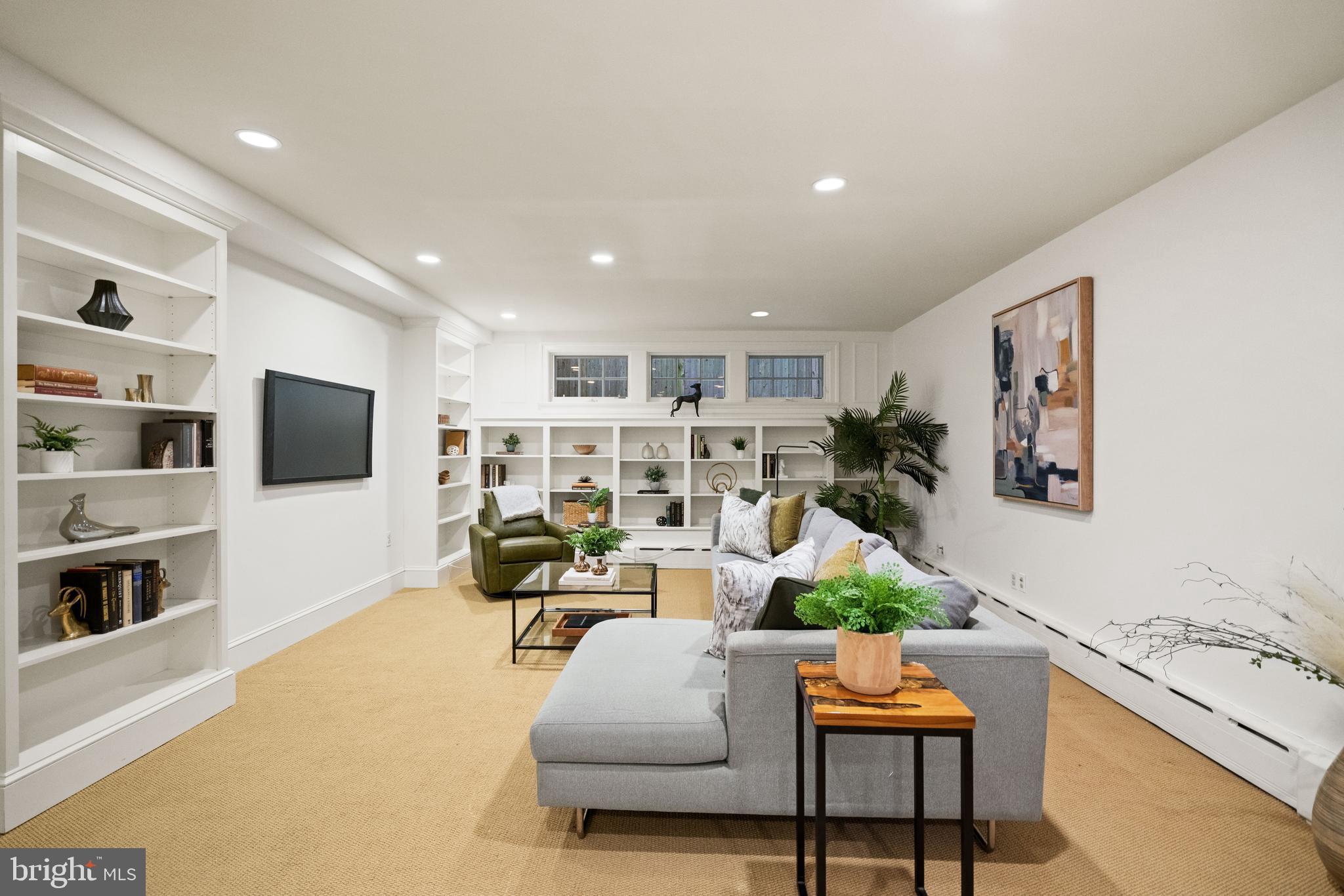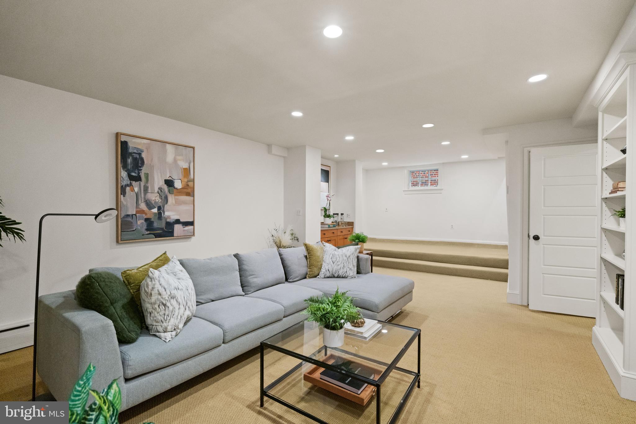 The fully finished lower level offers exceptional flexibility with a large recreation room featuring floor-to-ceiling built-in shelving, an additional bedroom and full bathroom, and a dedicated laundry room with a folding counter and utility sink.