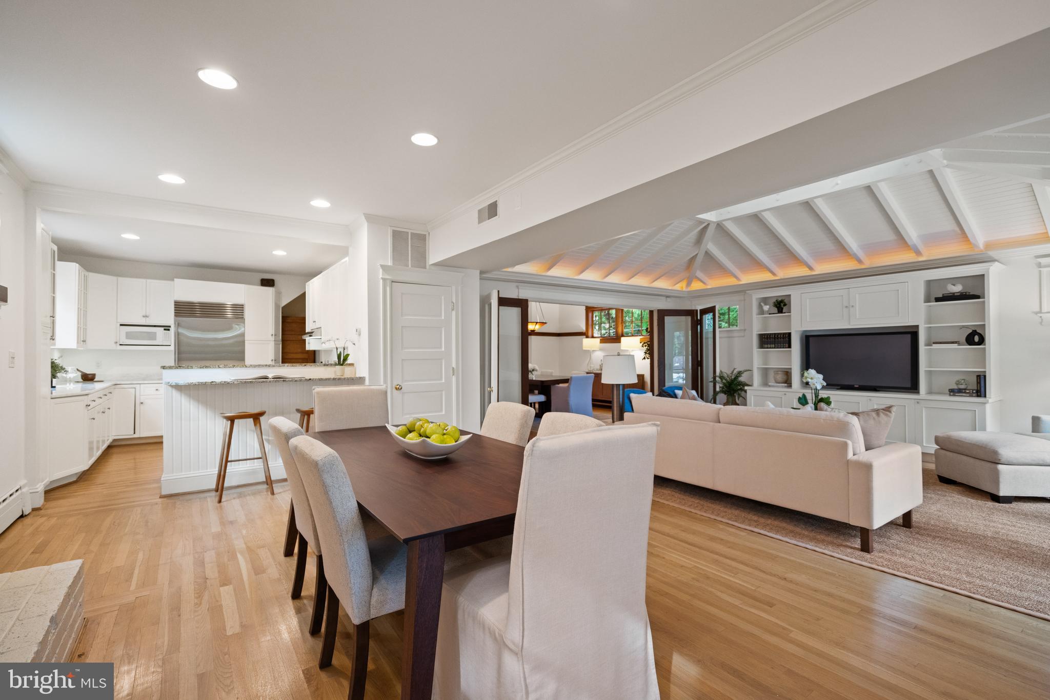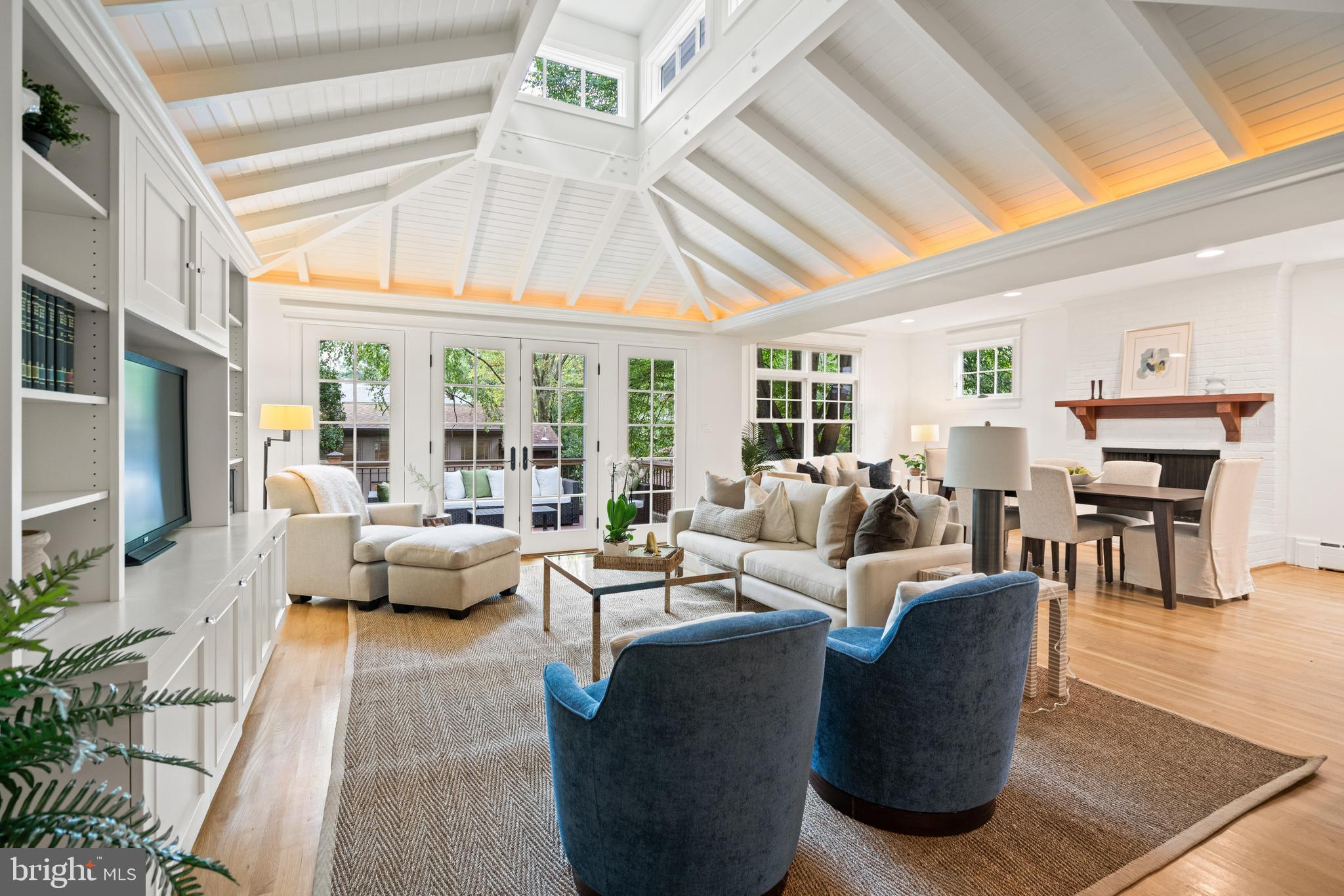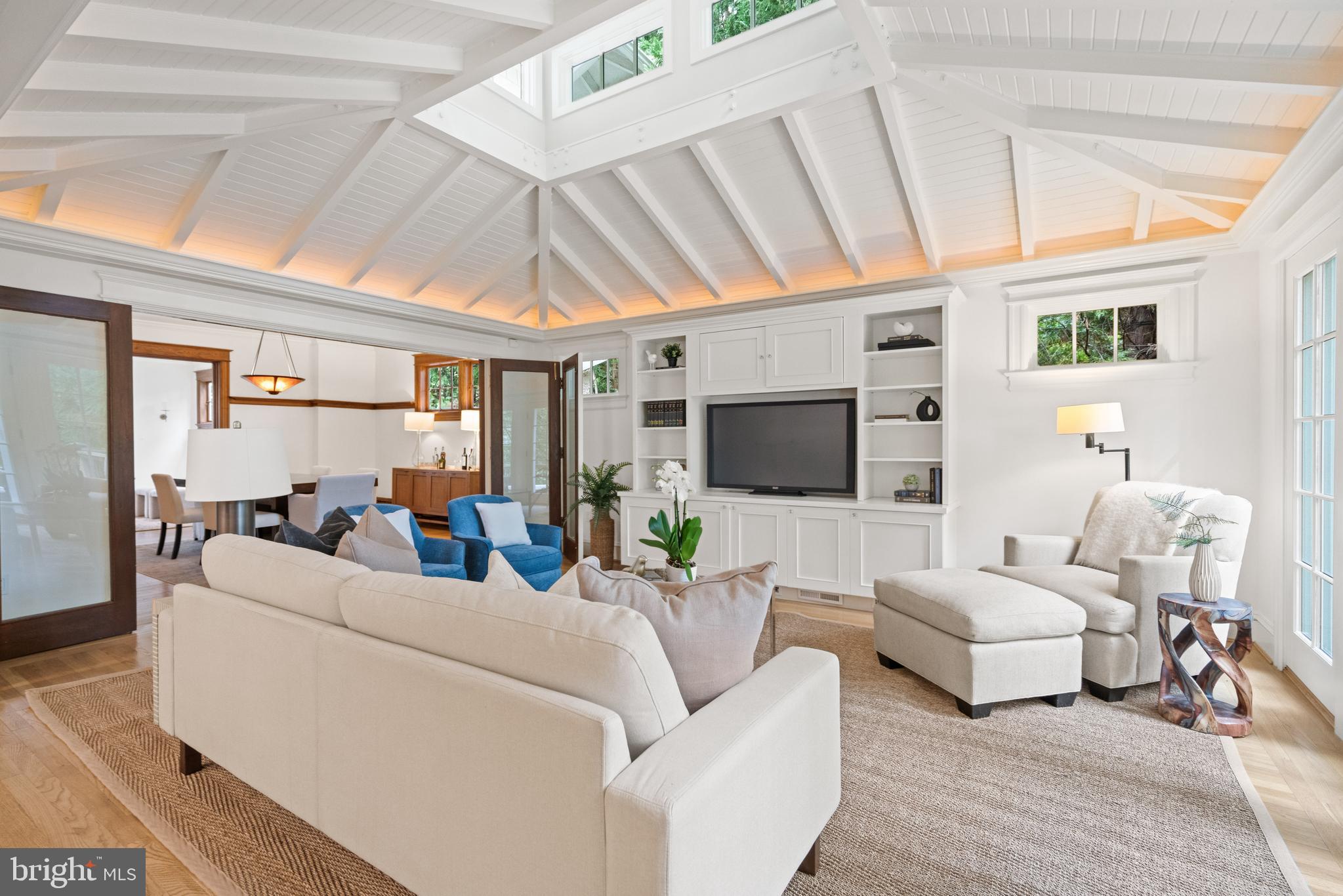 The sun-filled living room features oversized windows, a marble fireplace framed by an intricately carved wood surround, and custom built-in cabinetry with glass-front doors. The formal dining room, with its generous proportions and tall ceilings, flows seamlessly from the living space in a semi-open layout. Adjoining, a spacious family room serves as a tranquil retreat with vaulted ceilings, shiplap detail, built-in shelves with a media console, and French doors that open to a serene deck overlooking the lush and private backyard.