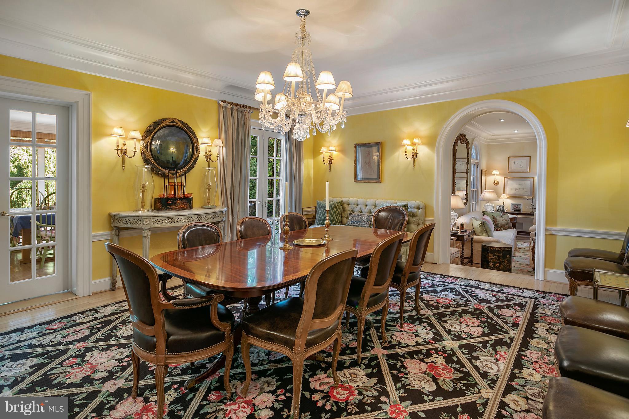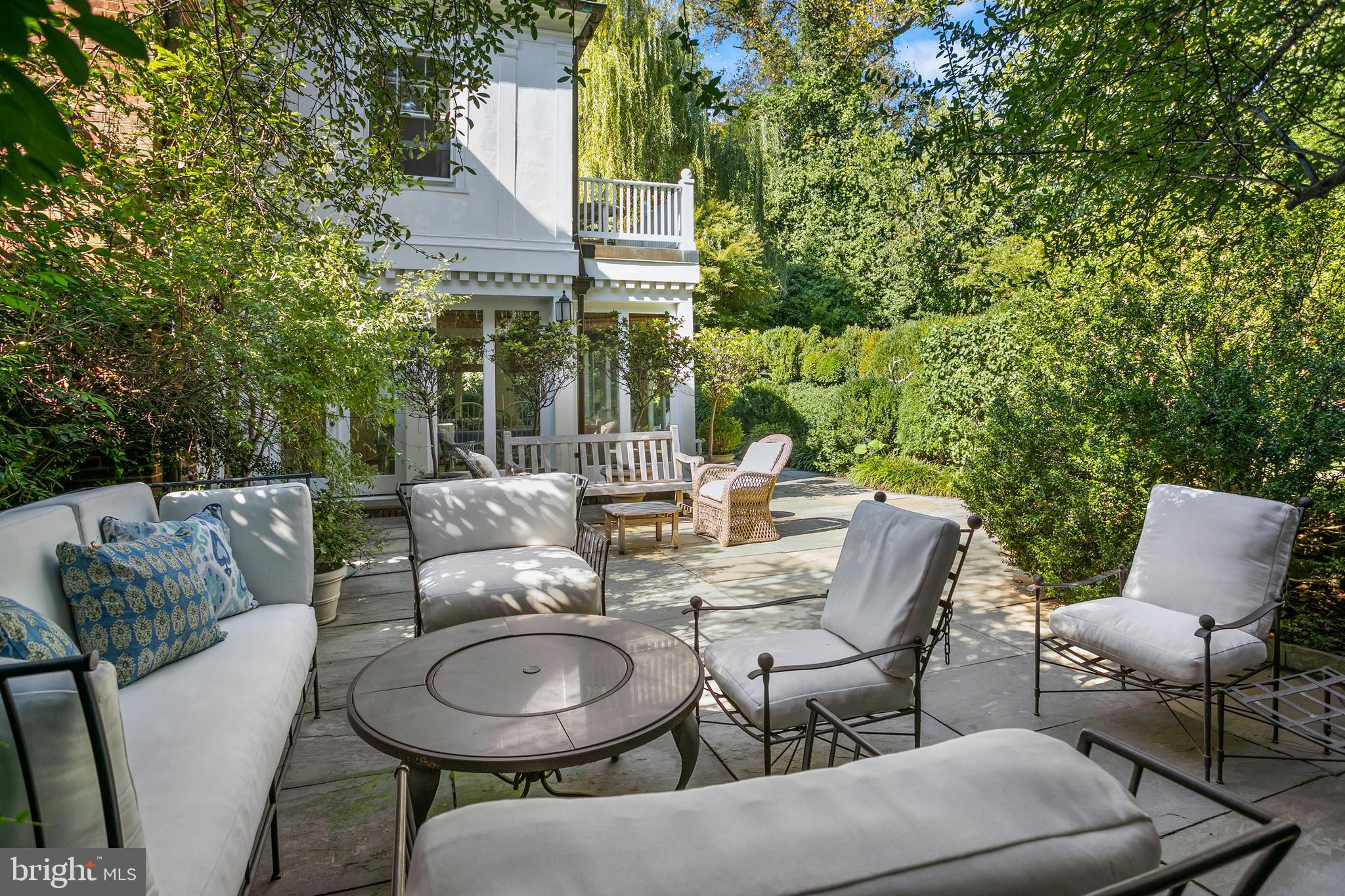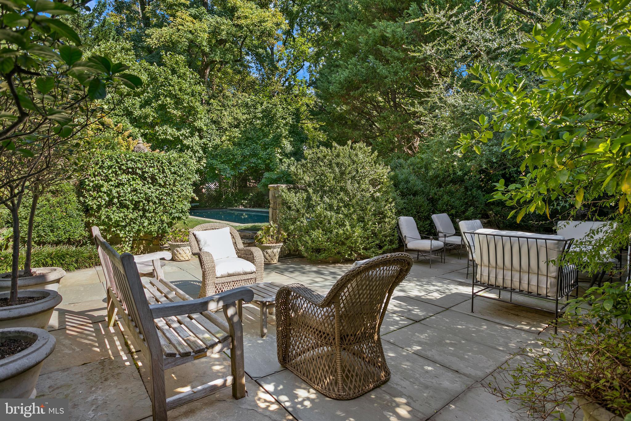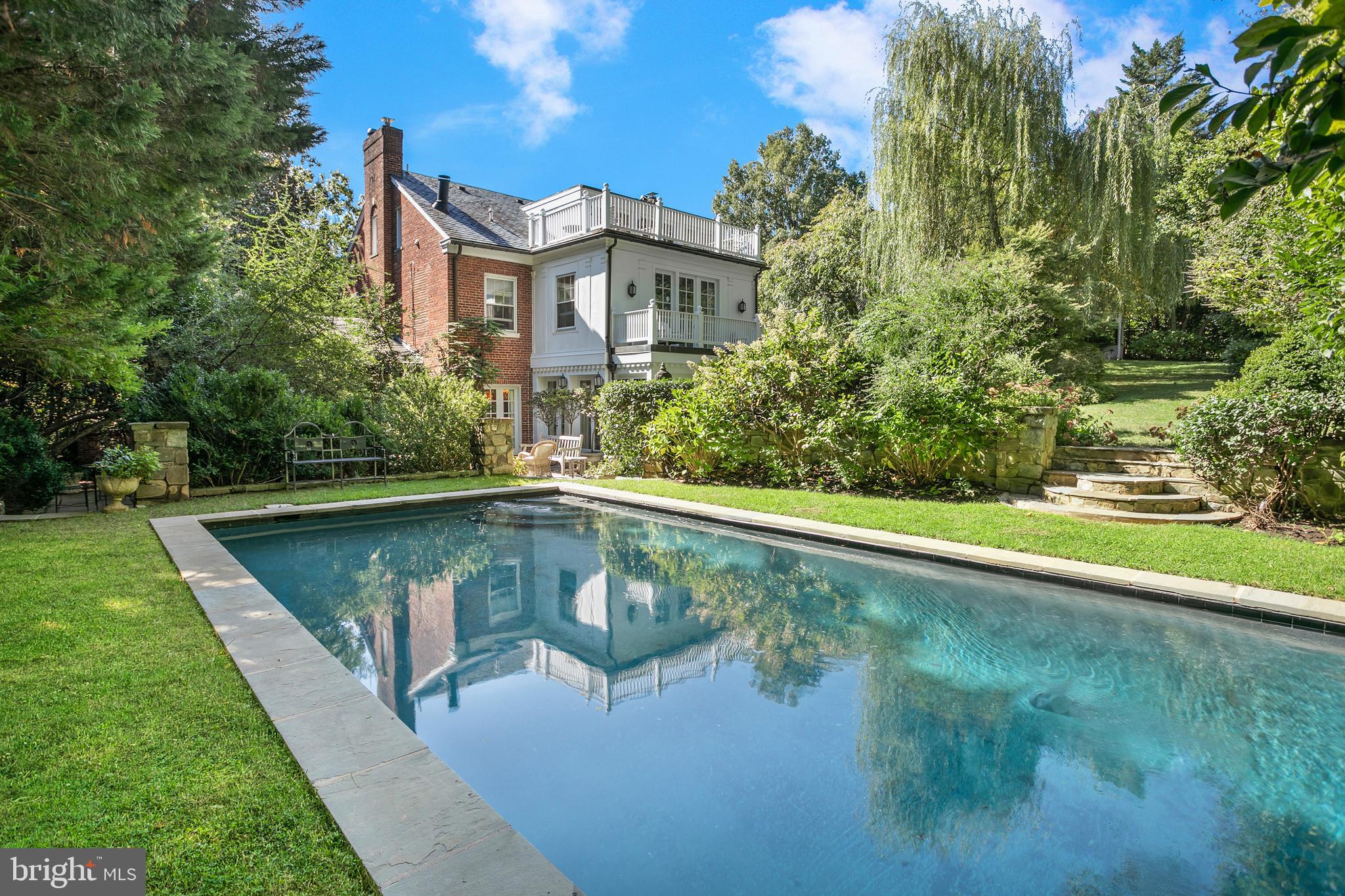 This stately 1927 Georgian Revival is located on a highly desirable street in the sought-after Wesley Heights neighborhood. The beautiful house is set back from the street behind a row of manicured hedges, providing wonderful privacy. The impressive home sits on over half an acre lot, with beautifully designed gardens and a pool. The charming interior features generously proportioned entertaining rooms, as well comfortable family living spaces, professionally designed by William Hodgins. The elegant rooms are light-filled, with an abundance of natural sunlight coming from large windows throughout. There is also the added convenience of an elevator to three floors. The magnificent reception foyer features handsome moldings and cornices, as well as intricately detailed wood floors. The entry foyer seamlessly transitions to the sophisticated living room, which offers a lovely central fireplace with an eighteenth-century French limestone mantle, attractive arched transom windows, and French doors to the terrace. The neighboring dining room, which can also be accessed from the reception foyer, is exceptionally scaled and enhanced with thick crown moldings. The dining room provides direct access to the enchanting sunroom, which provides a garden ambiance and is fully windowed on three sides, affording stunning views of the rear garden and lovely water feature. The gourmet kitchen offers a large center island with a breakfast bar, abundant cabinetry storage, and a Viking six-burner range. There is also an elegant library on this floor, which has an additional fireplace and a convenient powder room. Completing the main level is a side entrance that provides access to a bedroom suite, nanny's bedroom, the one-car garage, and the lower level. The second level has three bedrooms and three full bathrooms, including the gracious primary suite. The primary bedroom is well-appointed with a private balcony, en-suite bathroom, and a generous walk-in closet. There is also an adjoining sitting room, complemented with a fireplace and built-in bookshelves. The two additional bedrooms on this floor are both spacious and have en-suite bathrooms. The third floor provides a large open flexible-use space with an impressive roof deck. The room is currently being used as a bedroom, providing a large walk-in dressing room and an updated full bathroom. The lower level has a family room with built-ins, a secondary kitchenette with a breakfast bar, multiple large storage rooms, a sizable laundry room with a utility sink and storage, and a full bathroom with a frameless glass shower. This extraordinary residence is exceptional for entertaining with multiple terraced seating areas, a pool, water fountain feature, rear yard, mature trees, and lush professional landscaping. The house is within walking distance to neighborhood favorite restaurants, shops, and parks.