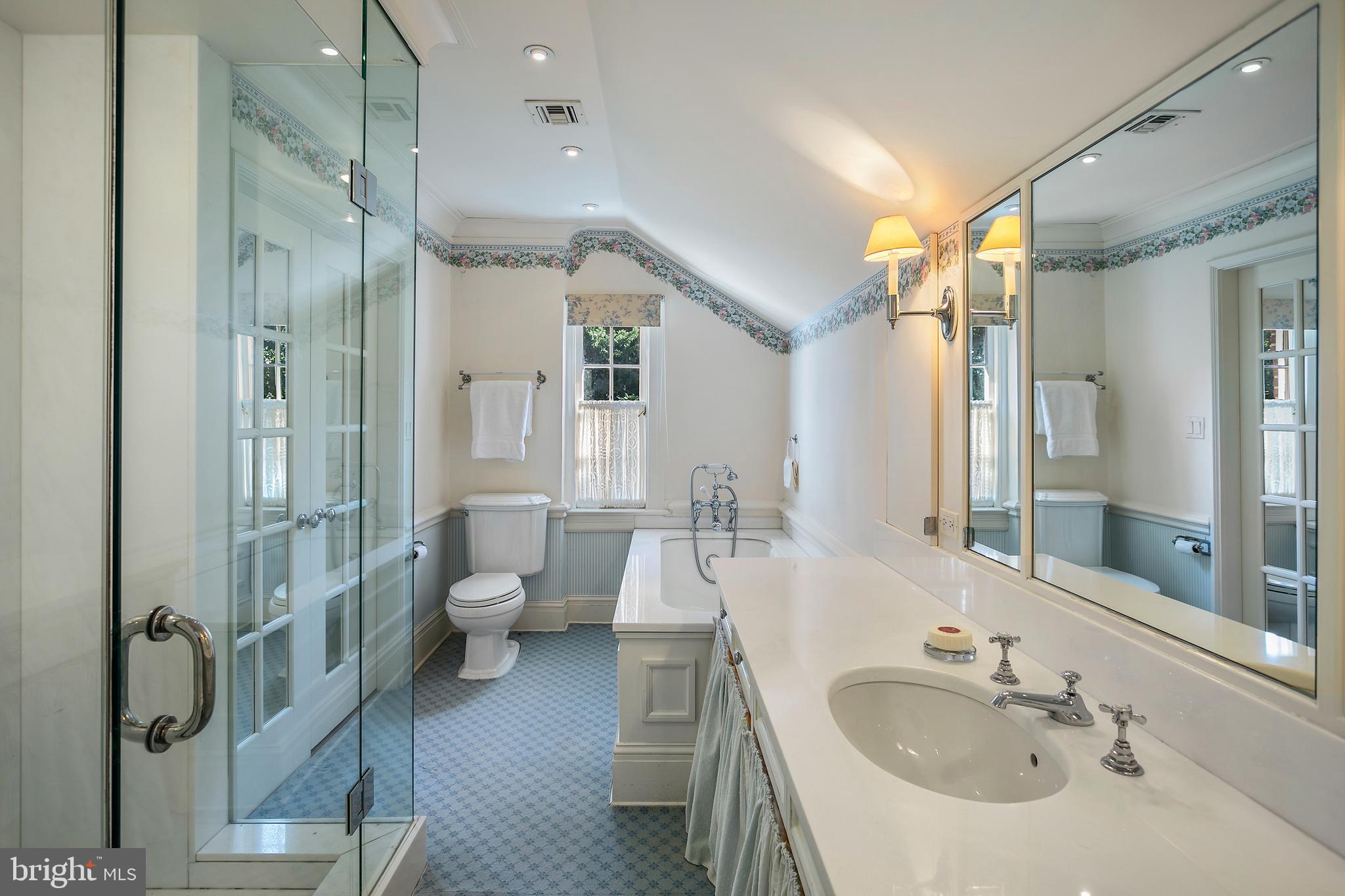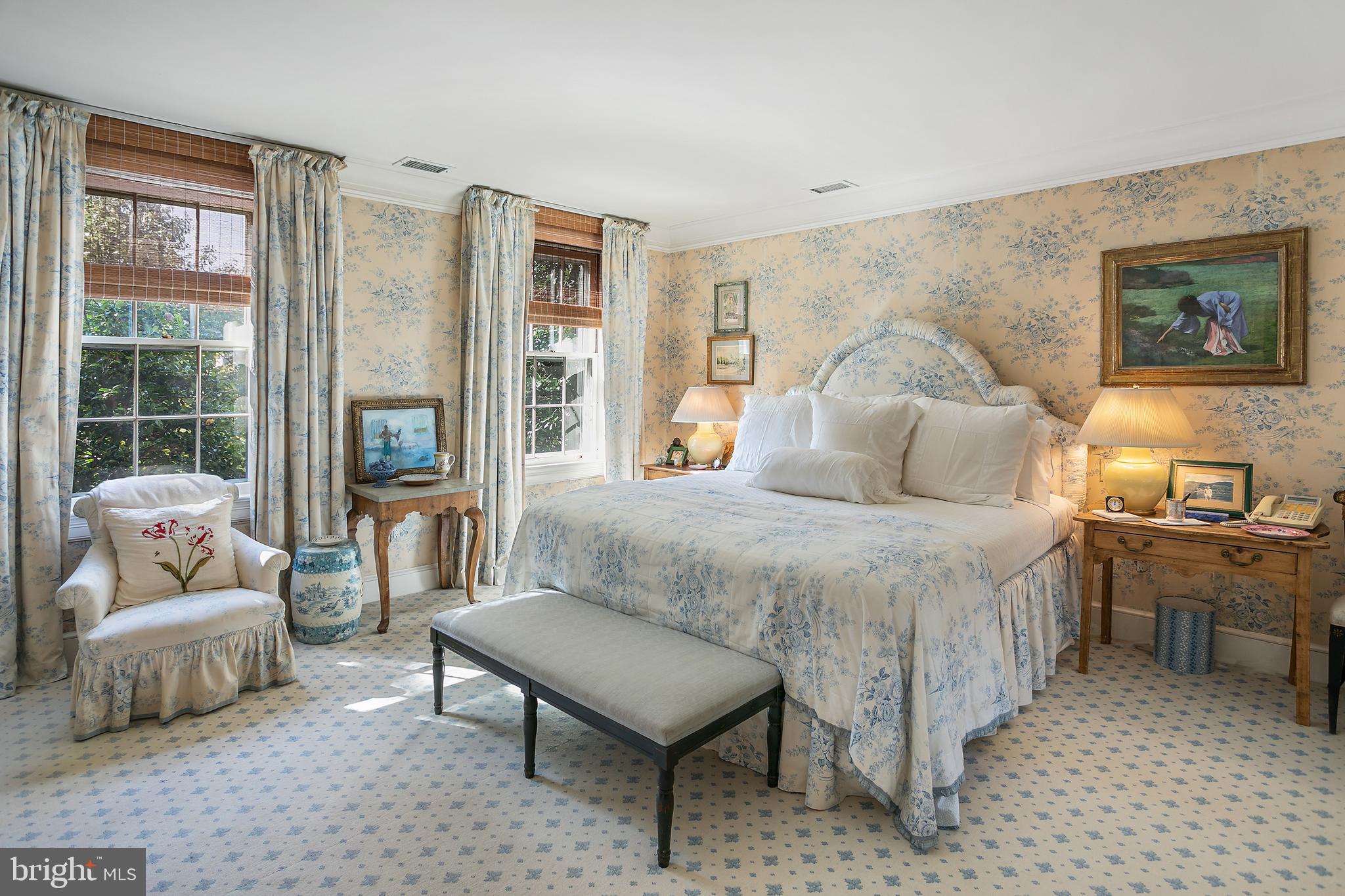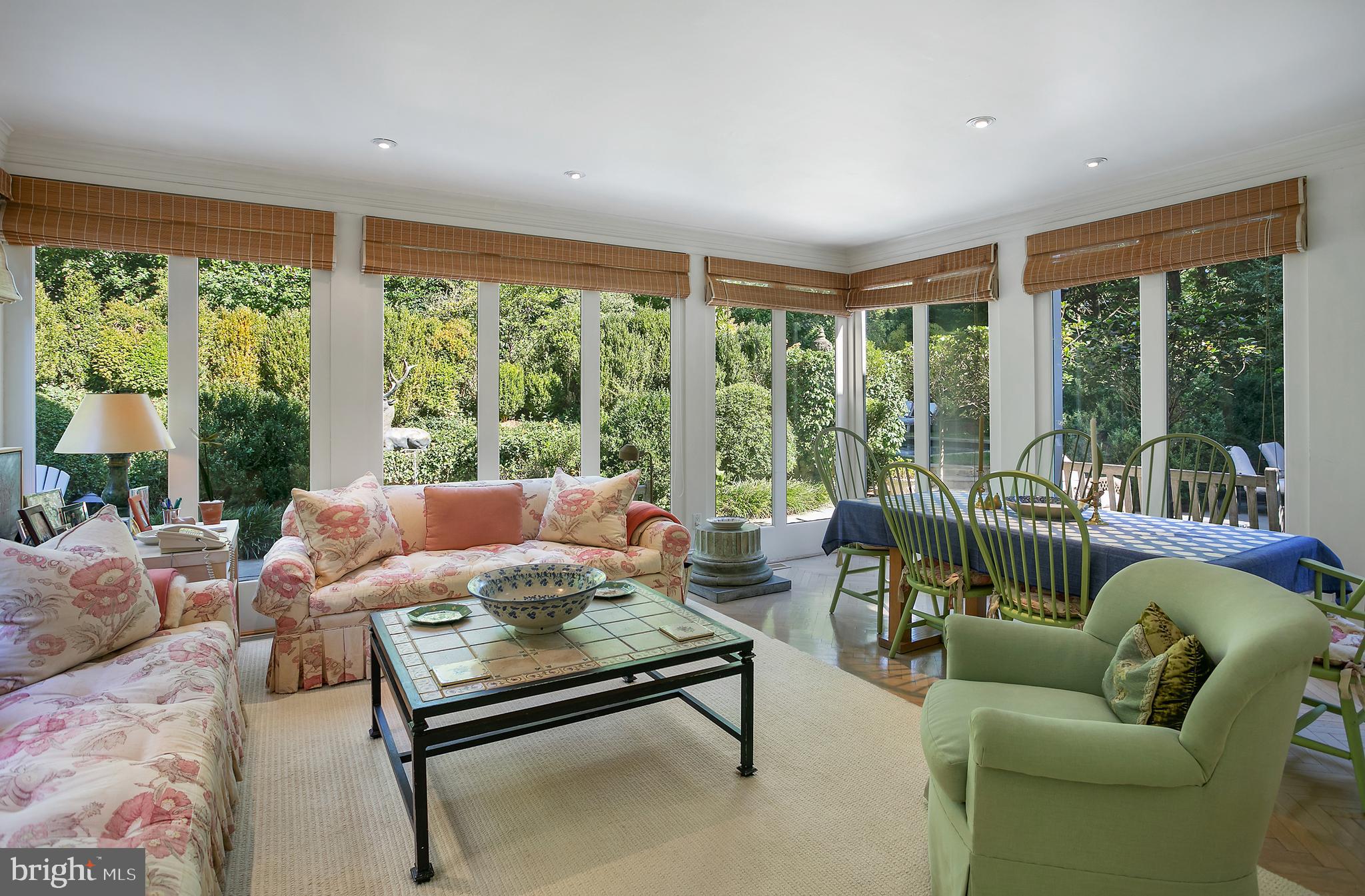 This stately 1927 Georgian Revival is located on a highly desirable street in the sought-after Wesley Heights neighborhood. The beautiful house is set back from the street behind a row of manicured hedges, providing wonderful privacy. The impressive home sits on over half an acre lot, with beautifully designed gardens and a pool. The charming interior features generously proportioned entertaining rooms, as well comfortable family living spaces, professionally designed by William Hodgins. The elegant rooms are light-filled, with an abundance of natural sunlight coming from large windows throughout. There is also the added convenience of an elevator to three floors. The magnificent reception foyer features handsome moldings and cornices, as well as intricately detailed wood floors. The entry foyer seamlessly transitions to the sophisticated living room, which offers a lovely central fireplace with an eighteenth-century French limestone mantle, attractive arched transom windows, and French doors to the terrace. The neighboring dining room, which can also be accessed from the reception foyer, is exceptionally scaled and enhanced with thick crown moldings. The dining room provides direct access to the enchanting sunroom, which provides a garden ambiance and is fully windowed on three sides, affording stunning views of the rear garden and lovely water feature. The gourmet kitchen offers a large center island with a breakfast bar, abundant cabinetry storage, and a Viking six-burner range. There is also an elegant library on this floor, which has an additional fireplace and a convenient powder room. Completing the main level is a side entrance that provides access to a bedroom suite, nanny's bedroom, the one-car garage, and the lower level. The second level has three bedrooms and three full bathrooms, including the gracious primary suite. The primary bedroom is well-appointed with a private balcony, en-suite bathroom, and a generous walk-in closet. There is also an adjoining sitting room, complemented with a fireplace and built-in bookshelves. The two additional bedrooms on this floor are both spacious and have en-suite bathrooms. The third floor provides a large open flexible-use space with an impressive roof deck. The room is currently being used as a bedroom, providing a large walk-in dressing room and an updated full bathroom. The lower level has a family room with built-ins, a secondary kitchenette with a breakfast bar, multiple large storage rooms, a sizable laundry room with a utility sink and storage, and a full bathroom with a frameless glass shower. This extraordinary residence is exceptional for entertaining with multiple terraced seating areas, a pool, water fountain feature, rear yard, mature trees, and lush professional landscaping. The house is within walking distance to neighborhood favorite restaurants, shops, and parks.