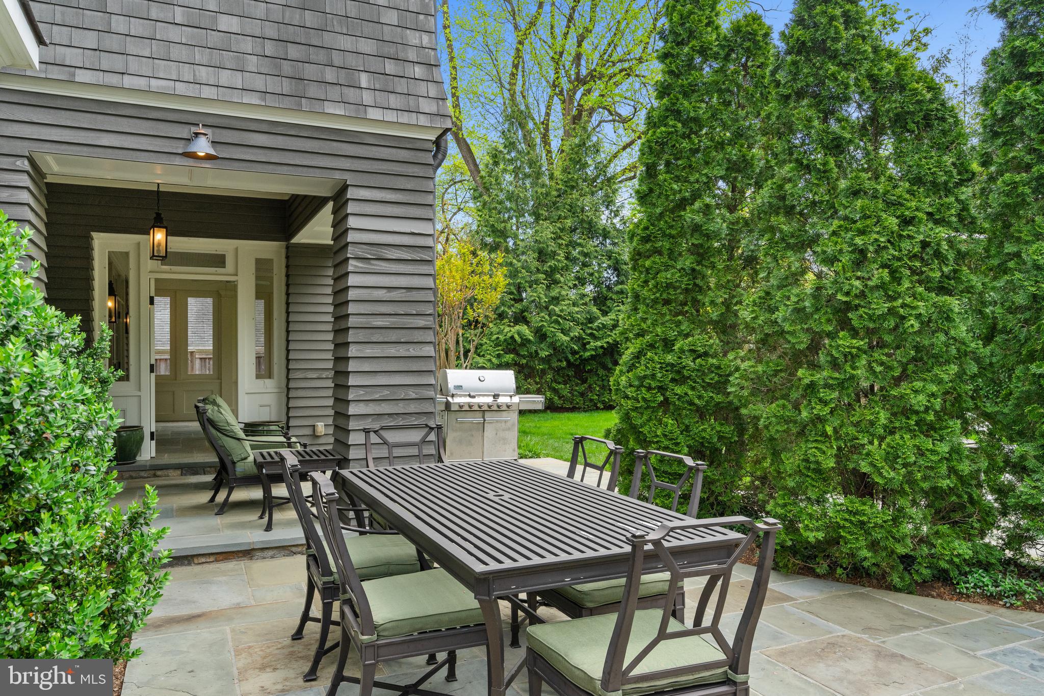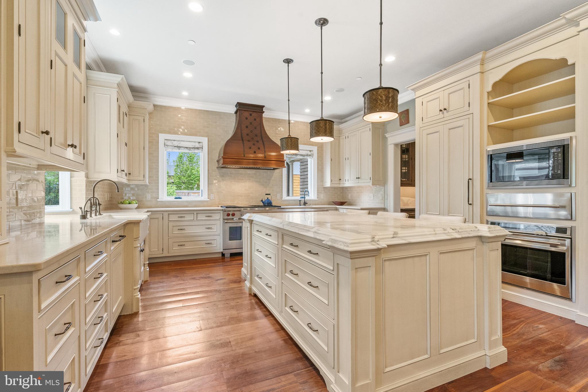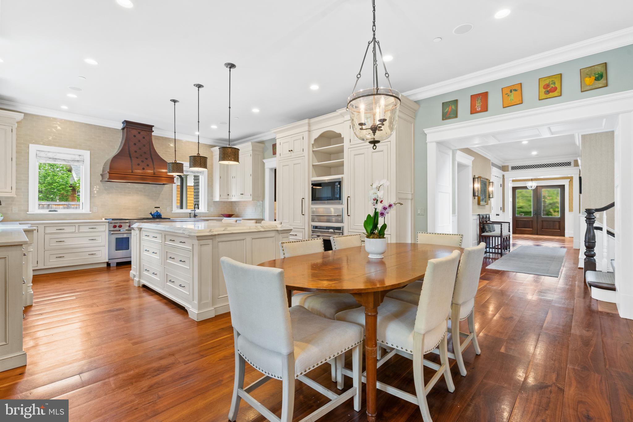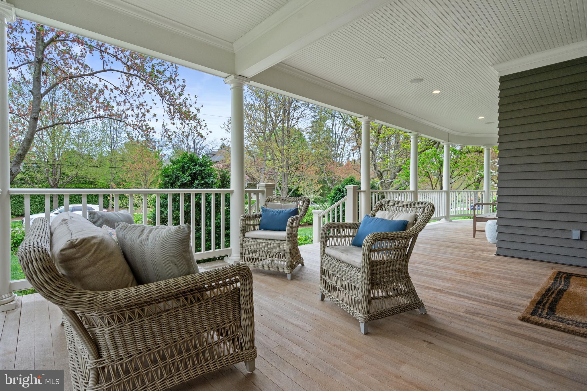 Located within the historic Village of Drummond neighborhood and sited on a flat .36-acre lot, this stunning residence boasts exceptional curb appeal, highlighted by its distinctive turret and an inviting wrap-around front porch. Constructed in 2010 by the renowned Jim Gibson and Sandy Spring Builders, this home spans over 8,000 square feet of meticulously designed and crafted interior living space, marrying timeless elegance with the luxuries of modern-day living. Upon entry, the home greets you with a gracious foyer complemented with inlay wood floors, thick crown moldings, paneled walls, and expansive sightline views through to the rear of the property. The main hall, featuring an oversized coat closet, guides you seamlessly into the generously scaled living areas, each designed with meticulous attention to detail. The home's wood-accented office, complete with French doors, opens to a light-filled living room graced by three large windows. The adjacent dining room has a coffered ceiling and sits conveniently near the butler's pantry, which boasts marble countertops and ample storage, ensuring seamless entertaining. The heart of this home is its well-appointed kitchen, featuring a walk-in pantry, a marble center island with a breakfast bar, high-end appliances, including dual Miele refrigerators and freezers, and a deep farmhouse sink with a window overlooking the lovely rear yard. The kitchen adjoins a sunny breakfast are with exterior access and a spacious family room, anchored by a soaring ceiling and elegant fireplace. Additional main level highlights include a screened porch, mudroom, and powder room. Ascending to the second level, you are greeted by three luxurious bedroom suites, plus the luxurious primary. This sanctuary offers an exceptional walk-in dressing room, a private sitting room, a coffee bar with a mini-fridge, and a balcony with serene views of the rear grounds. The en-suite primary bathroom features dual vanities, a multi-feature shower, and a separate soaking tub. The additional bedroom suites are equally impressive, offering ample sunlight and large closets, alongside a convenient hall laundry room. The third floor presents additional living space with another generous bedroom, bathroom, and extensive storage. The lower level is a haven for entertainment and leisure, featuring a large playroom, temperature-controlled wine cellar, media room with a gas fireplace, gym, an additional bedroom, a full bathroom, and large storage room. Outside, the residence showcases beautifully landscaped gardens, multiple terraces, mature trees, a fire pit area, and an irrigation system, ensuring a picturesque setting for outdoor enjoyment. Security is paramount for this home, with wrought iron fencing and an automatic gate. Also, a detached two-car garage and additional driveway parking accommodate multiple vehicles. This remarkable residence is a testament to unparalleled craftsmanship and design, offering a blend of luxury, comfort, and sophistication in one of the most coveted neighborhoods in Montgomery County. The location is walking distance to parks, trails, Metro, and restaurants and shopping in downtown Bethesda.