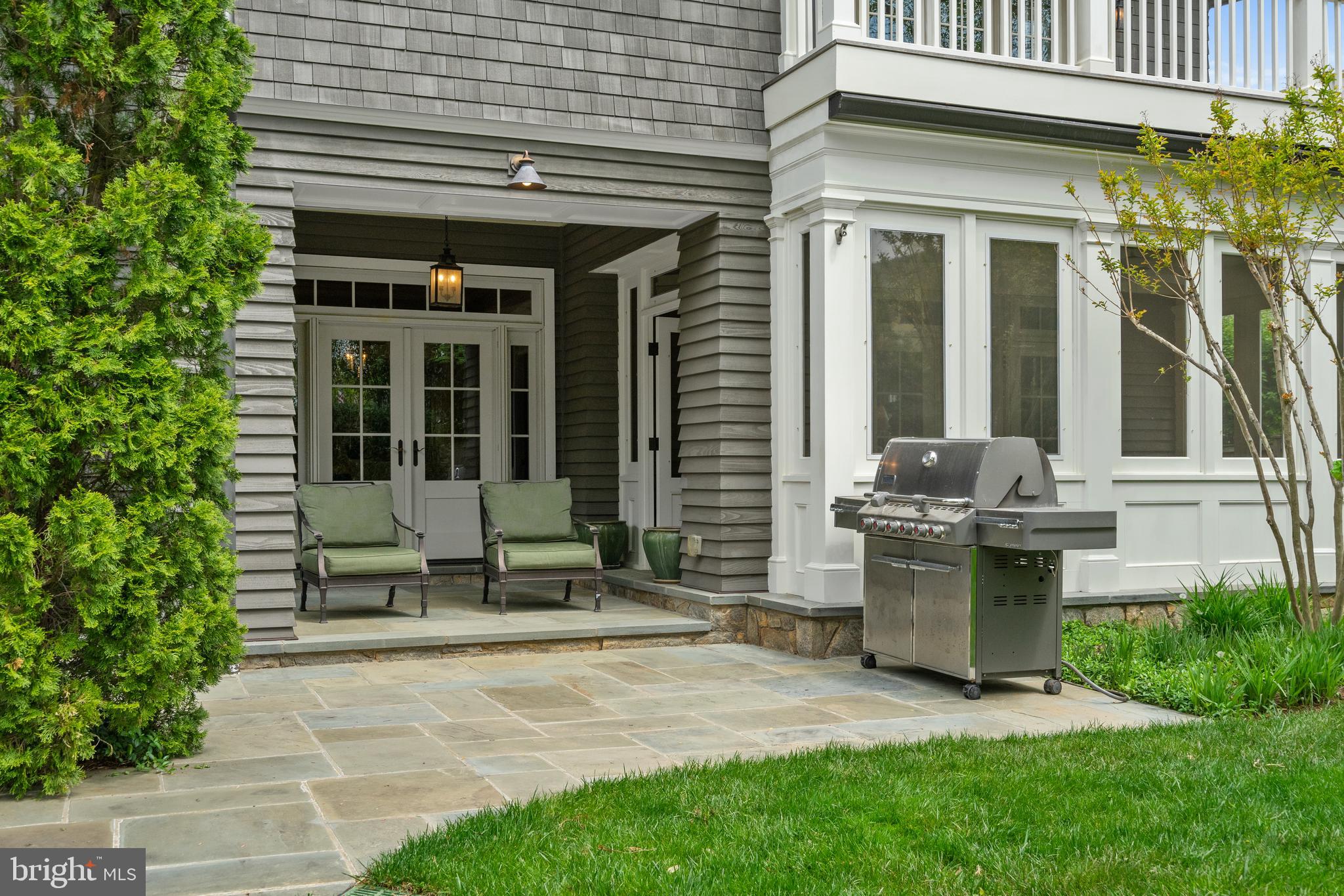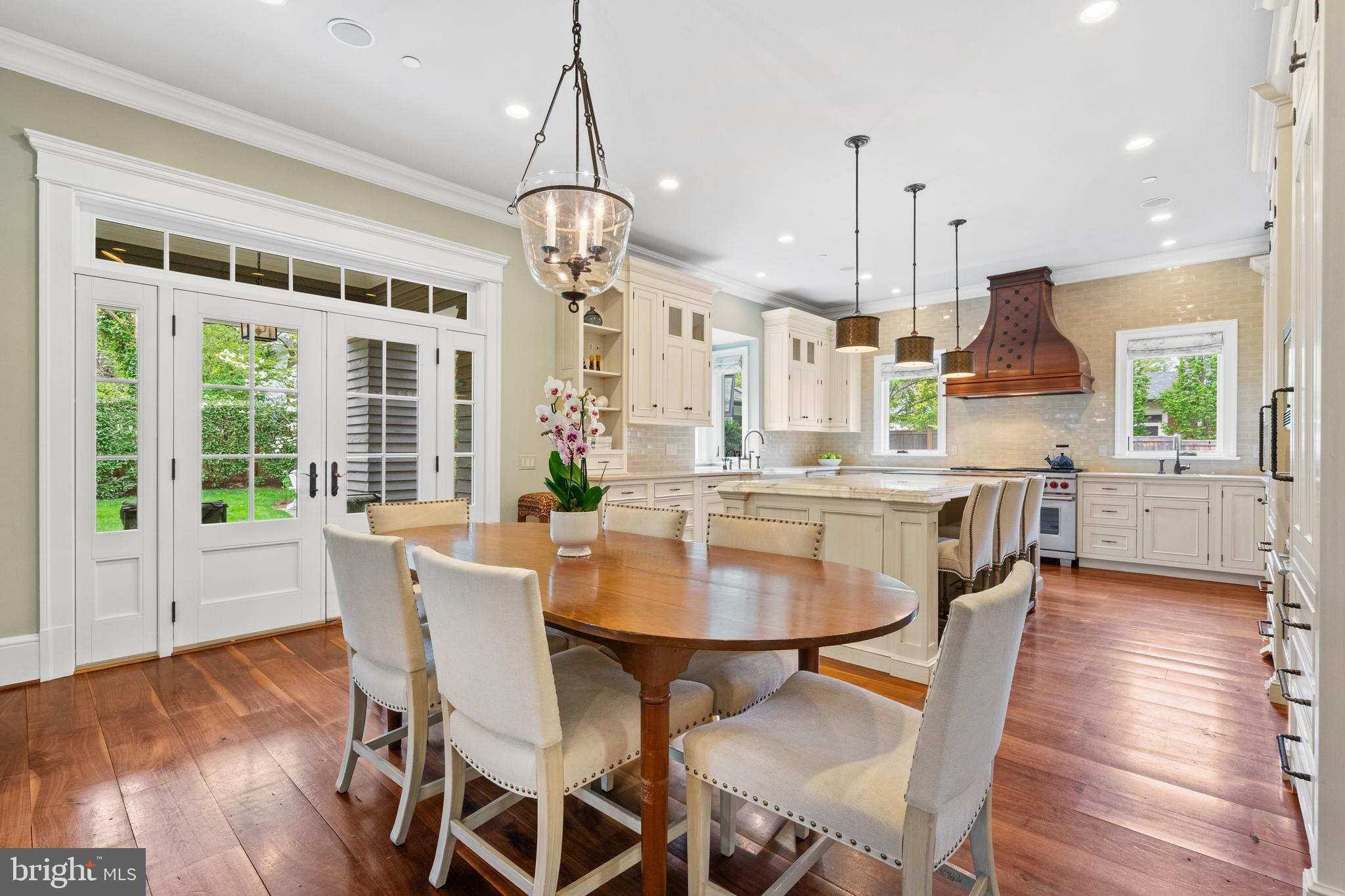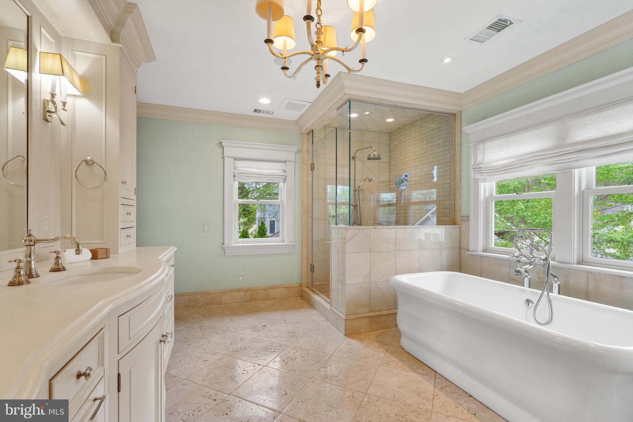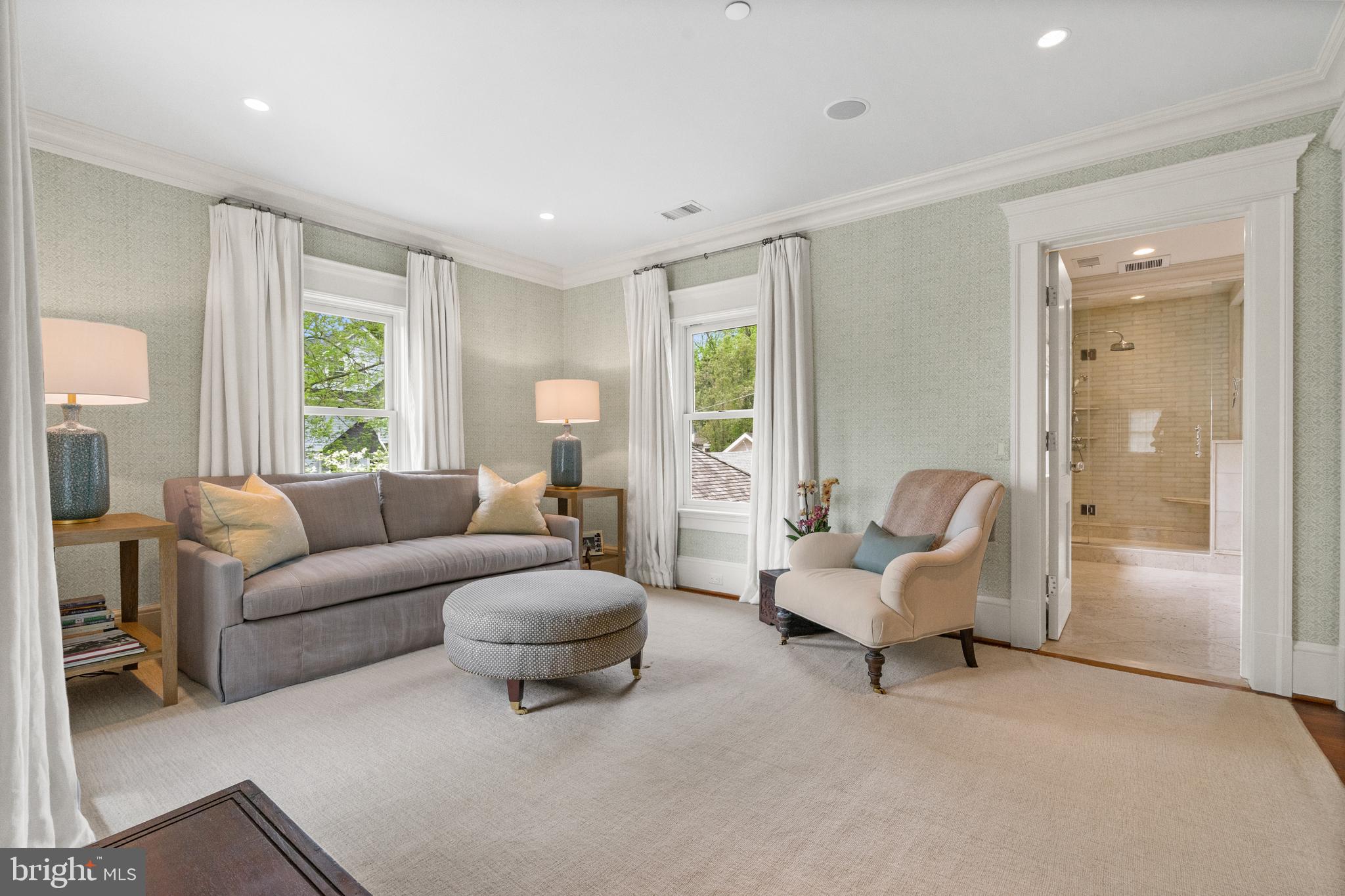 Located within the historic Village of Drummond neighborhood and sited on a flat .36-acre lot, this stunning residence boasts exceptional curb appeal, highlighted by its distinctive turret and an inviting wrap-around front porch. Constructed in 2010 by the renowned Jim Gibson and Sandy Spring Builders, this home spans over 8,000 square feet of meticulously designed and crafted interior living space, marrying timeless elegance with the luxuries of modern-day living. Upon entry, the home greets you with a gracious foyer complemented with inlay wood floors, thick crown moldings, paneled walls, and expansive sightline views through to the rear of the property. The main hall, featuring an oversized coat closet, guides you seamlessly into the generously scaled living areas, each designed with meticulous attention to detail. The home's wood-accented office, complete with French doors, opens to a light-filled living room graced by three large windows. The adjacent dining room has a coffered ceiling and sits conveniently near the butler's pantry, which boasts marble countertops and ample storage, ensuring seamless entertaining. The heart of this home is its well-appointed kitchen, featuring a walk-in pantry, a marble center island with a breakfast bar, high-end appliances, including dual Miele refrigerators and freezers, and a deep farmhouse sink with a window overlooking the lovely rear yard. The kitchen adjoins a sunny breakfast are with exterior access and a spacious family room, anchored by a soaring ceiling and elegant fireplace. Additional main level highlights include a screened porch, mudroom, and powder room. Ascending to the second level, you are greeted by three luxurious bedroom suites, plus the luxurious primary. This sanctuary offers an exceptional walk-in dressing room, a private sitting room, a coffee bar with a mini-fridge, and a balcony with serene views of the rear grounds. The en-suite primary bathroom features dual vanities, a multi-feature shower, and a separate soaking tub. The additional bedroom suites are equally impressive, offering ample sunlight and large closets, alongside a convenient hall laundry room. The third floor presents additional living space with another generous bedroom, bathroom, and extensive storage. The lower level is a haven for entertainment and leisure, featuring a large playroom, temperature-controlled wine cellar, media room with a gas fireplace, gym, an additional bedroom, a full bathroom, and large storage room. Outside, the residence showcases beautifully landscaped gardens, multiple terraces, mature trees, a fire pit area, and an irrigation system, ensuring a picturesque setting for outdoor enjoyment. Security is paramount for this home, with wrought iron fencing and an automatic gate. Also, a detached two-car garage and additional driveway parking accommodate multiple vehicles. This remarkable residence is a testament to unparalleled craftsmanship and design, offering a blend of luxury, comfort, and sophistication in one of the most coveted neighborhoods in Montgomery County. The location is walking distance to parks, trails, Metro, and restaurants and shopping in downtown Bethesda.