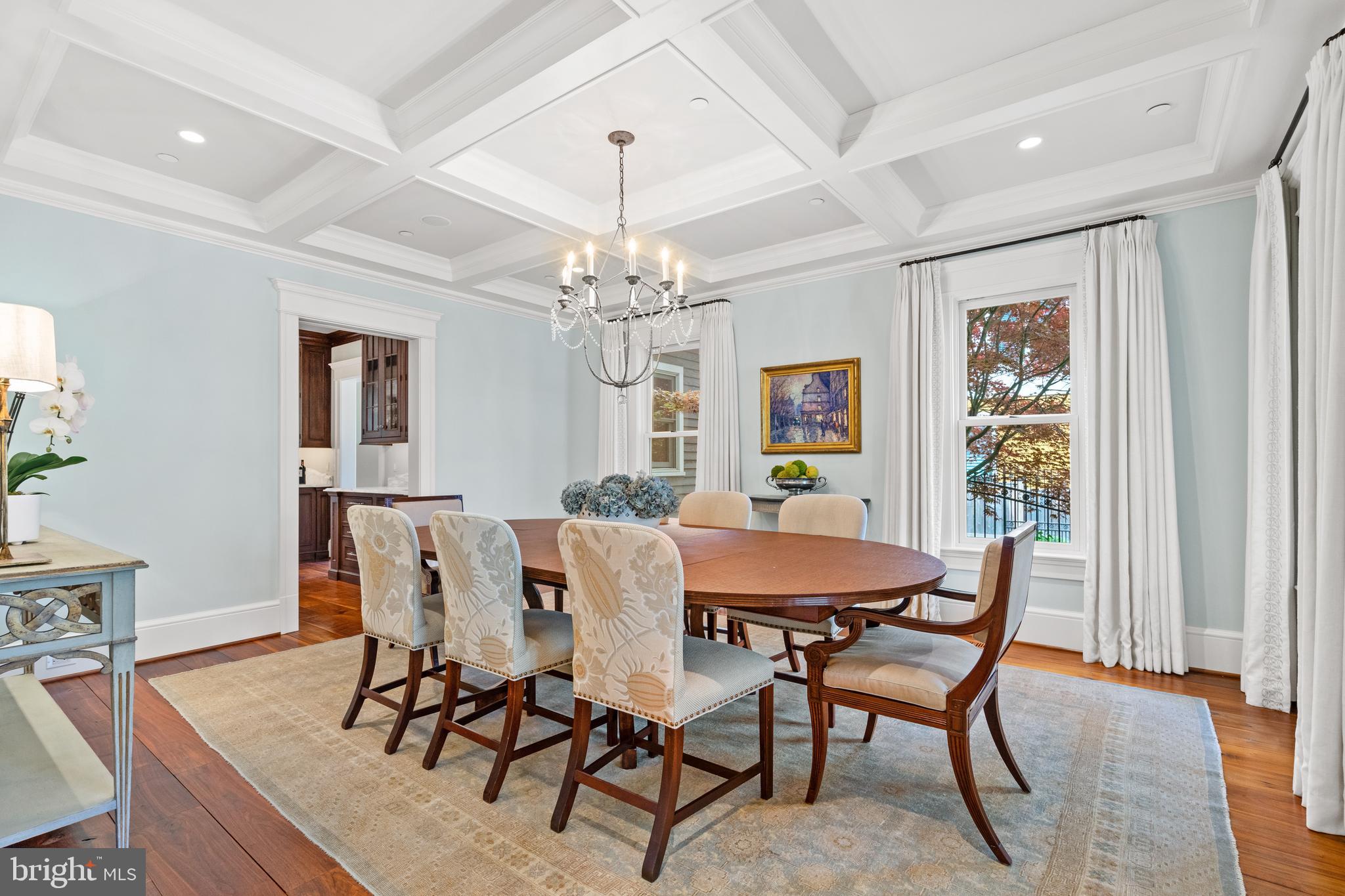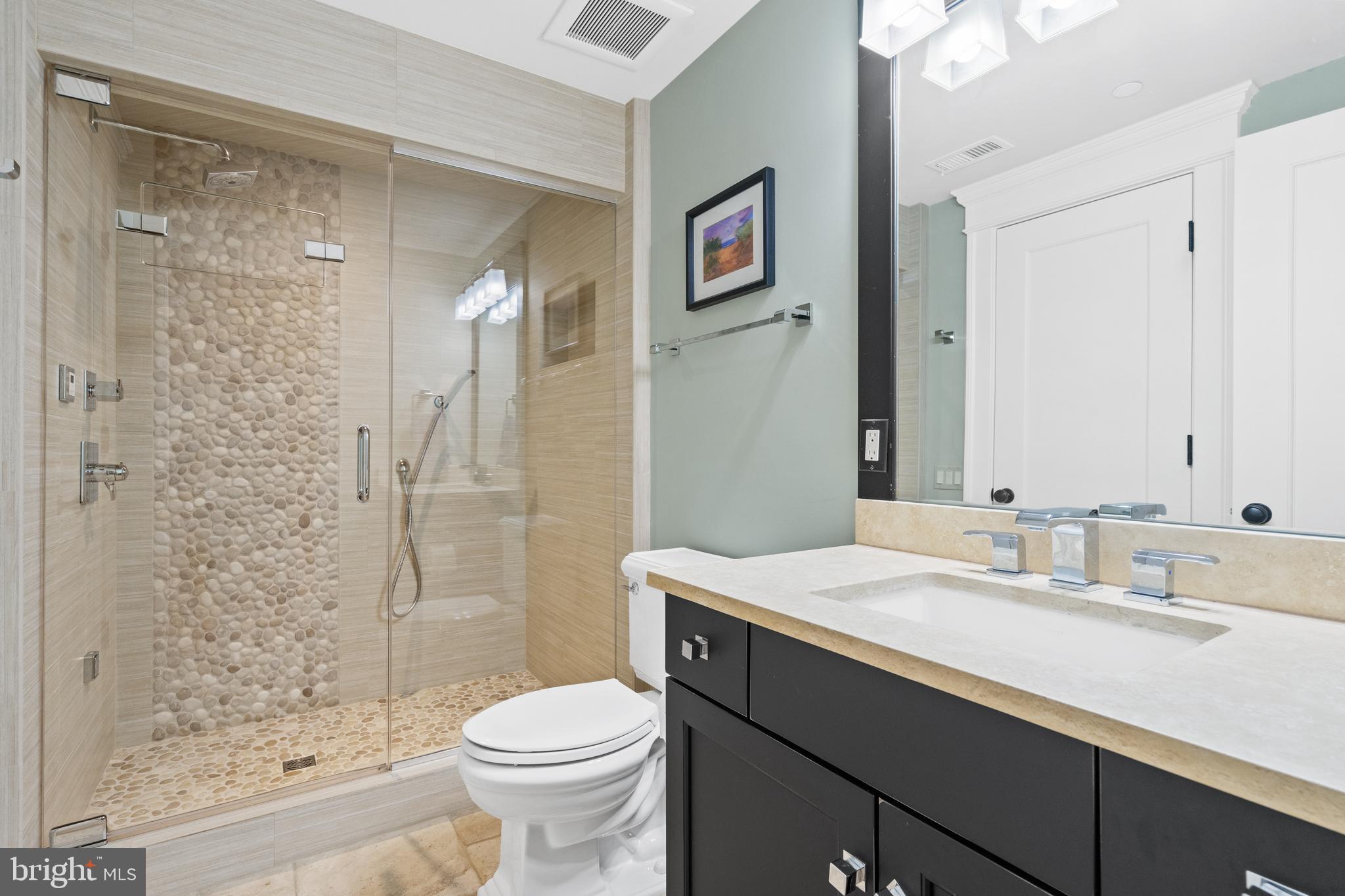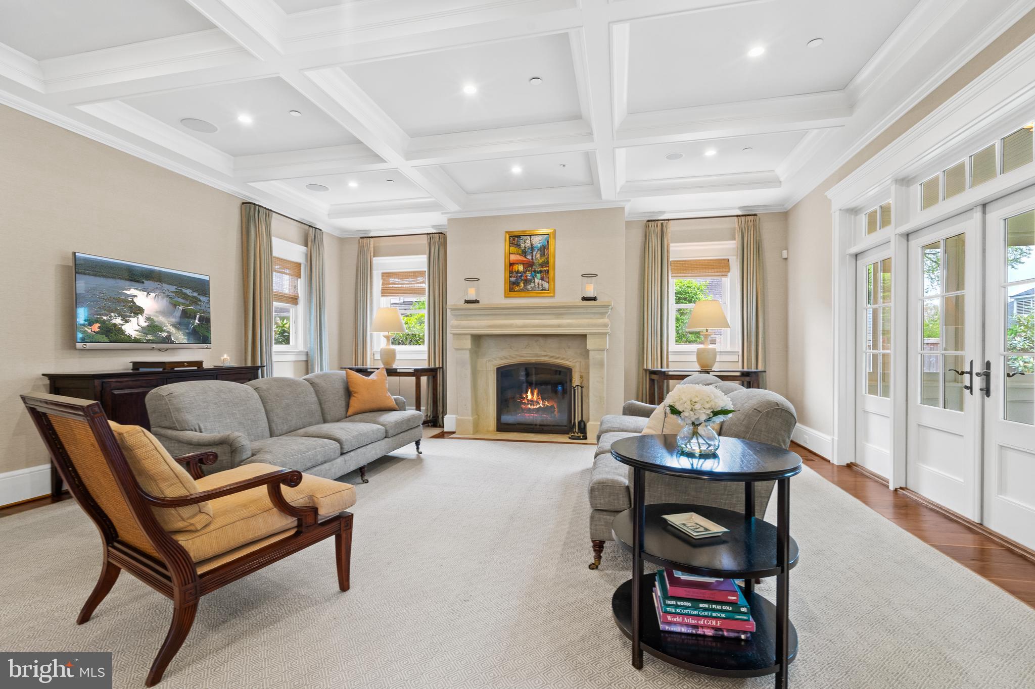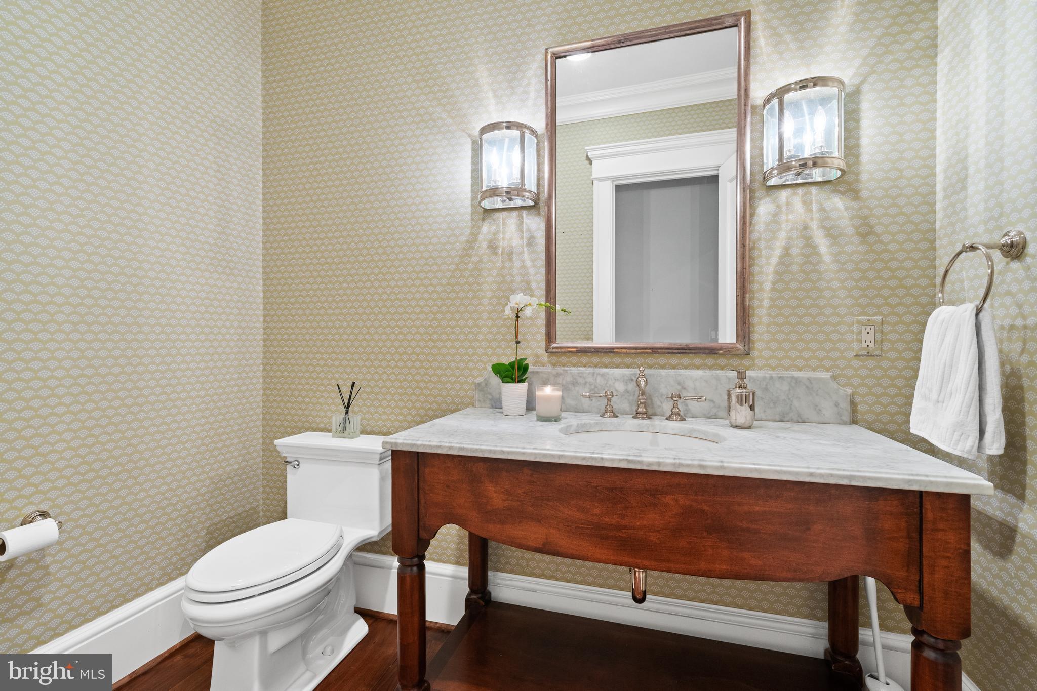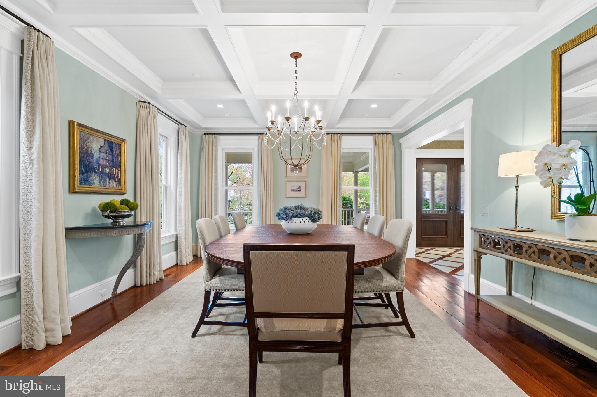 Located within the historic Village of Drummond neighborhood and sited on a flat .36-acre lot, this stunning residence boasts exceptional curb appeal, highlighted by its distinctive turret and an inviting wrap-around front porch. Constructed in 2010 by the renowned Jim Gibson and Sandy Spring Builders, this home spans over 8,000 square feet of meticulously designed and crafted interior living space, marrying timeless elegance with the luxuries of modern-day living. Upon entry, the home greets you with a gracious foyer complemented with inlay wood floors, thick crown moldings, paneled walls, and expansive sightline views through to the rear of the property. The main hall, featuring an oversized coat closet, guides you seamlessly into the generously scaled living areas, each designed with meticulous attention to detail. The home's wood-accented office, complete with French doors, opens to a light-filled living room graced by three large windows. The adjacent dining room has a coffered ceiling and sits conveniently near the butler's pantry, which boasts marble countertops and ample storage, ensuring seamless entertaining. The heart of this home is its well-appointed kitchen, featuring a walk-in pantry, a marble center island with a breakfast bar, high-end appliances, including dual Miele refrigerators and freezers, and a deep farmhouse sink with a window overlooking the lovely rear yard. The kitchen adjoins a sunny breakfast are with exterior access and a spacious family room, anchored by a soaring ceiling and elegant fireplace. Additional main level highlights include a screened porch, mudroom, and powder room. Ascending to the second level, you are greeted by three luxurious bedroom suites, plus the luxurious primary. This sanctuary offers an exceptional walk-in dressing room, a private sitting room, a coffee bar with a mini-fridge, and a balcony with serene views of the rear grounds. The en-suite primary bathroom features dual vanities, a multi-feature shower, and a separate soaking tub. The additional bedroom suites are equally impressive, offering ample sunlight and large closets, alongside a convenient hall laundry room. The third floor presents additional living space with another generous bedroom, bathroom, and extensive storage. The lower level is a haven for entertainment and leisure, featuring a large playroom, temperature-controlled wine cellar, media room with a gas fireplace, gym, an additional bedroom, a full bathroom, and large storage room. Outside, the residence showcases beautifully landscaped gardens, multiple terraces, mature trees, a fire pit area, and an irrigation system, ensuring a picturesque setting for outdoor enjoyment. Security is paramount for this home, with wrought iron fencing and an automatic gate. Also, a detached two-car garage and additional driveway parking accommodate multiple vehicles. This remarkable residence is a testament to unparalleled craftsmanship and design, offering a blend of luxury, comfort, and sophistication in one of the most coveted neighborhoods in Montgomery County. The location is walking distance to parks, trails, Metro, and restaurants and shopping in downtown Bethesda.